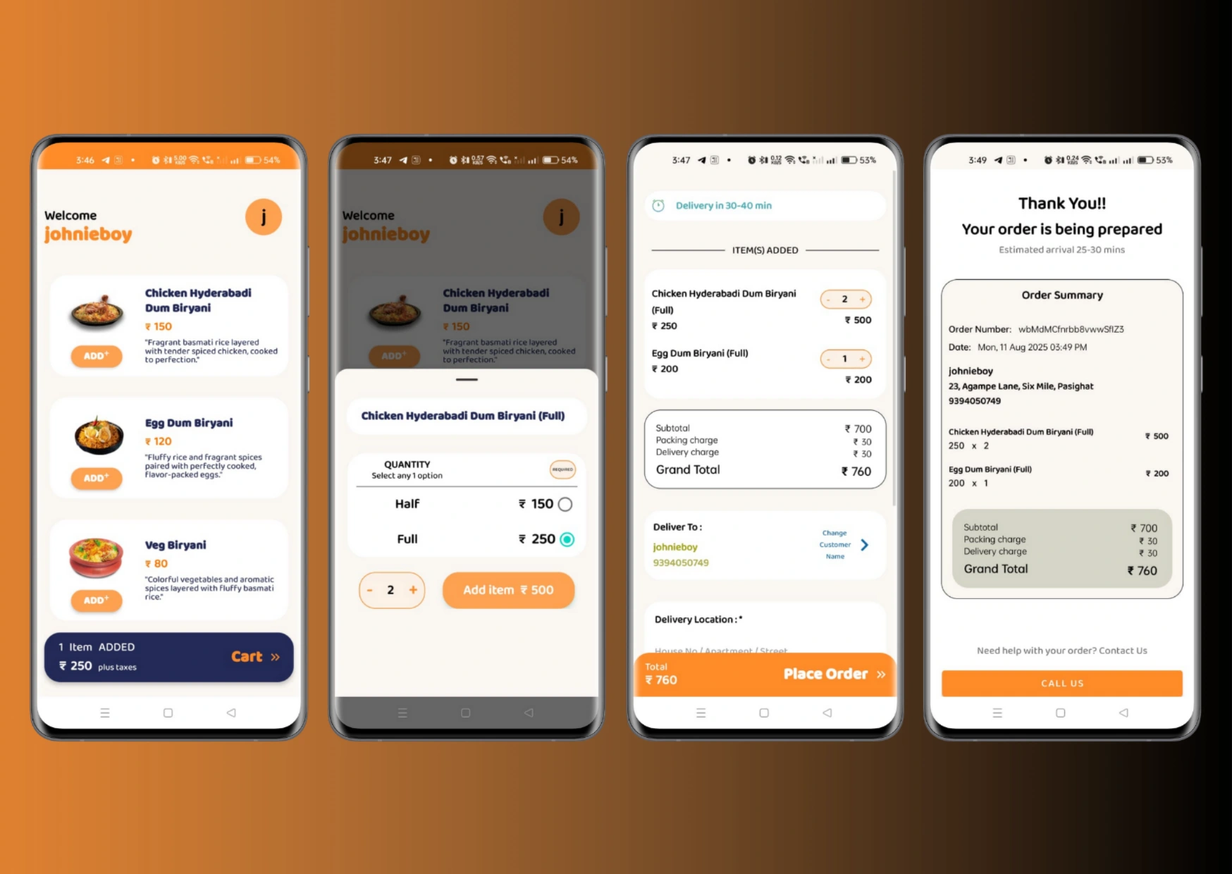 A single-restaurant food delivery application crafted for a local eatery that wanted to bring their signature biryani experience straight to customers’ phones. The focus? Make ordering biryani as effortless and satisfying as eating it — and we delivered.