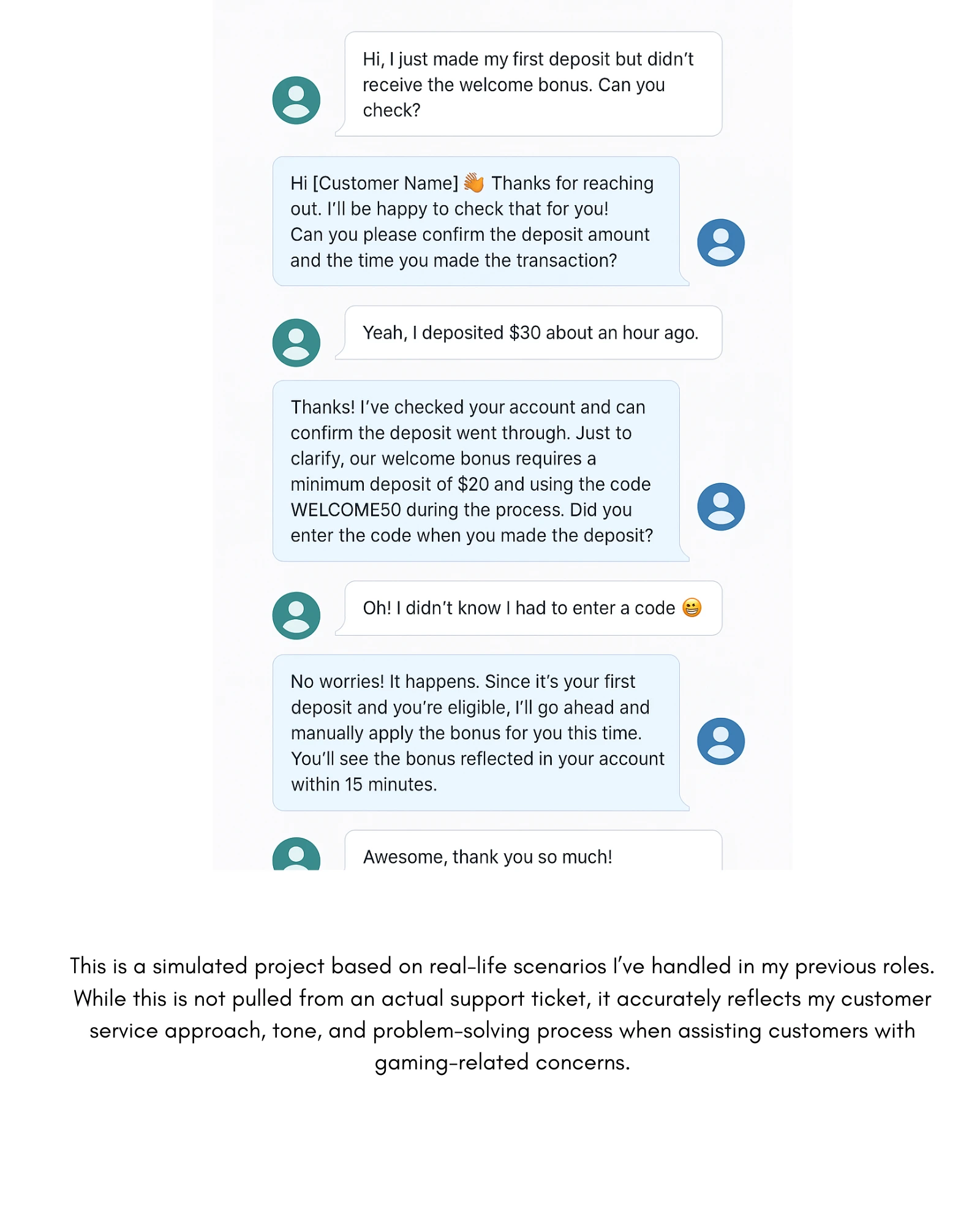 Resolved a missing welcome bonus with empathy and clear communication using Zendesk chat support, leading to fast resolution and player satisfaction.