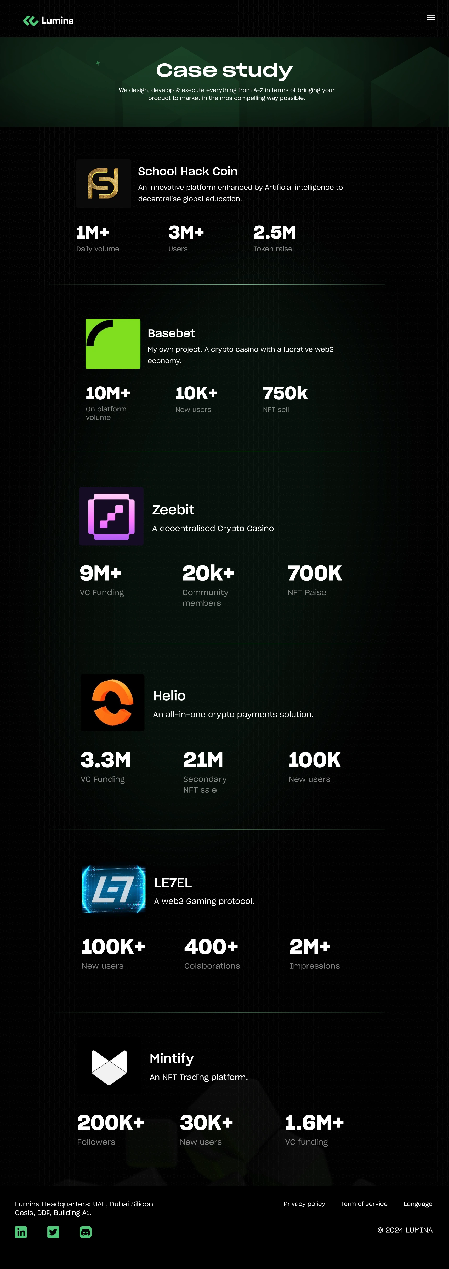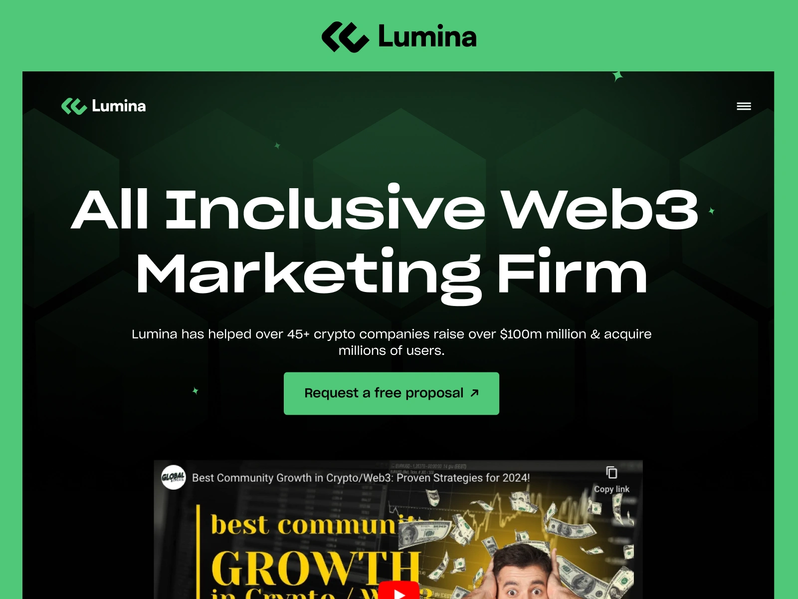 Lumina is a Web3 marketing agency helping blockchain projects, NFT brands, and decentralized platforms grow through community-driven strategies, creative storytelling, and data-backed campaigns. We connect innovative Web3 products with the right audiences to drive adoption and engagement.