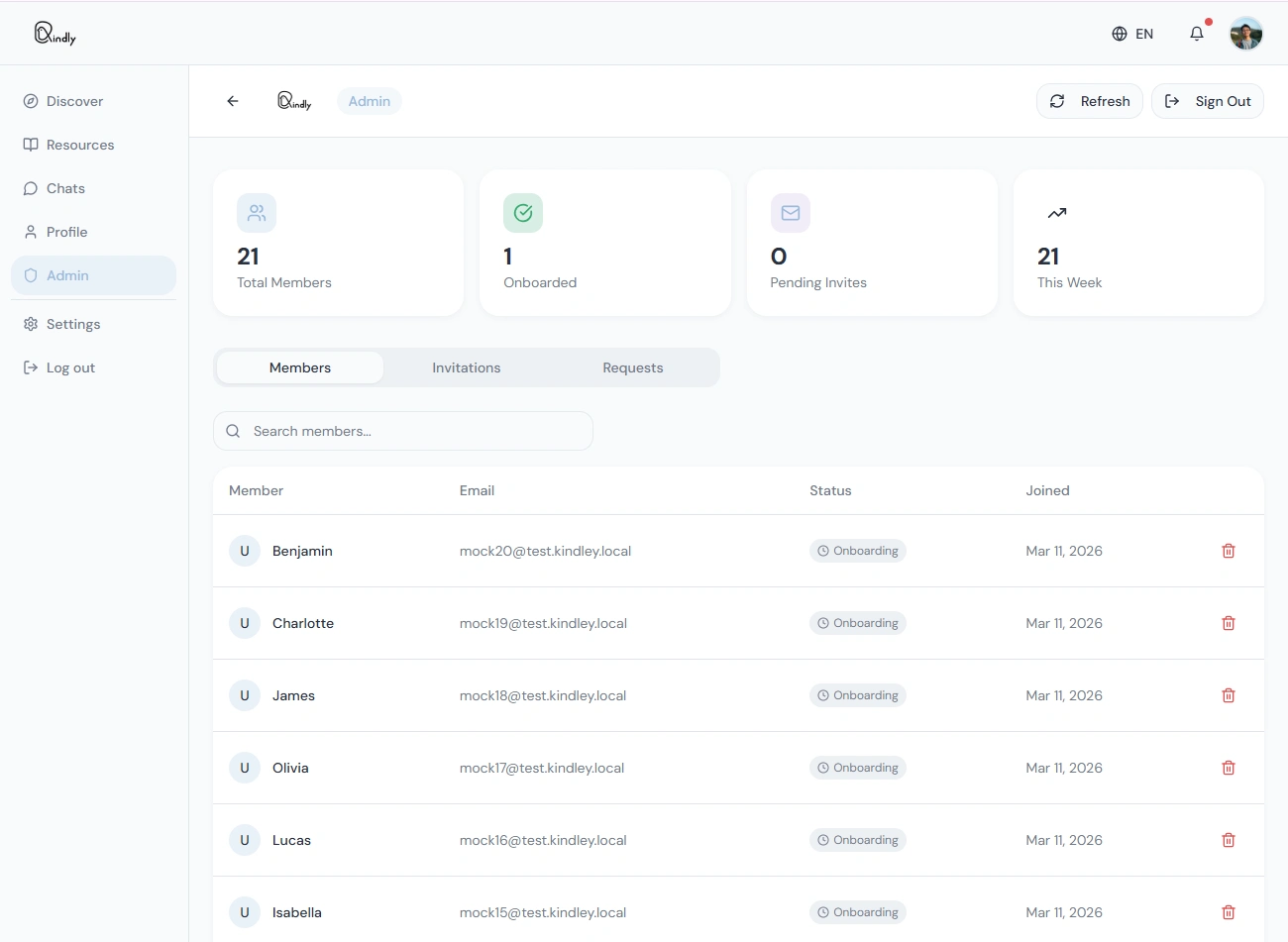 Admin dashboard: member management, create/revoke invitations, invitation requests, user deletion via Supabase Auth Admin API.