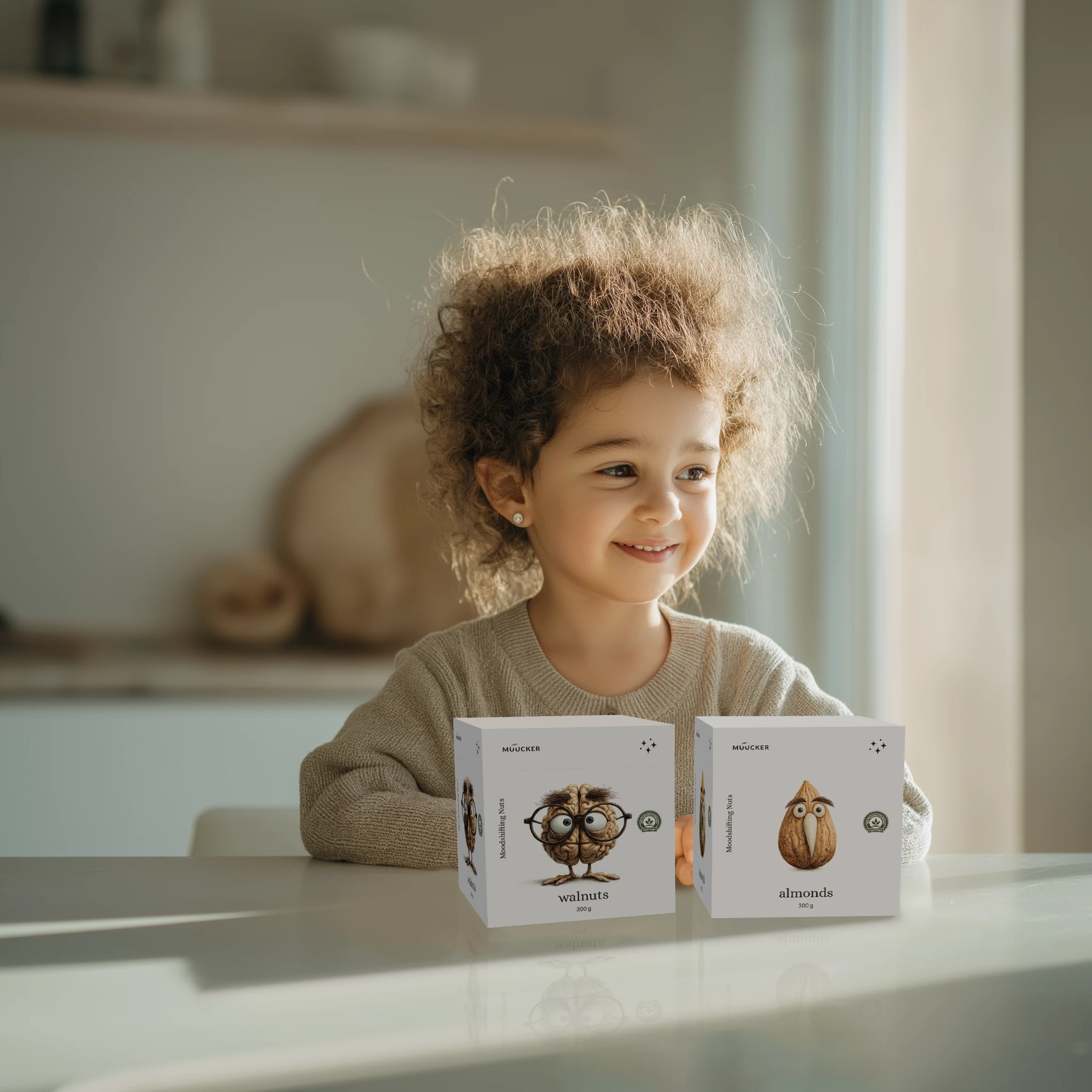 The boxes are minimal in form yet full of character. Their clean, white surfaces make the illustrated nuts the main focus, while the sturdy construction allows the packaging to double as a toy box for children — prolonging its life and encouraging creative reuse.