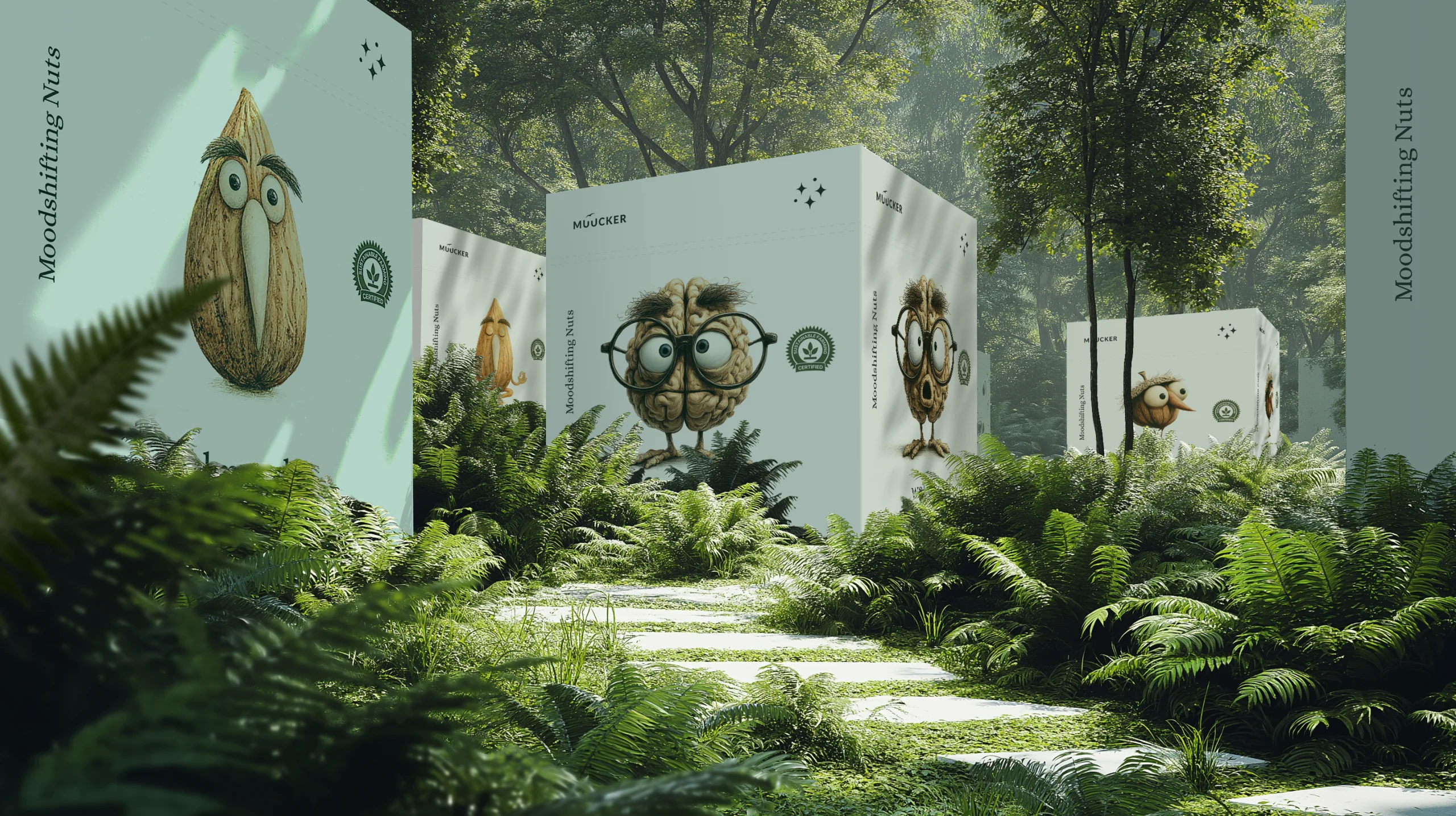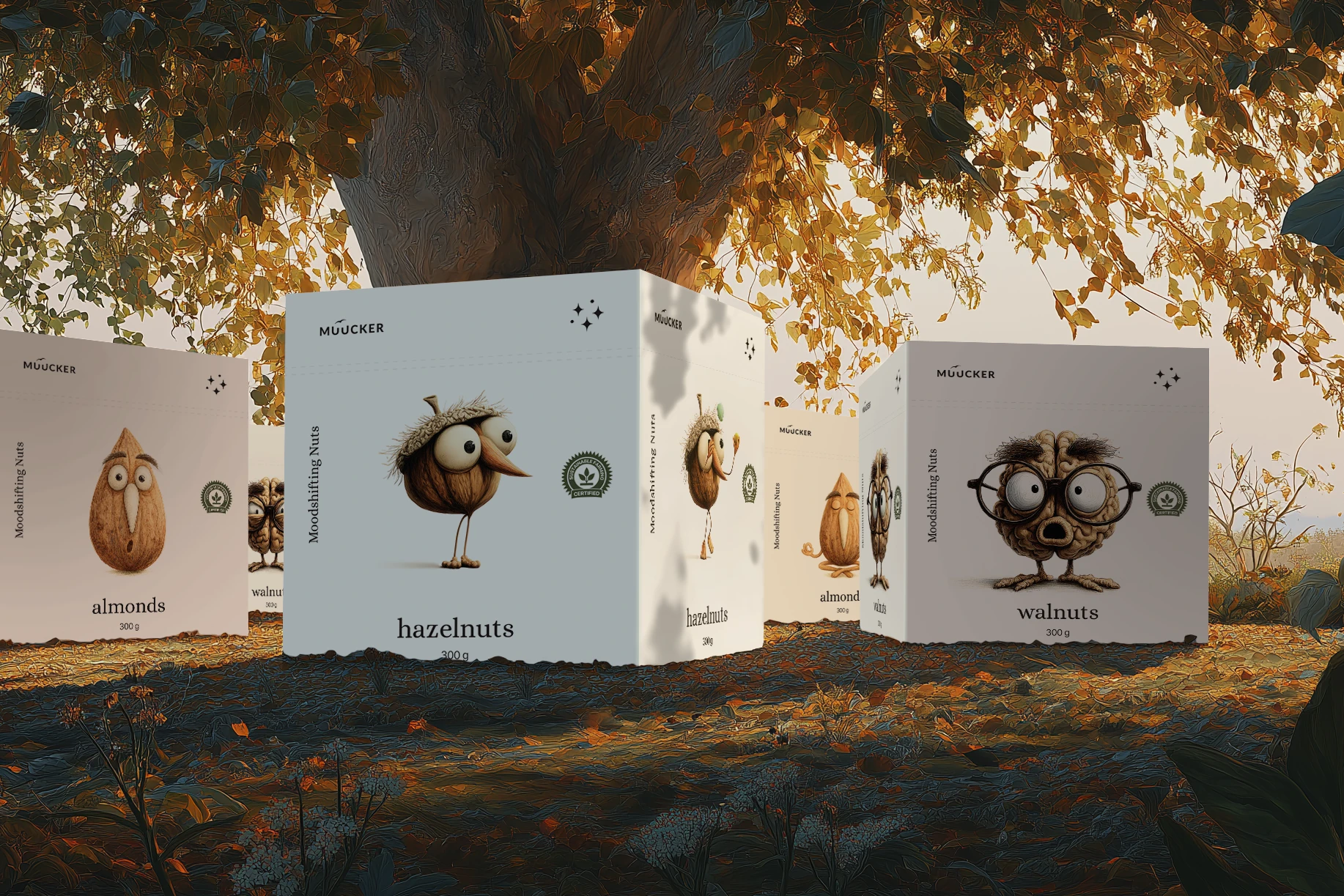 The characters on the boxes — expressive almonds, quirky walnuts, and curious hazelnuts — personify the “mood-shifting” idea behind the brand. Every nut has its own personality and emotion, turning a simple snack into a small story.