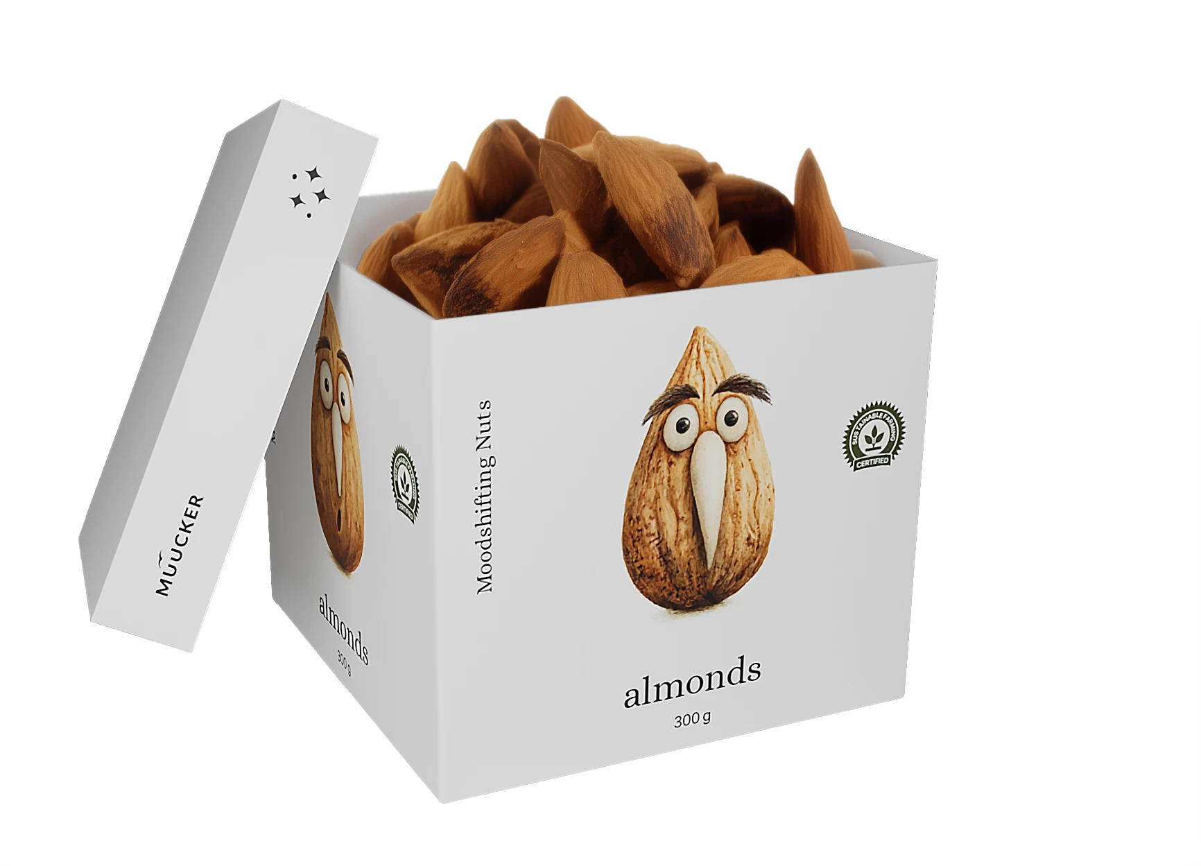 Simplicity and creativity — that’s the essence of the Moodshifting Nuts packaging line created for Mü̈cker. Each package is made of thick, eco-friendly paper and designed to be both functional and playful.