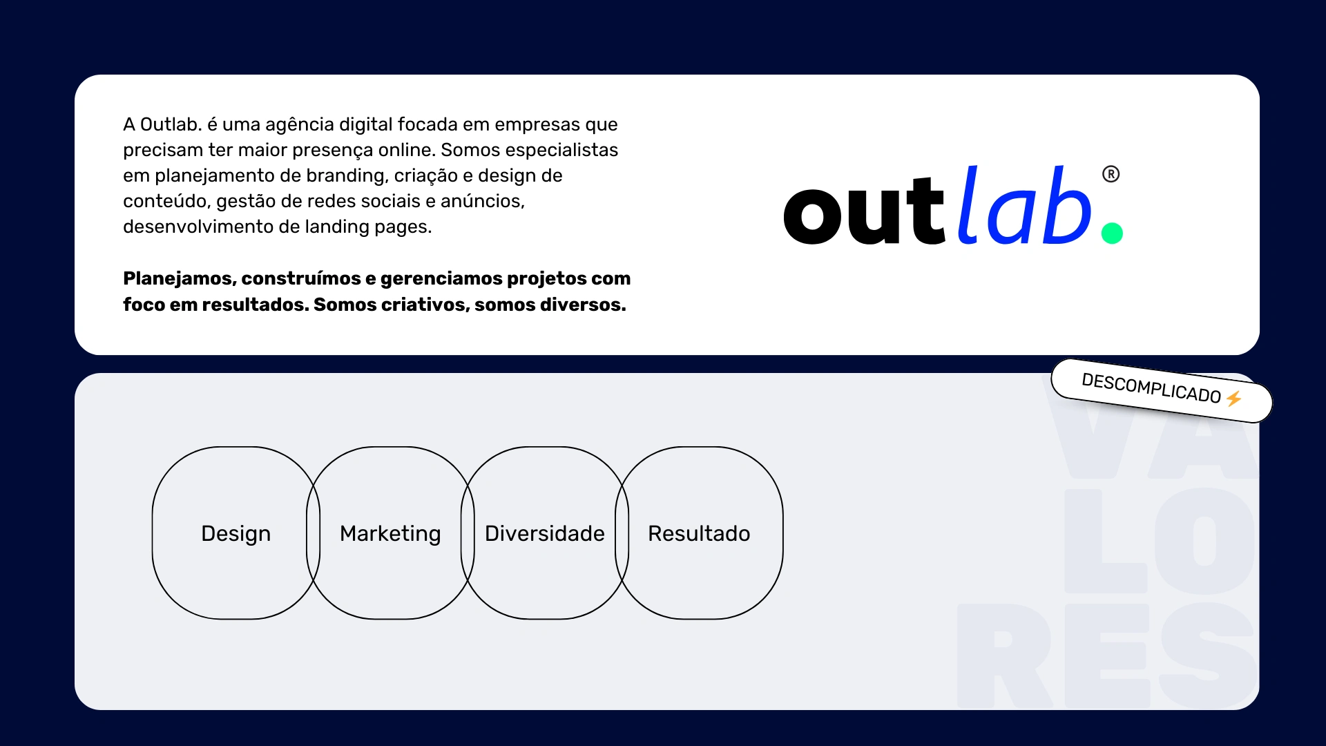 A Outlab. é uma agência digital focada em empresas que precisam ter maior presença online. Somos especialistas em planejamento de branding, criação e design de…