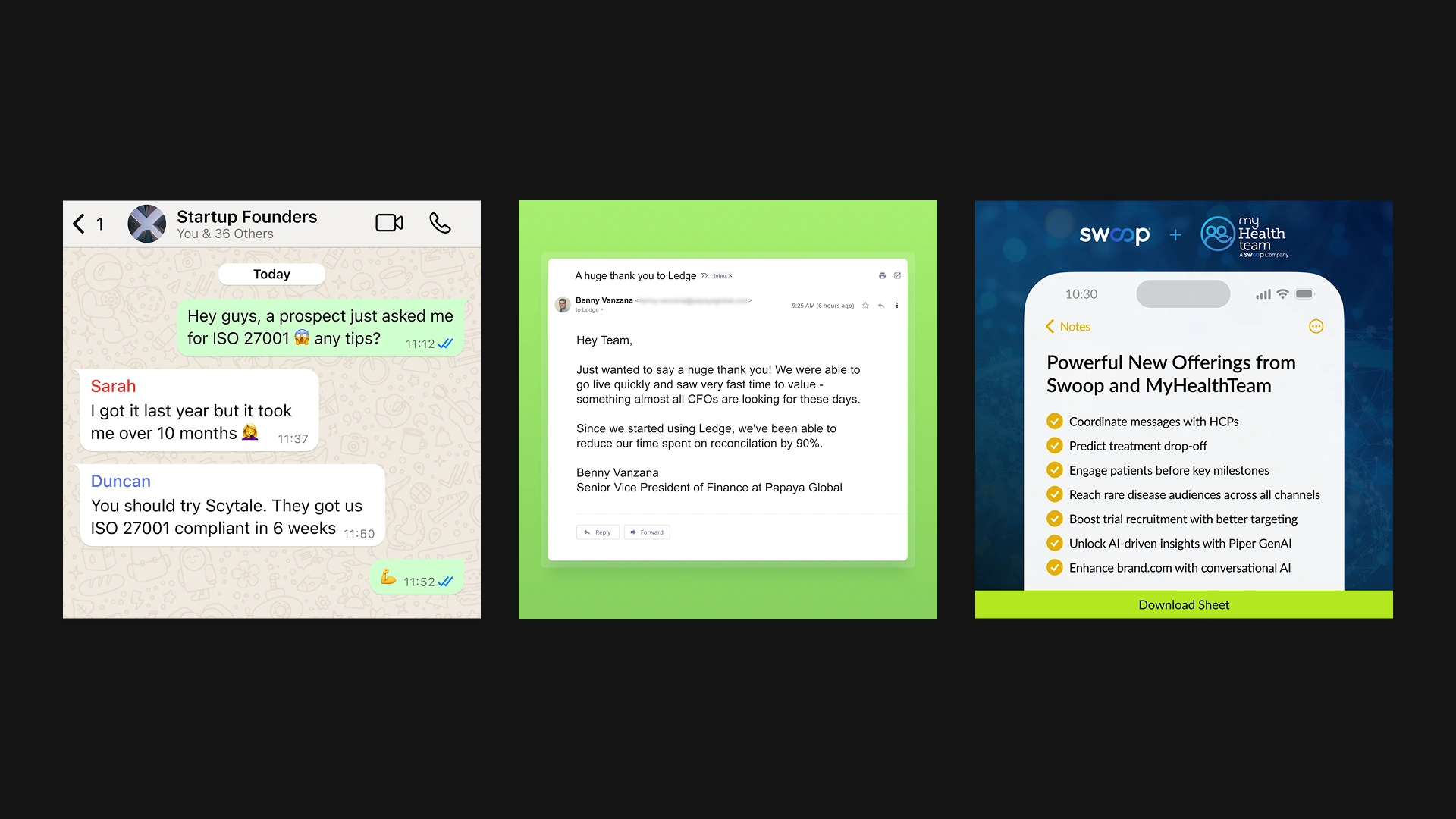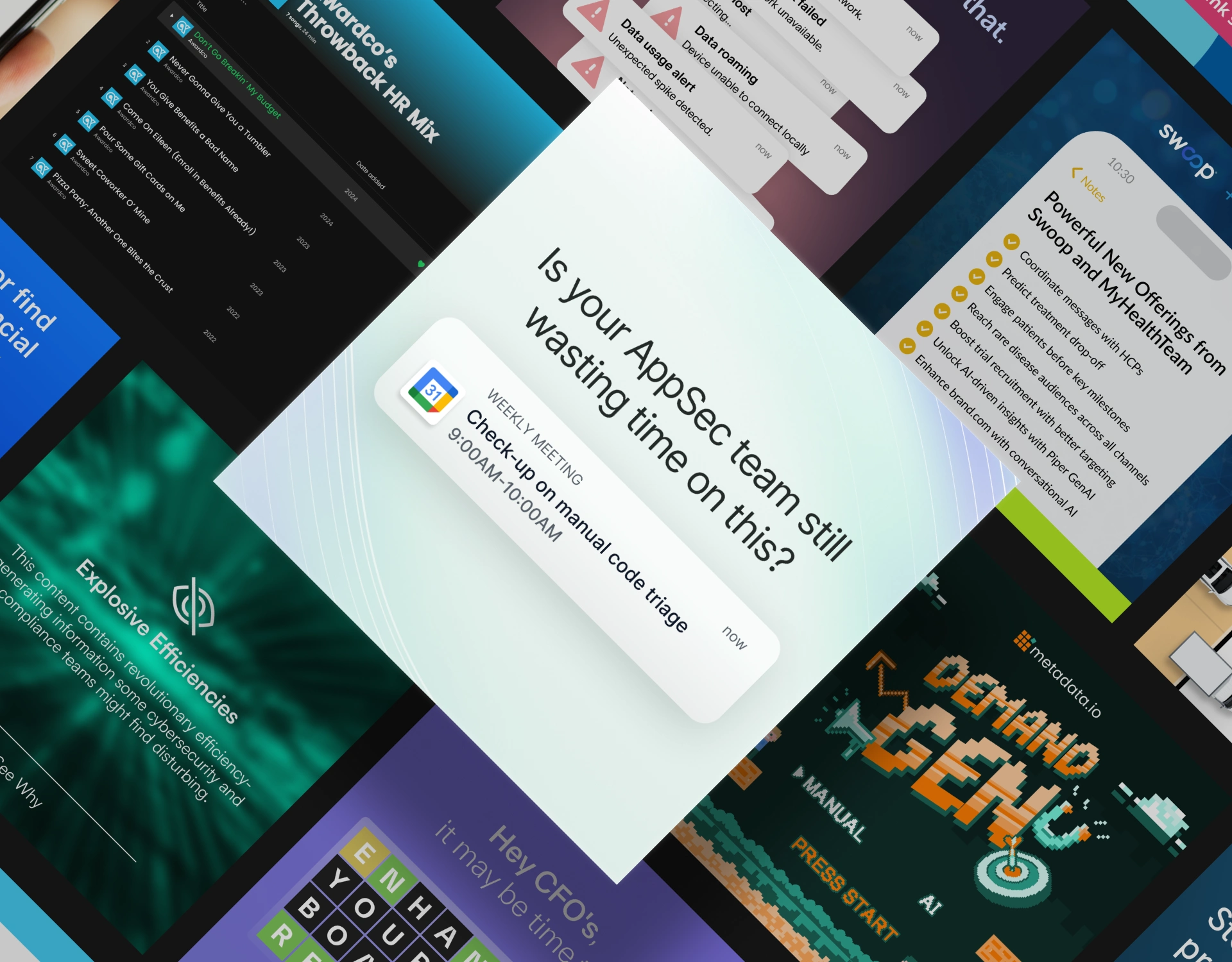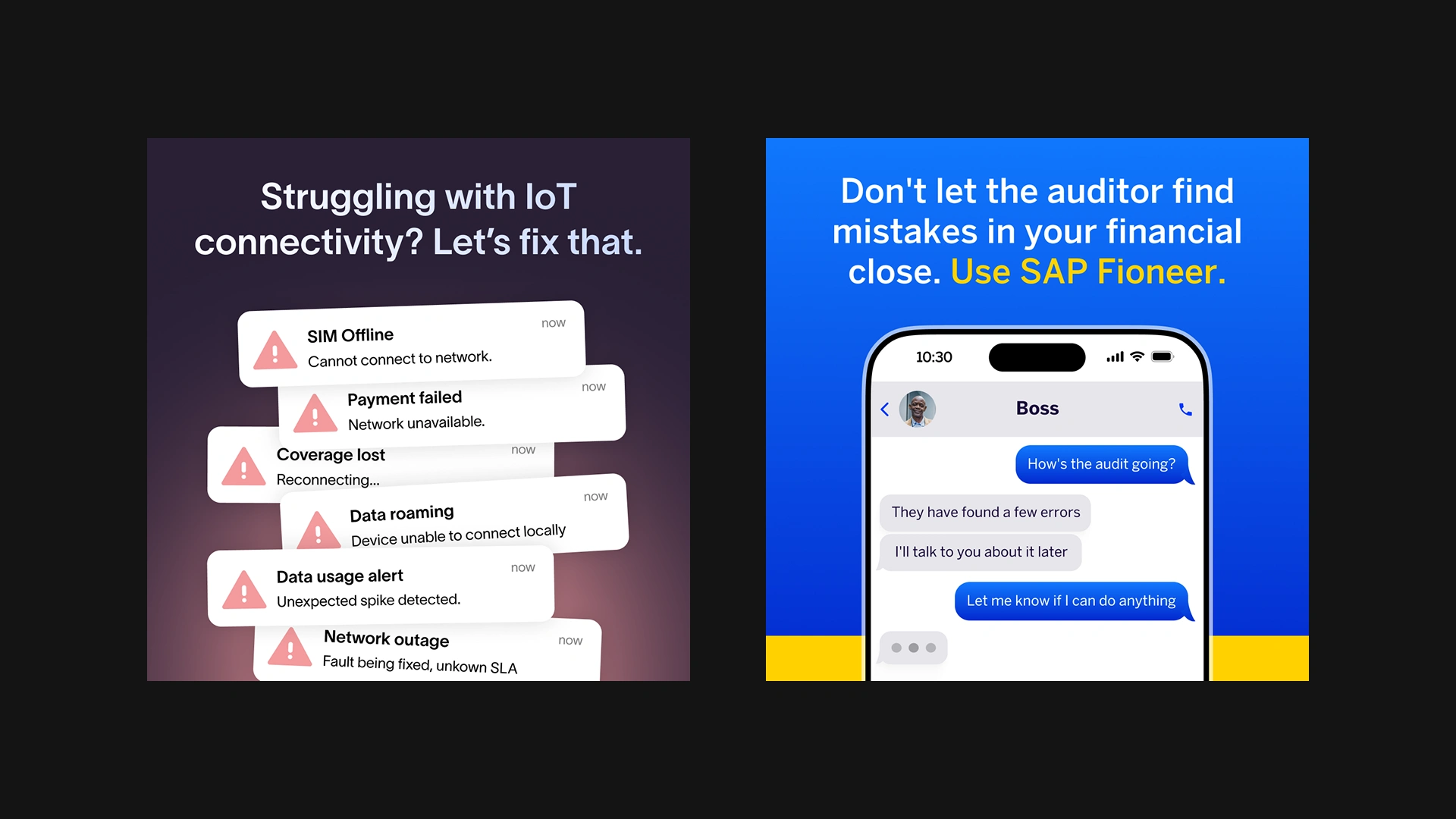 Simulated UI ads for B2B SaaS. Familiar interface elements are utilized to visualize technical features and drive clicks using recognizable design cues.