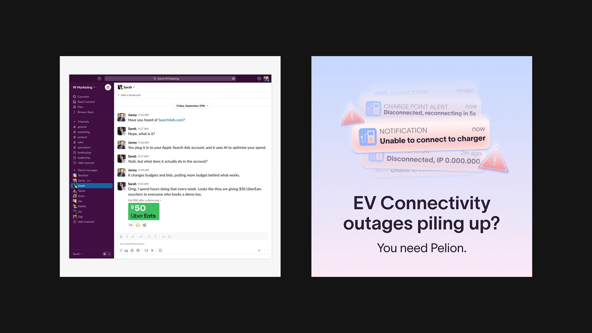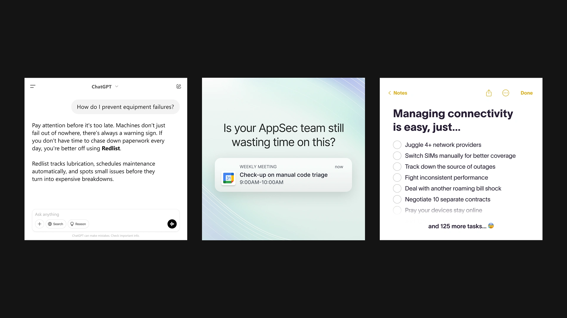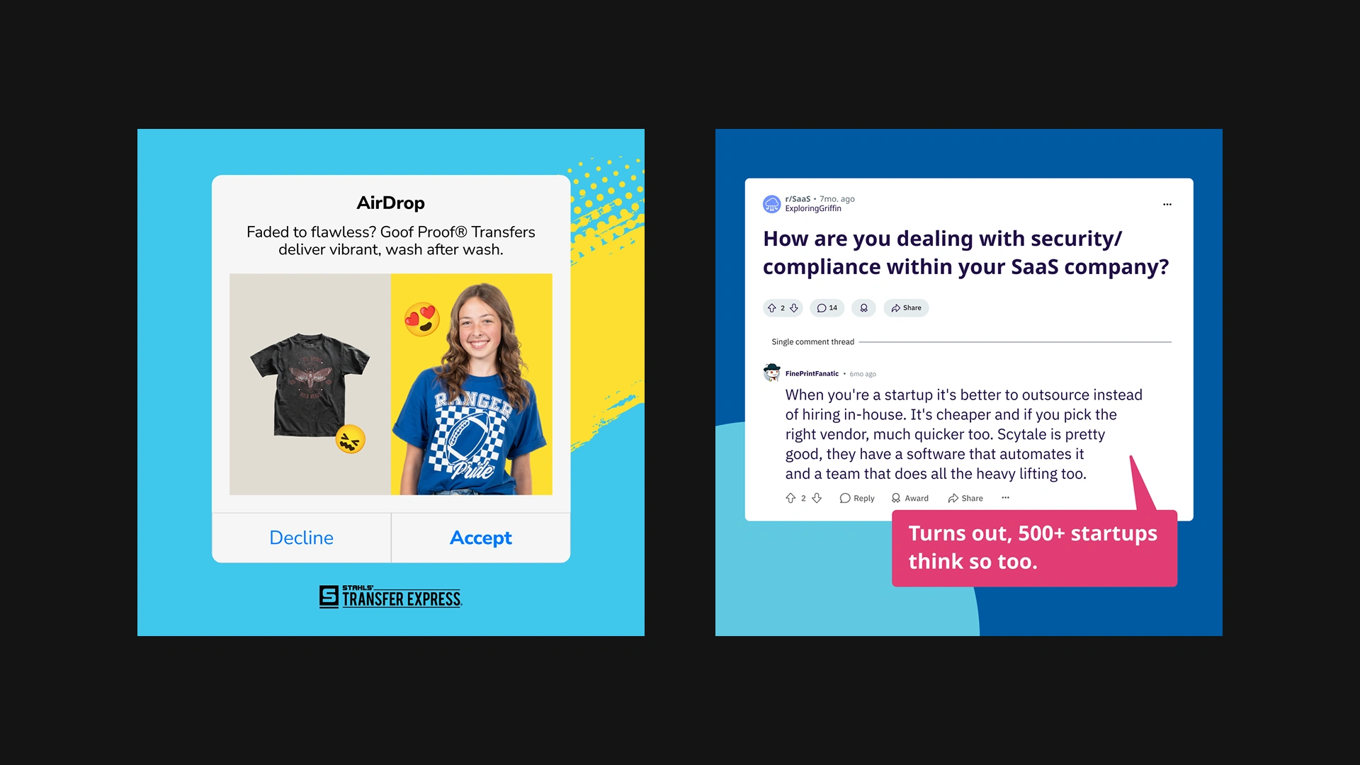 Simulated UI ads for B2B SaaS. Familiar interface elements are utilized to visualize technical features and drive clicks using recognizable design cues.