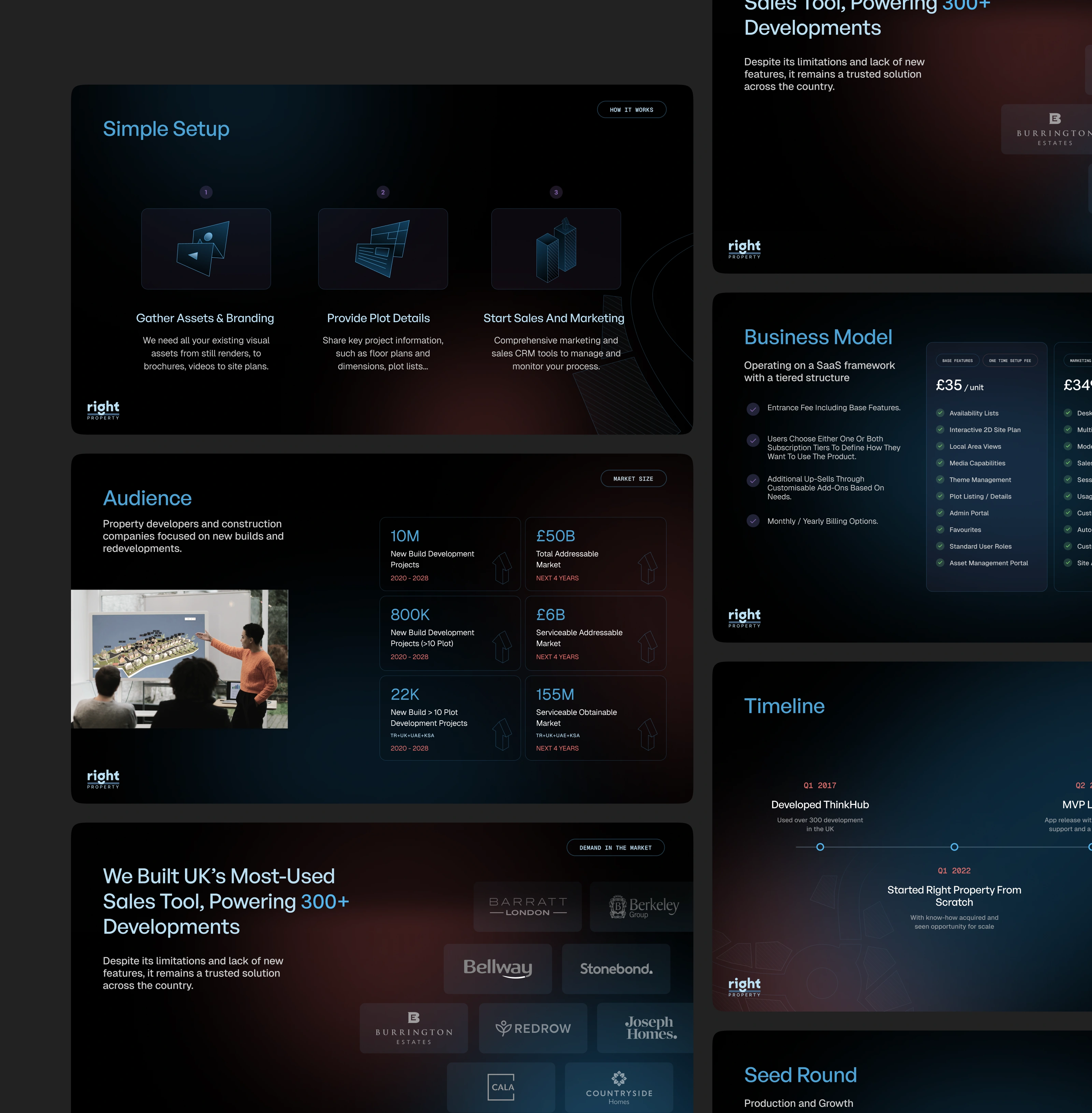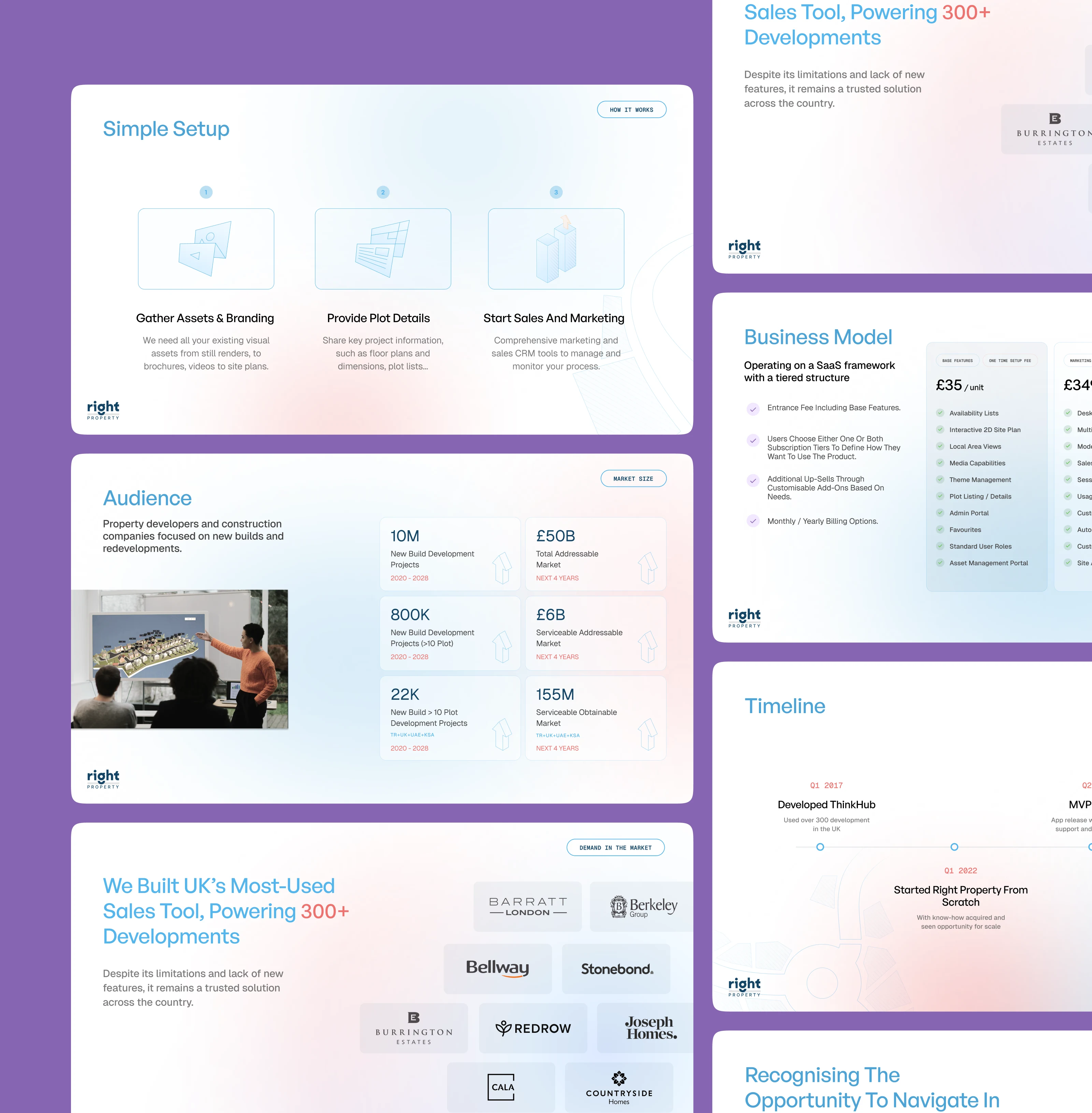 To support Right Property’s sales and investor conversations, a scalable presentation design system was created. The deck translates the brand’s visual identity into clear, high-impact slides that communicate the product vision, platform capabilities, and business value — helping teams present complex ideas with clarity, confidence, and visual consistency.