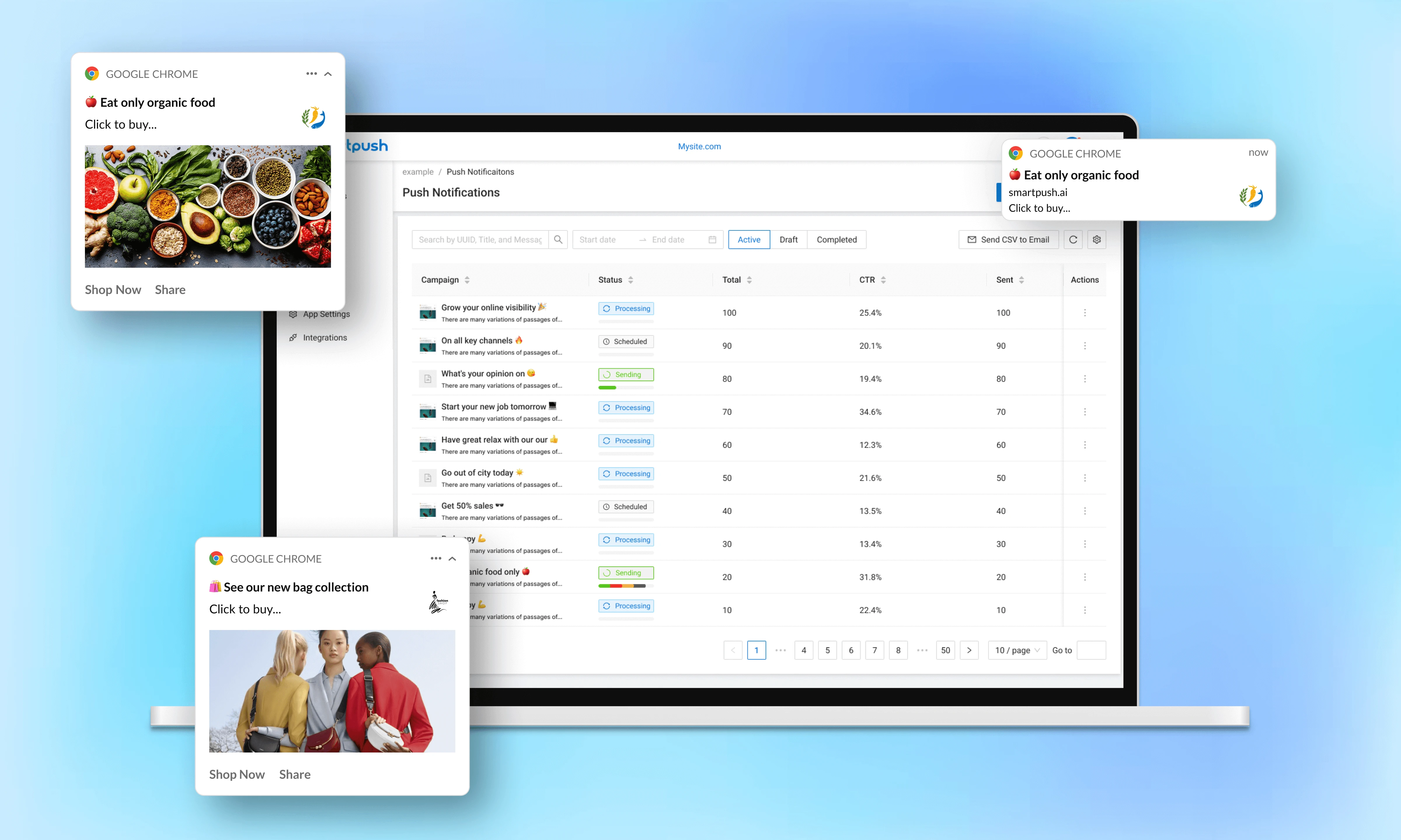 I redesigned the dashboard to help users easily track and manage their push campaigns. The updated version includes real-time status indicators, CTR performance metrics, campaign stage filters (Active, Draft, Completed), and quick actions like CSV export, making campaign management faster, clearer, and more efficient.