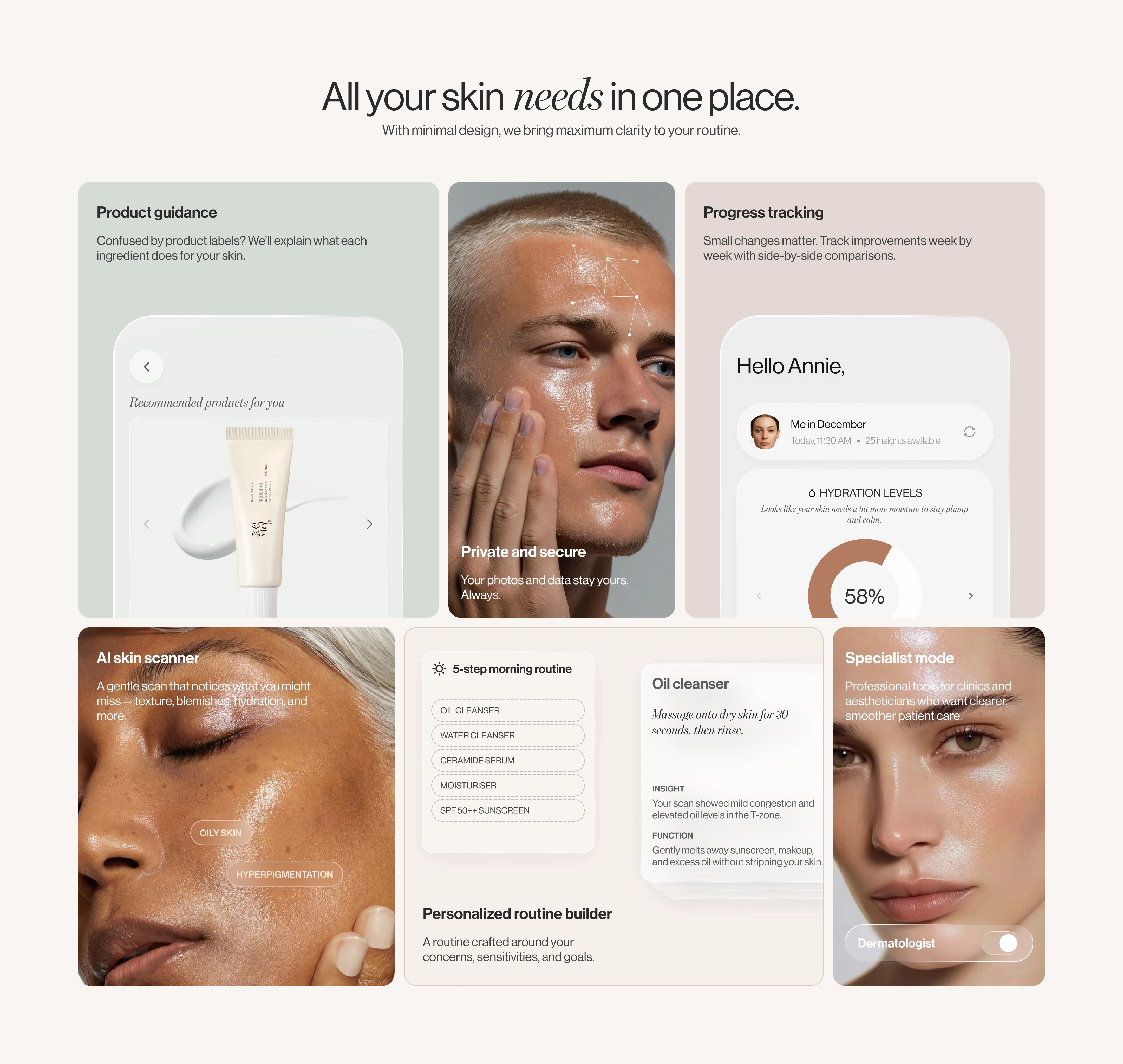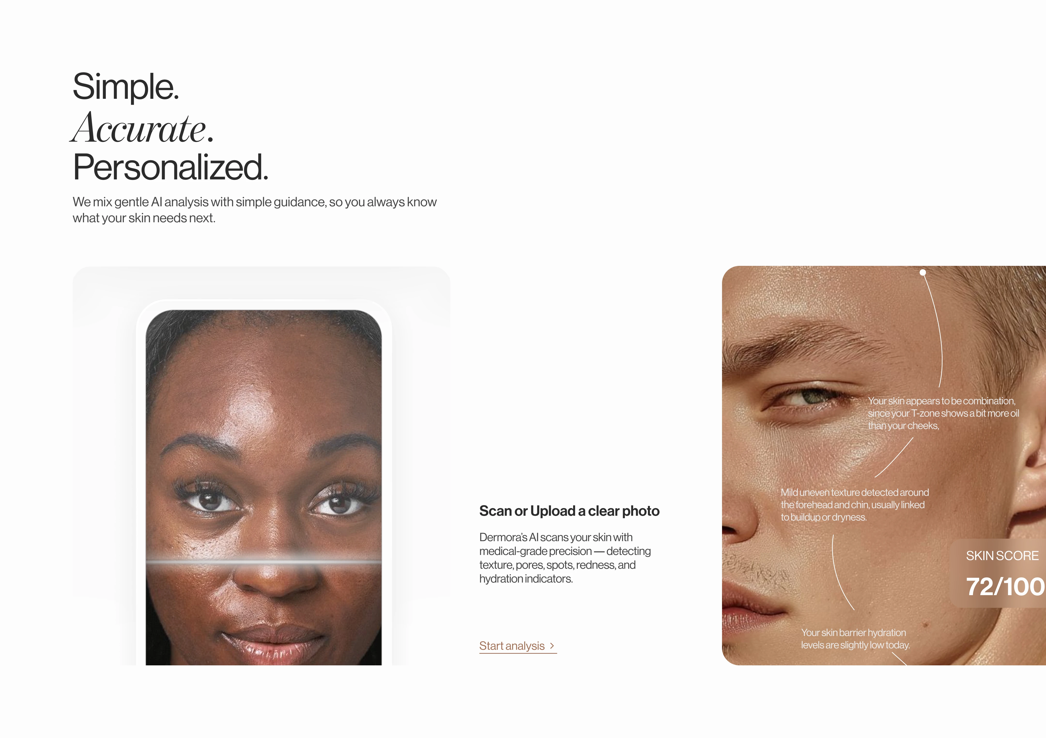 In designing the landing page, the focus was on keeping everything modern and minimal, with soft visuals, human-centered copy, and clear calls to action that guide users without overwhelming them. The result is a warm, trustworthy experience that shows how technology can support better skin decisions without feeling complicated or clinical.