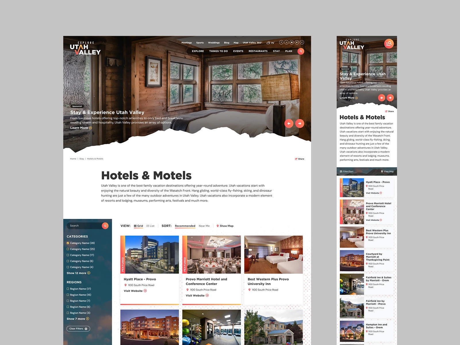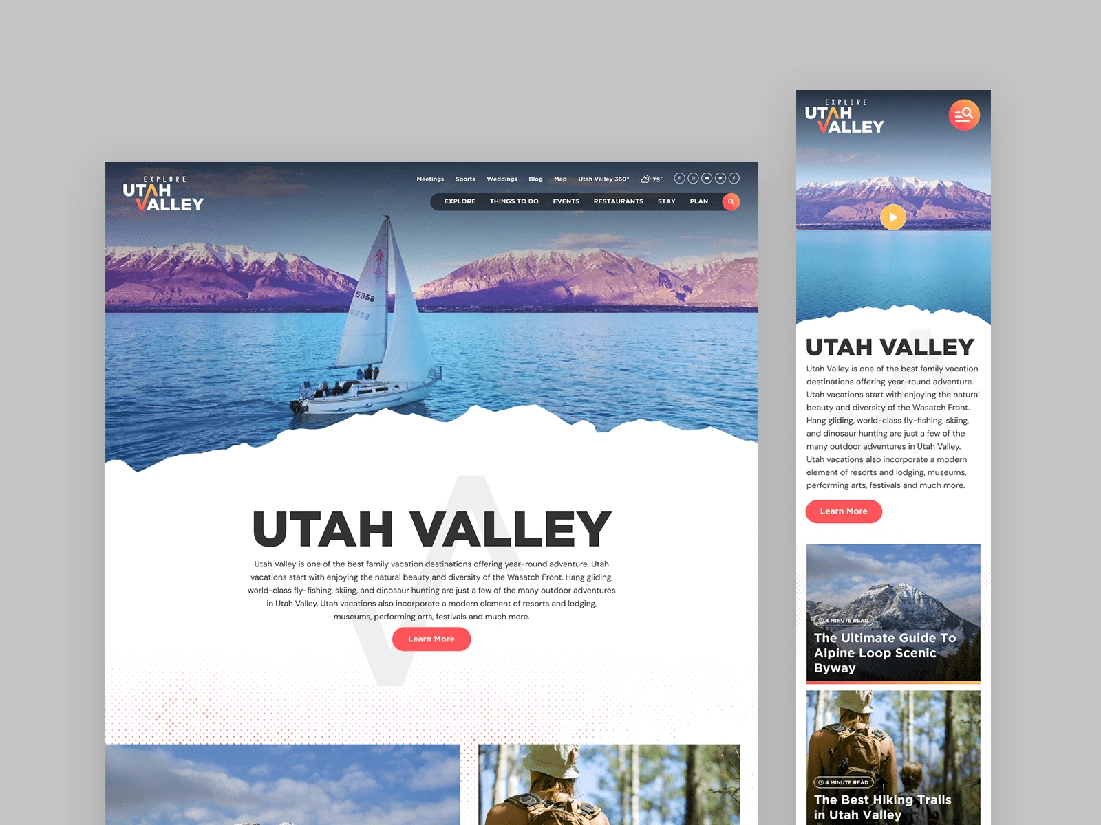 To capture the essence of Utah Valley, I incorporated the outline of a recognizable mountain range, giving the hero image a distinctive shape. The client's vibrant color palette and gradients were key elements, and I explored creative ways to use them subtly, ensuring they remained dynamic without feeling overpowering. I also restructured the header for a more intuitive and user-friendly navigation experience. Additionally, I designed several sections that blend illustration, texture, and photography, allowing the site to highlight both urban and outdoor experiences.