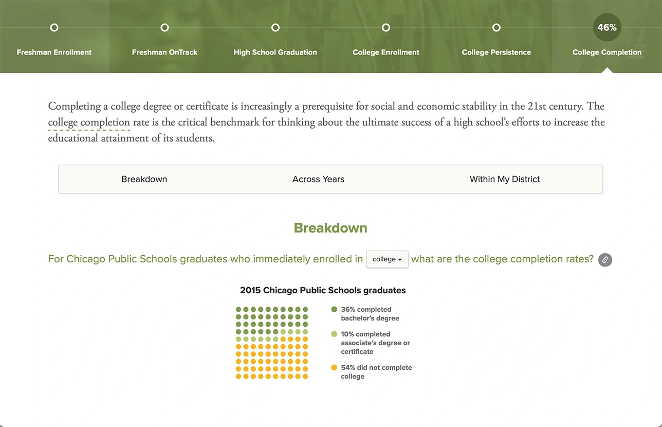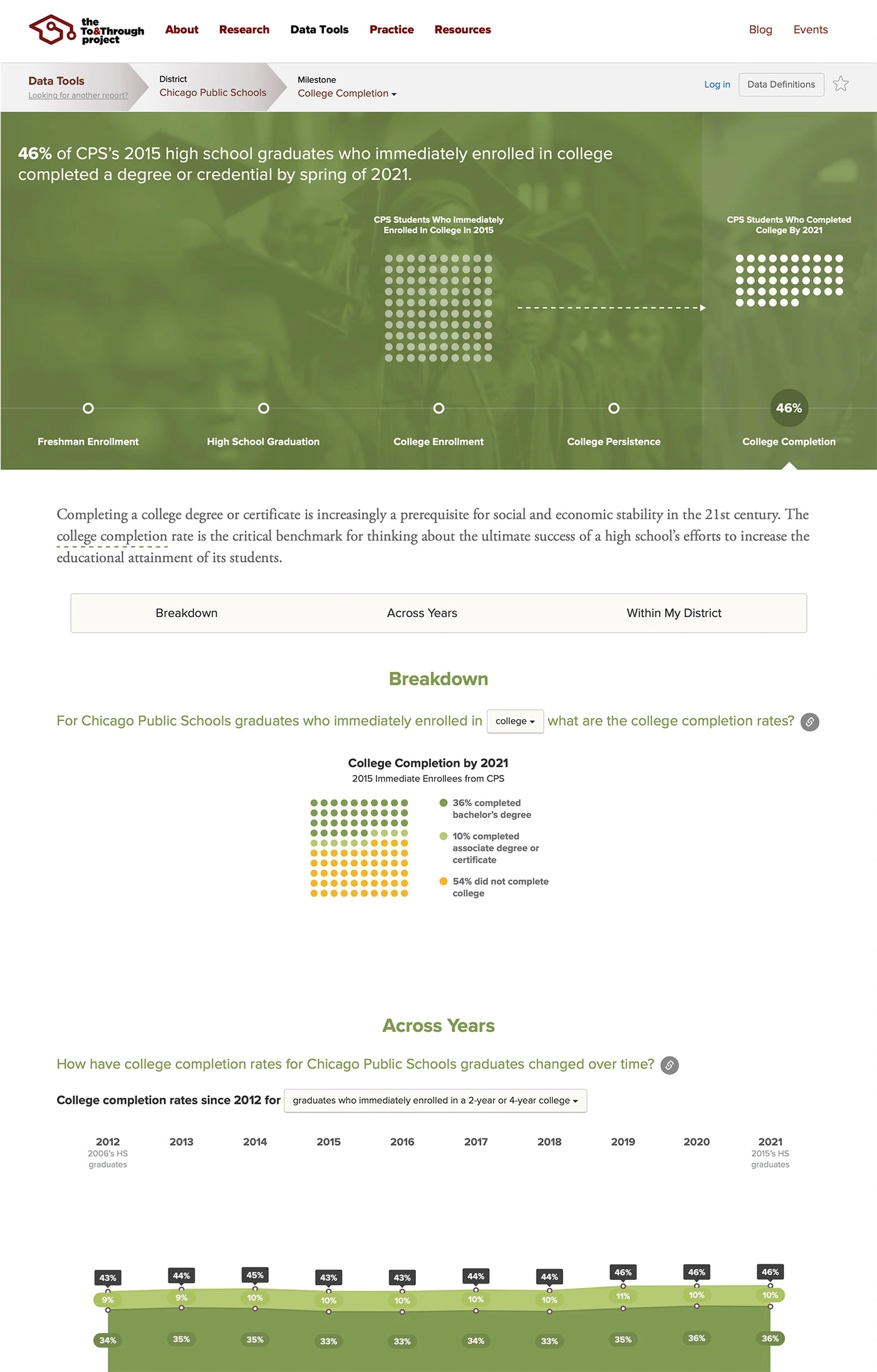 Over its lifespan, the To&Through Project has played a crucial role in improving educational outcomes in Chicago public schools by employing a data-driven approach to identify challenges, inform policy decisions, empower stakeholders, and ultimately help more students succeed in their journey to and through high school and college.
