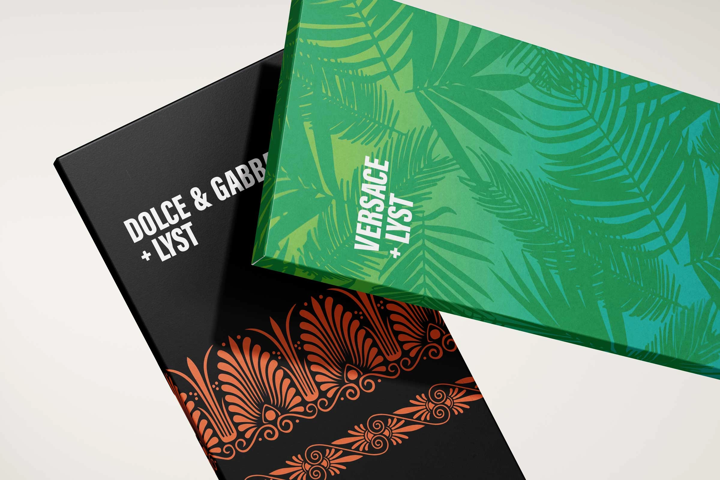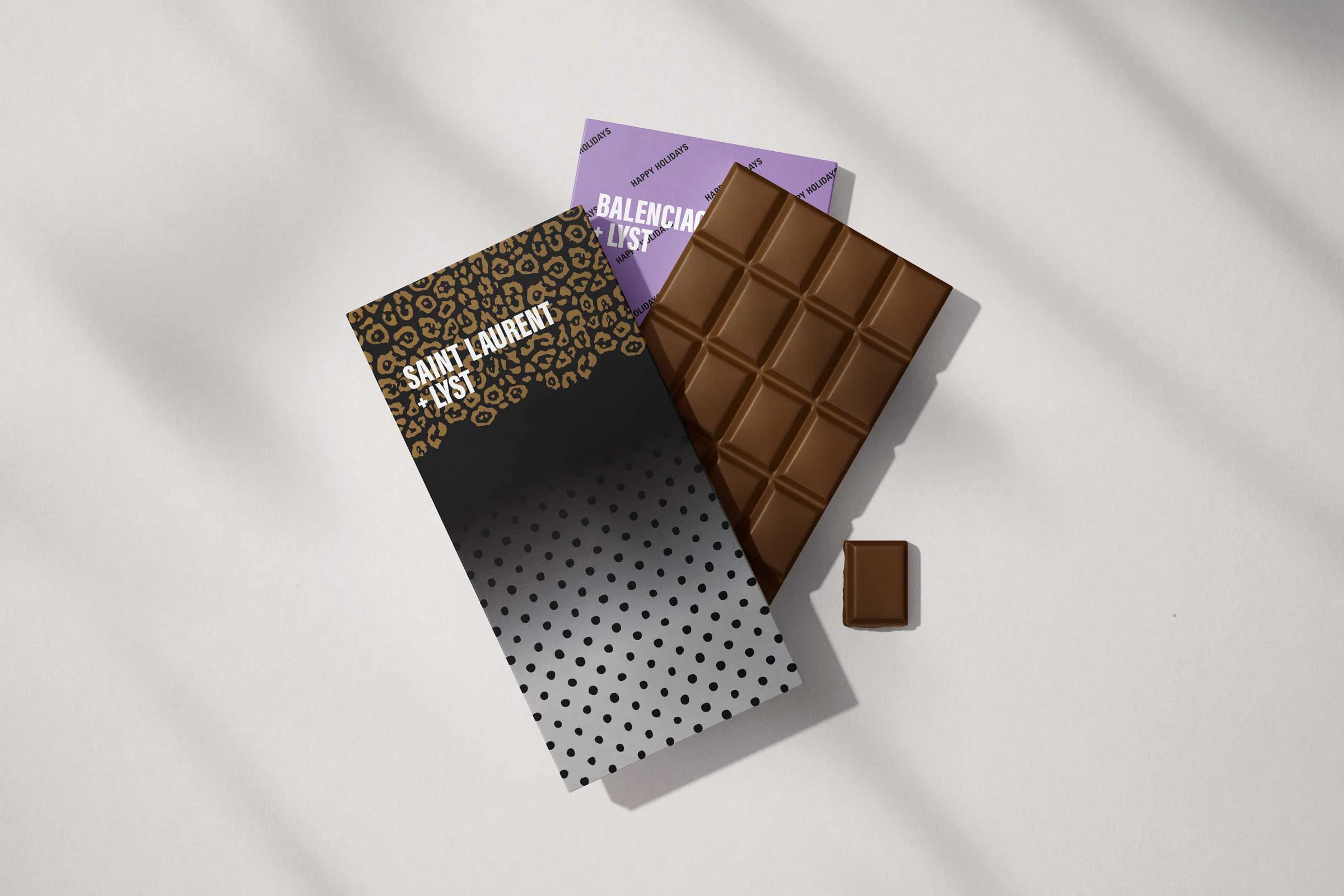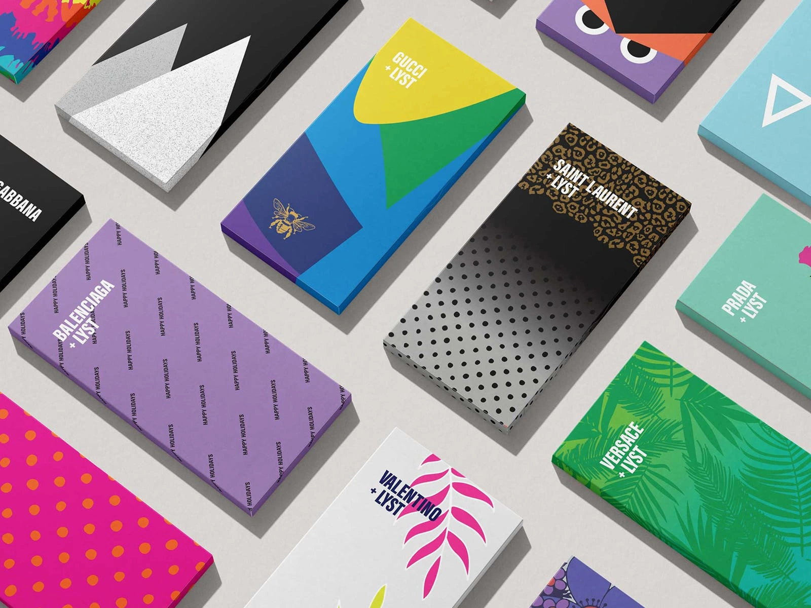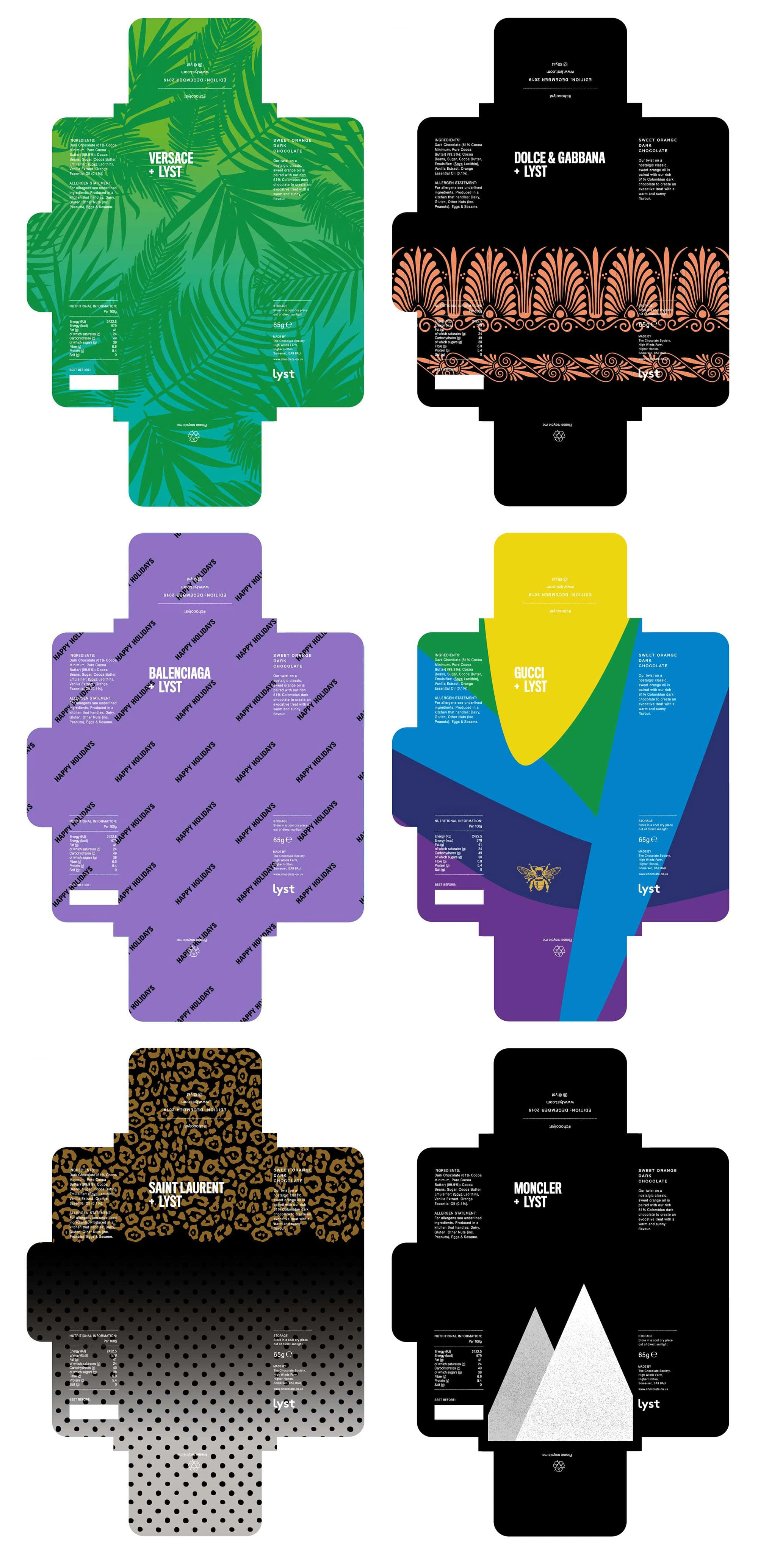 Lyst's partners include some of the world's biggest fashion brands, so to celebrate another year of them working together I created a collection of exclusive chocolate bar packaging designs, on behalf of Lyst, to send them as holiday gifts.