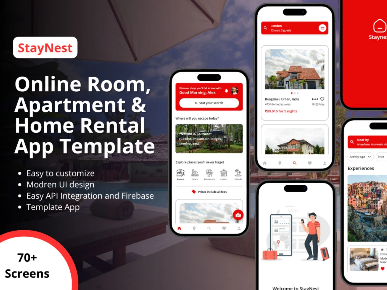 A modern hotel booking template app with room listings, availability check, pricing, and smooth reservation flow.