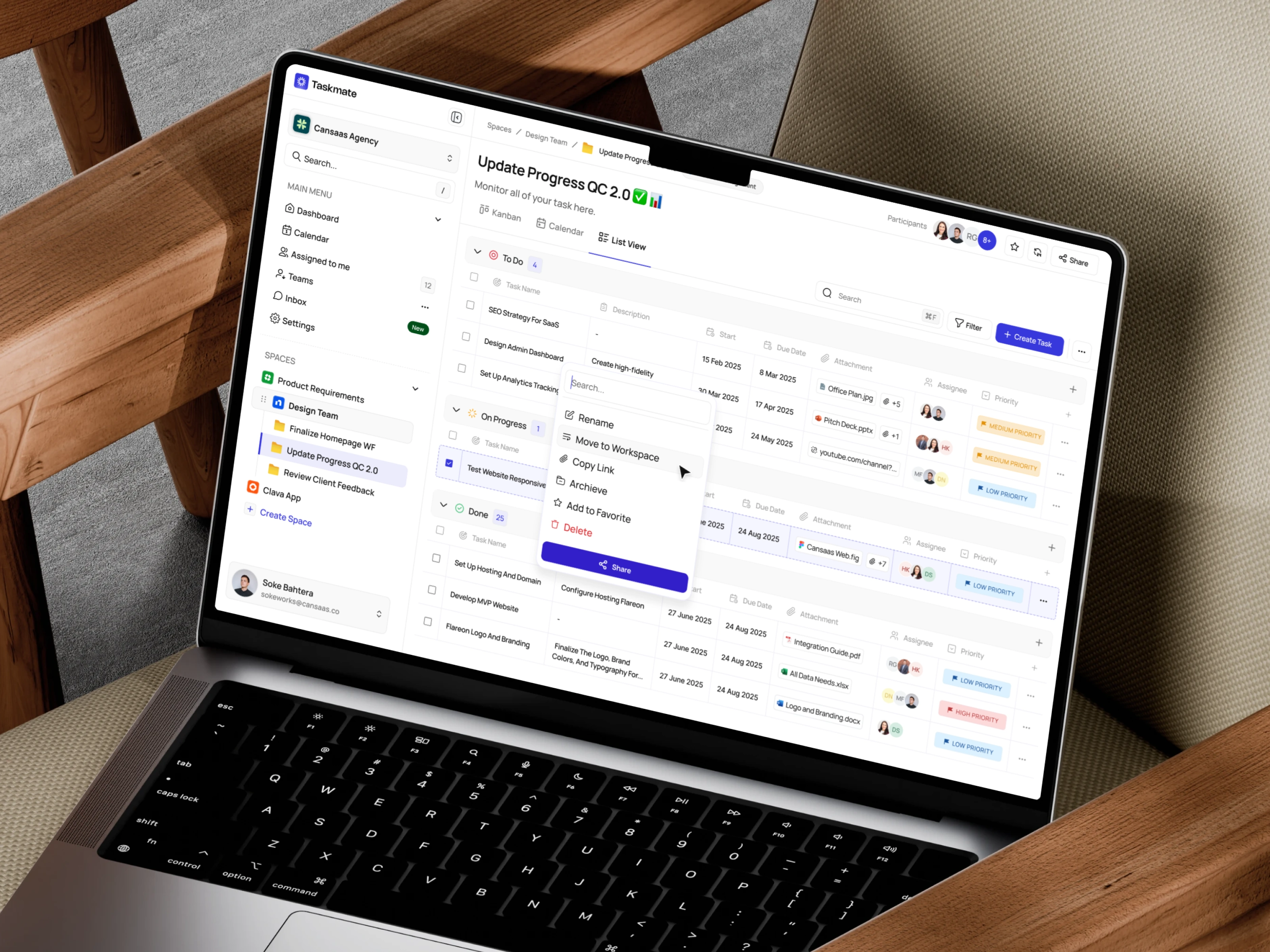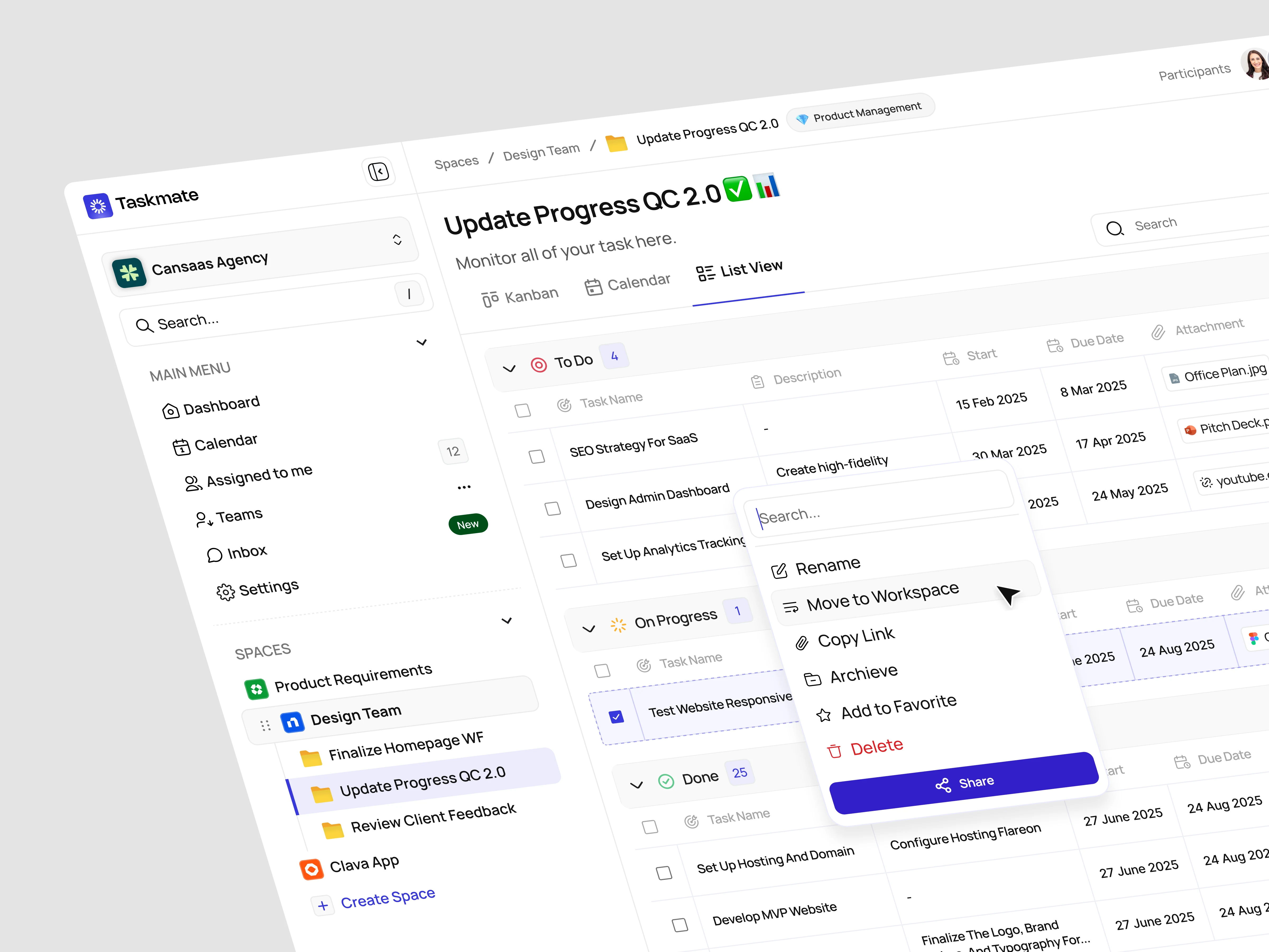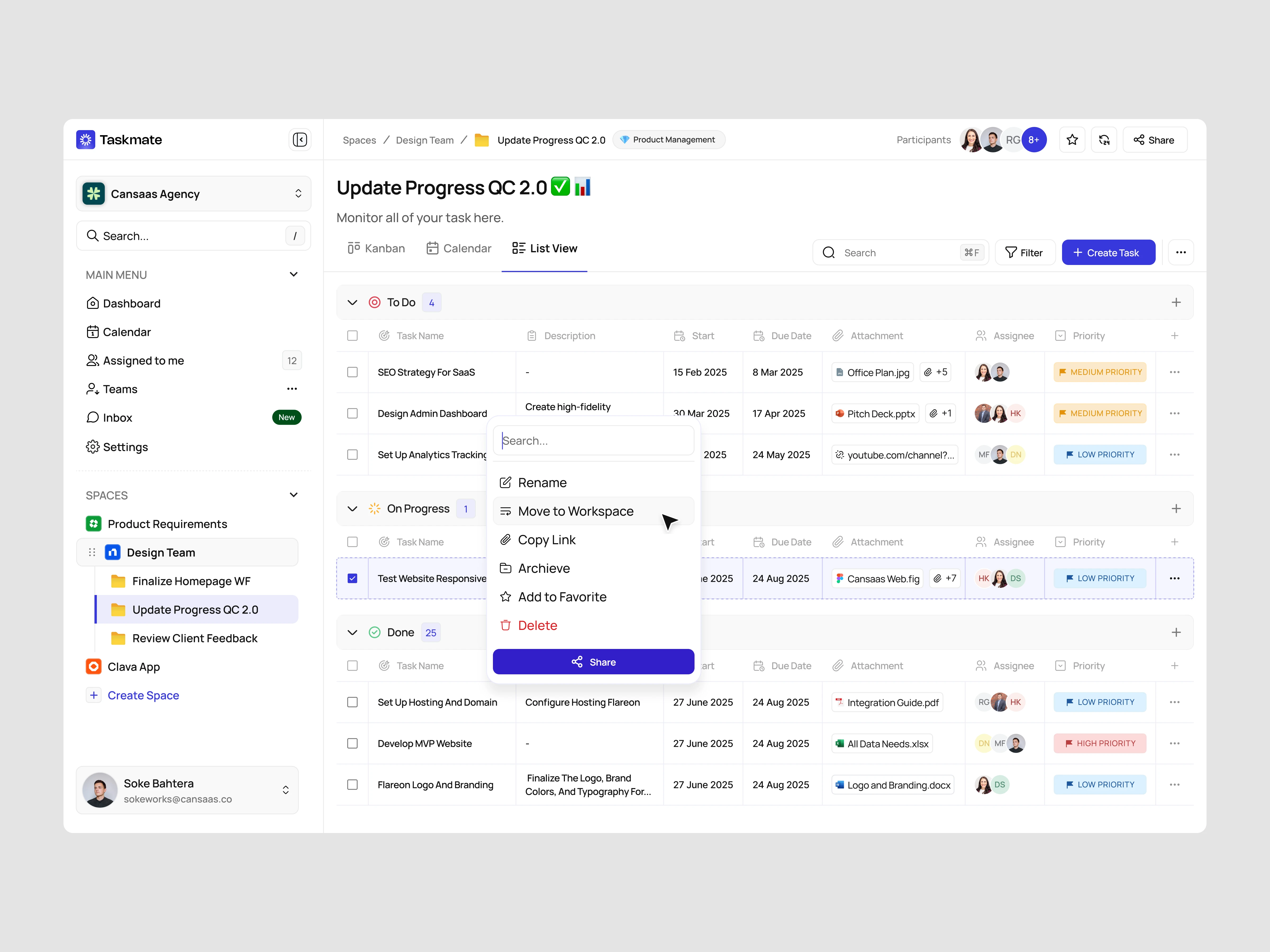 The design adopts a minimalist layout with clear status grouping such as To Do, In Progress, and Done, enhanced with color-coded priority labels and avatar-based assignee indicators for faster recognition. The right-side action menu provides efficient task control with actions like rename, move, archive, and favorite prioritizing usability and quick access to high-frequency actions.