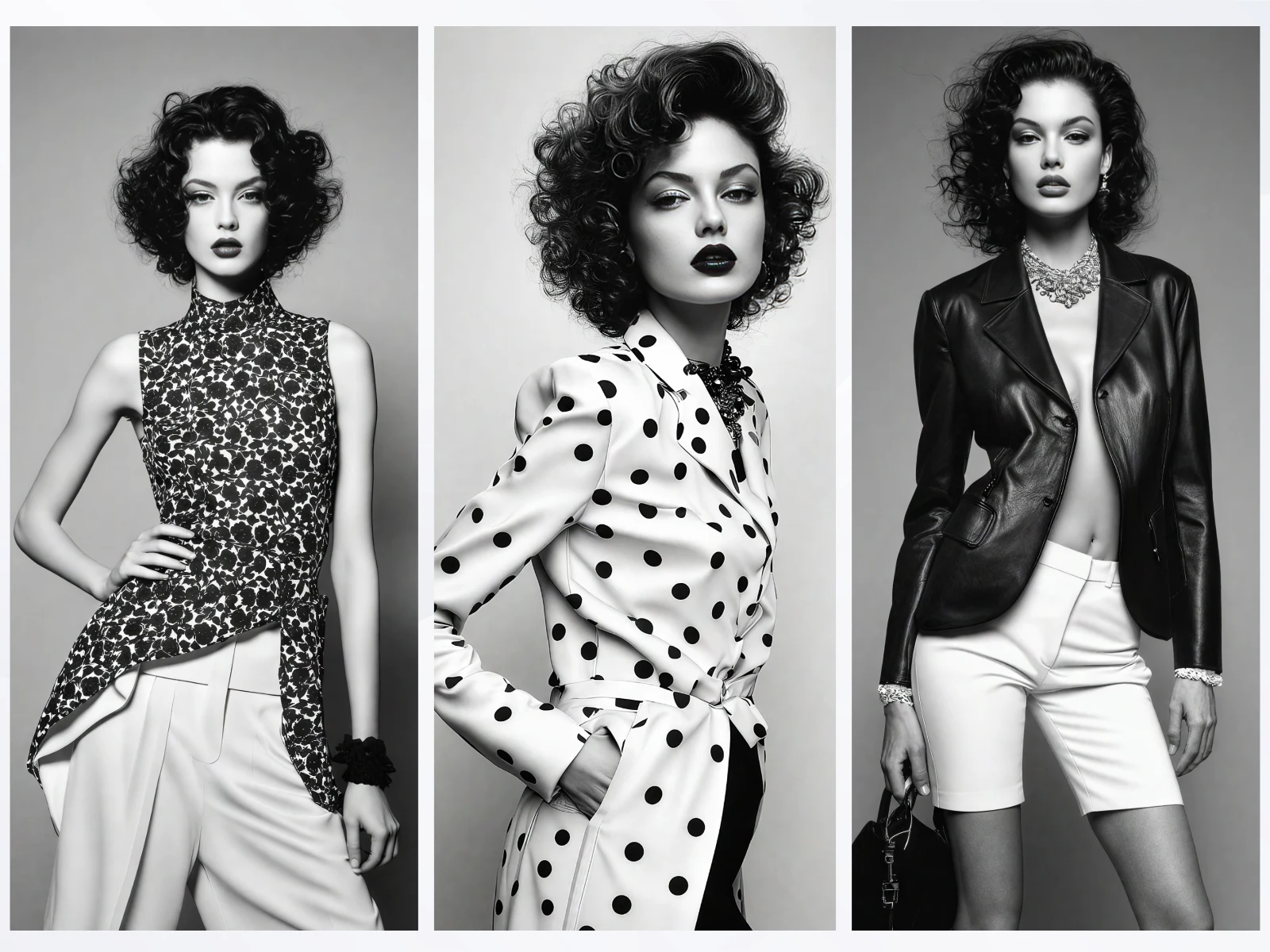 High fidelity modern monochrome fashion synthesis. 100% garment integrity for complex textures and polka dot patterns. Tools Used : PROMEAI