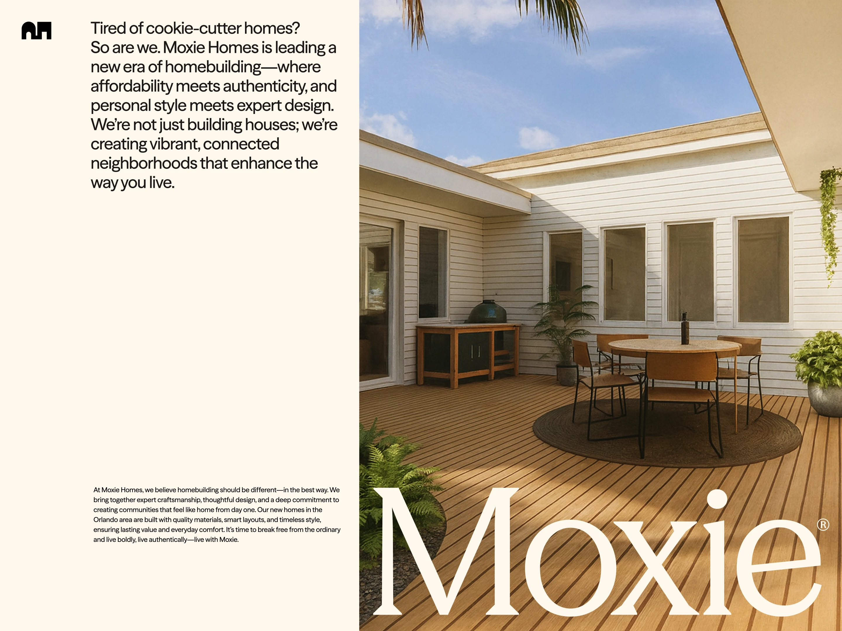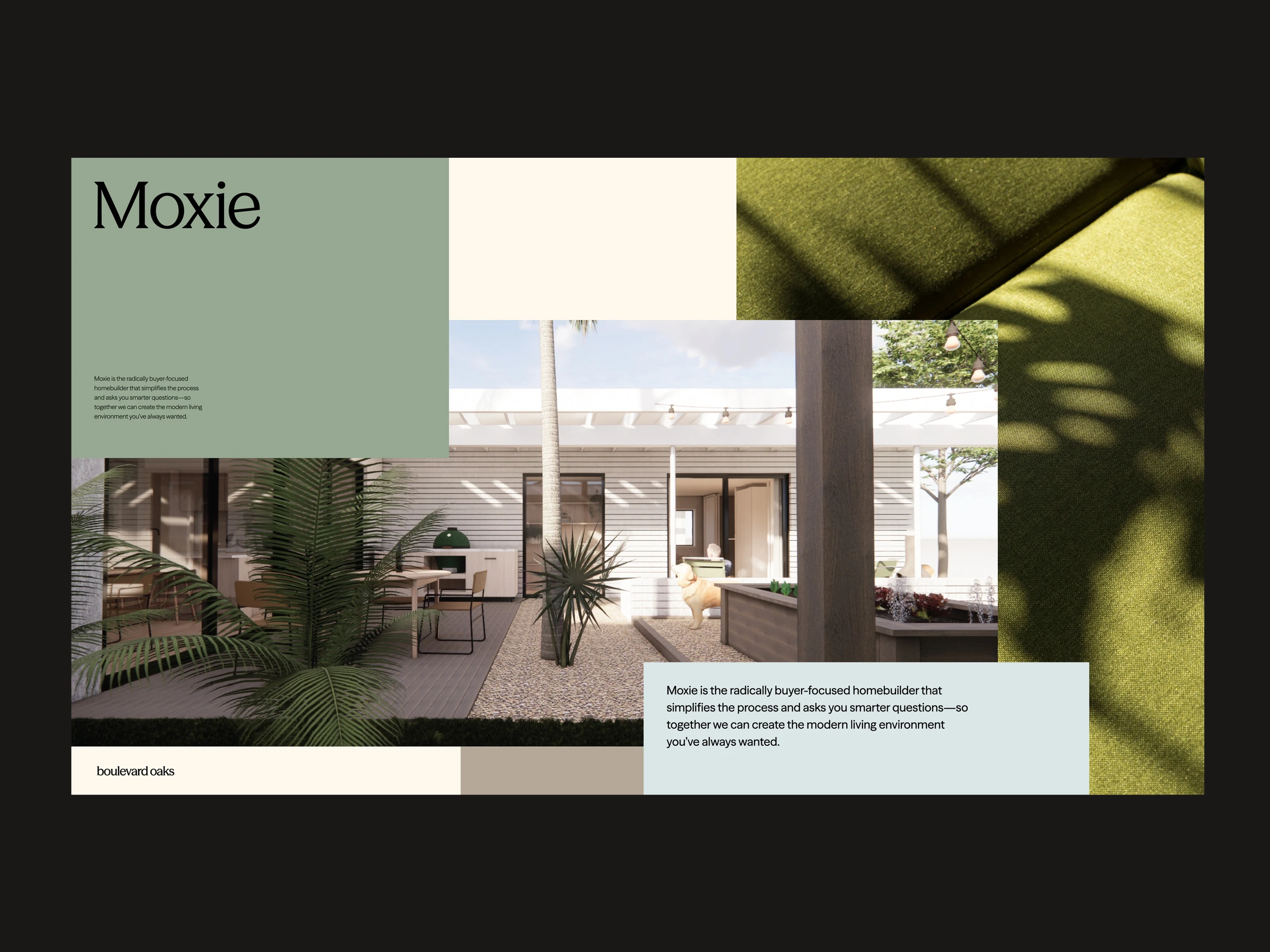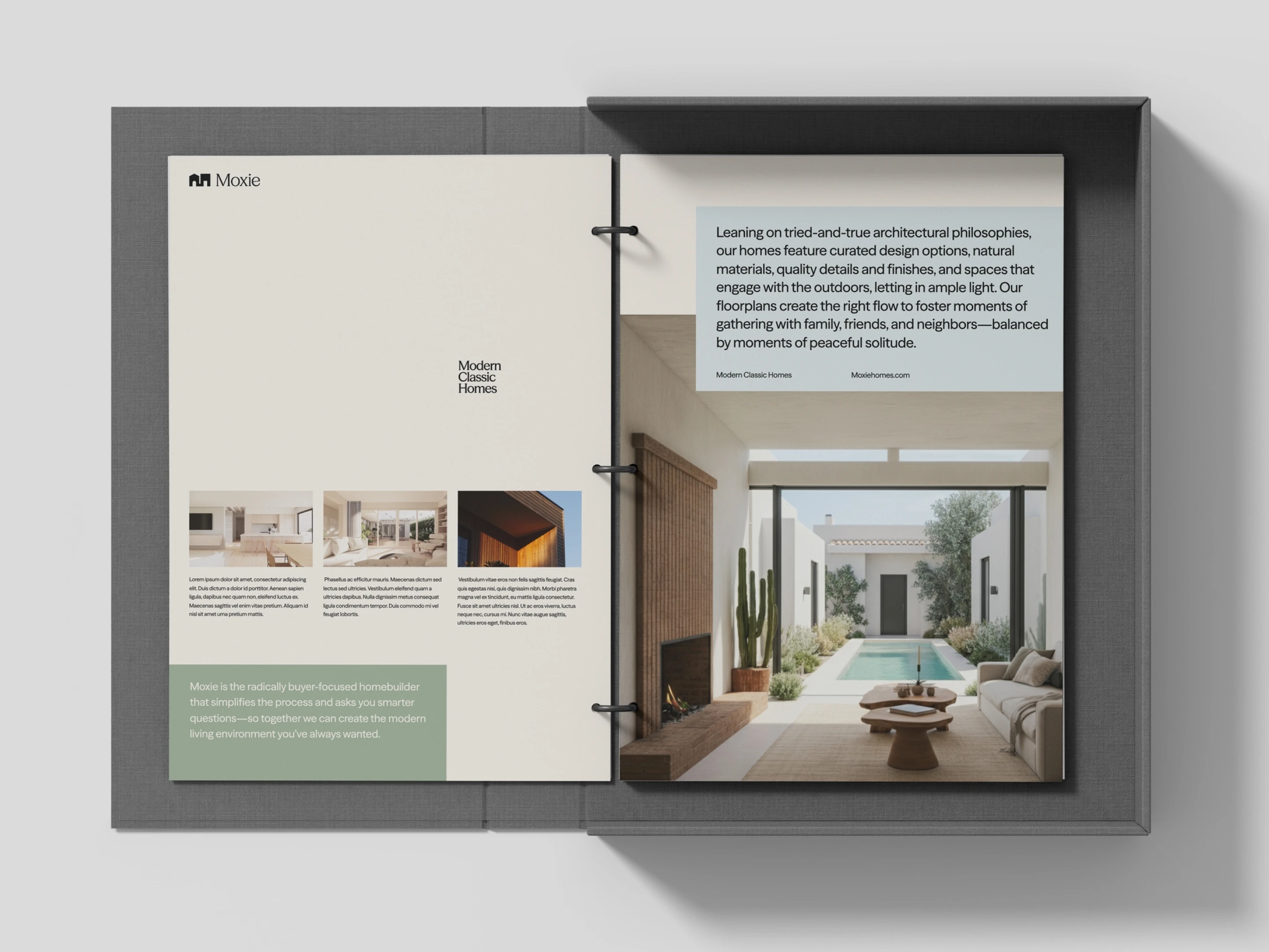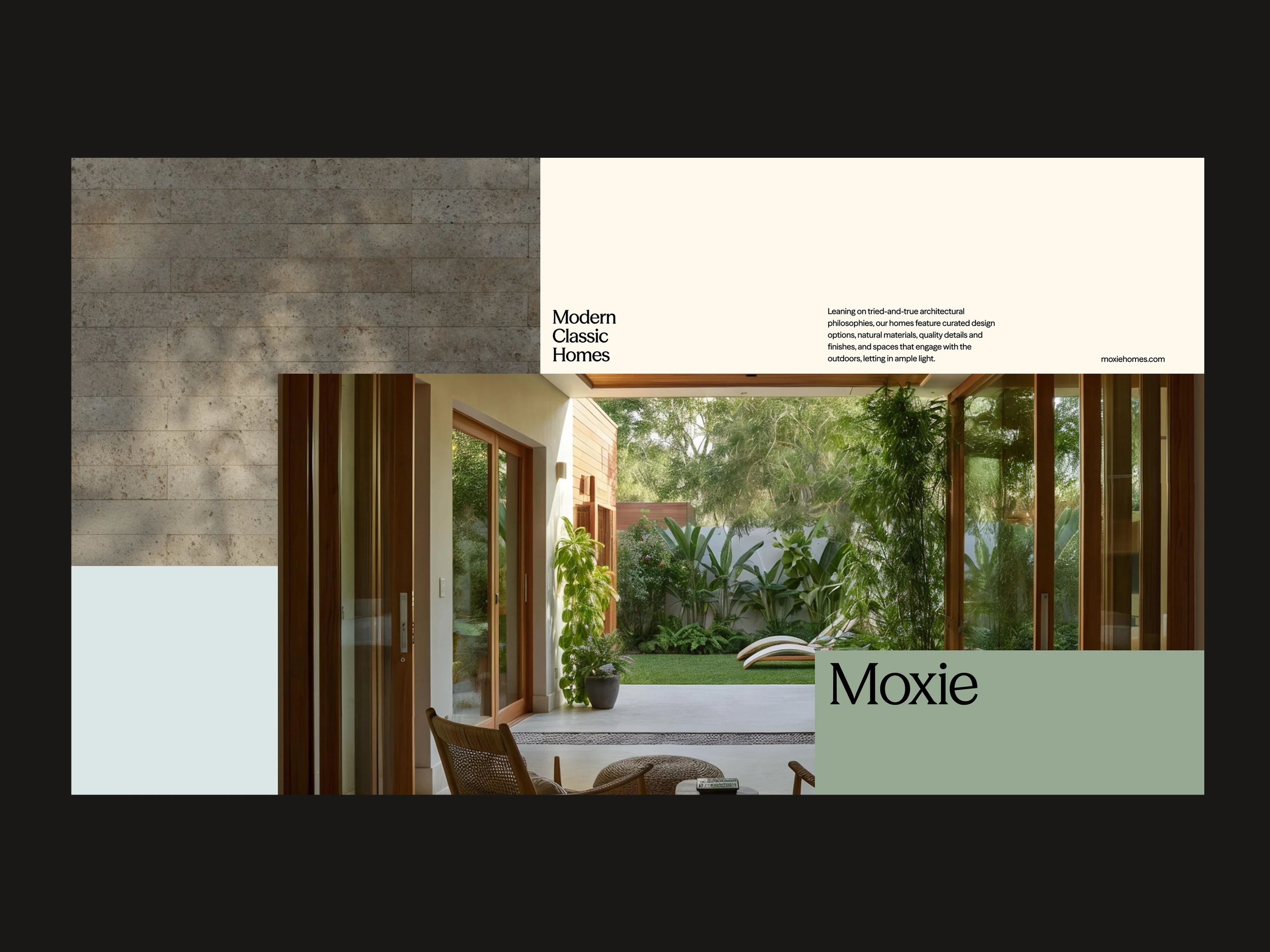 That same thinking carries into a layered grid system that is equally adaptable. Built on a soft, natural palette, the layouts combine close-ups of materials and furniture with architectural renders and landscaping, structured but warm and curated rather than templated.