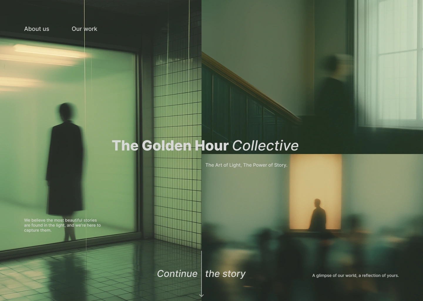 The homepage opens with a full-screen atmospheric photograph—likely an architectural interior with silhouetted figures, capturing the interplay of light and shadow. The image sets the mood immediately: sophisticated, artistic, slightly mysterious.
