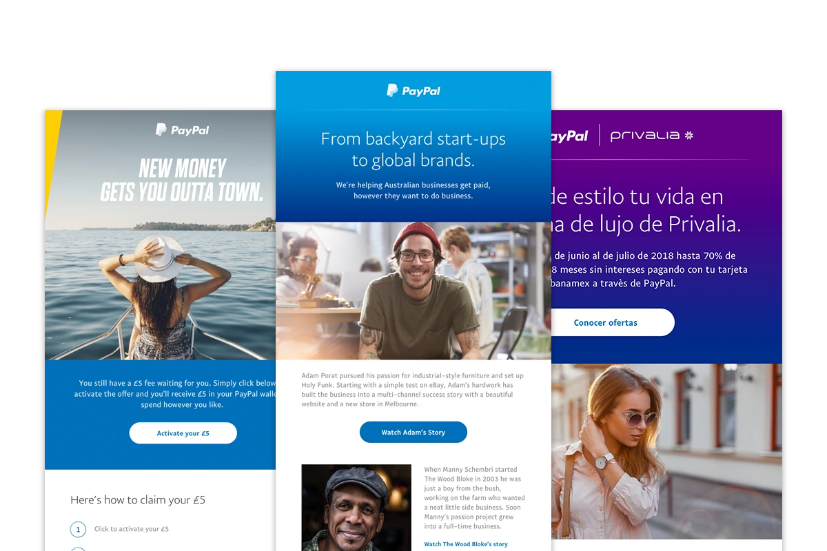 I redesigned the new email templates for PayPal from 2016 to 2017. This was a huge project impacting all EMEA regions. At that time, emails were the only assets that haven't been updated since the launch of their new brand identity. Case studies, analysis, workshops and user testings were proceeded for this project and at the end, I created a complete new functional and esthetic email design system which is still used by PayPal today.