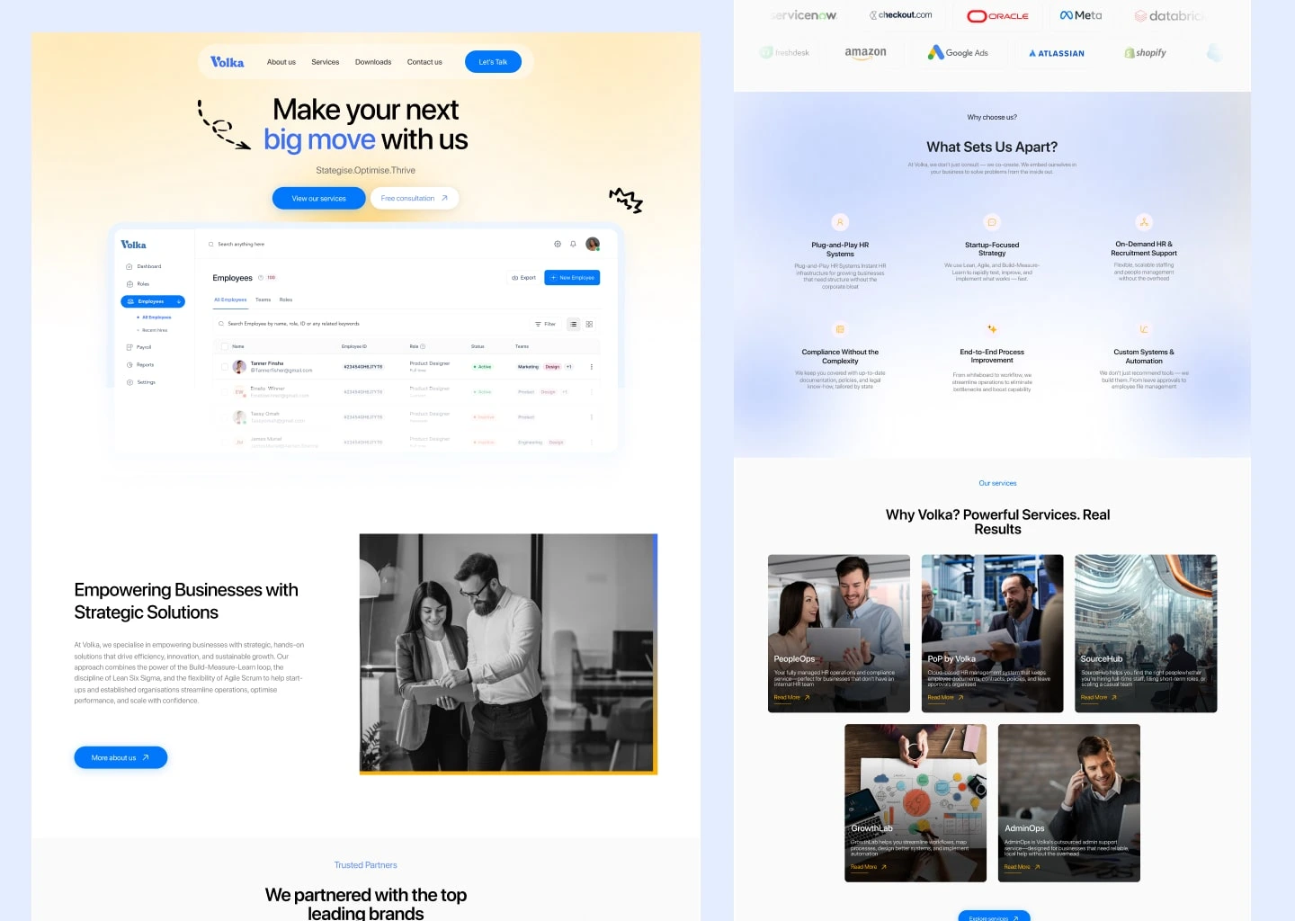 This is a clean and modern landing page UI for Volka, a B2B service provider specializing in HR systems, process optimization, and business automation.
