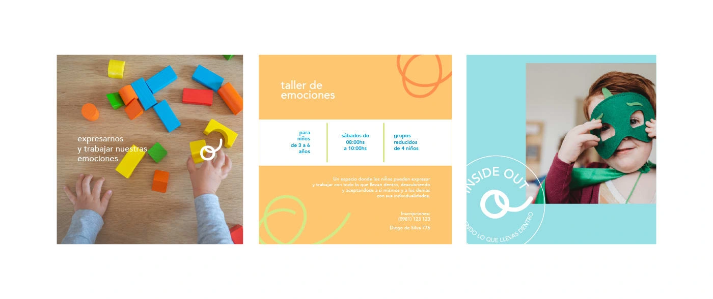 Design of the visual identity for Inside Out, a series of emotion and learning workshops for children led by psychologists. Our goal was to create something that would stand the test of time and be representative. The name comes from the movie Inside Out, which is about emotions, one of the central pillars of the workshops. It also arises from the idea of conveying that the workshops will be a space where children can express and work with everything they carry inside, discovering and accepting themselves and others with their individualities.