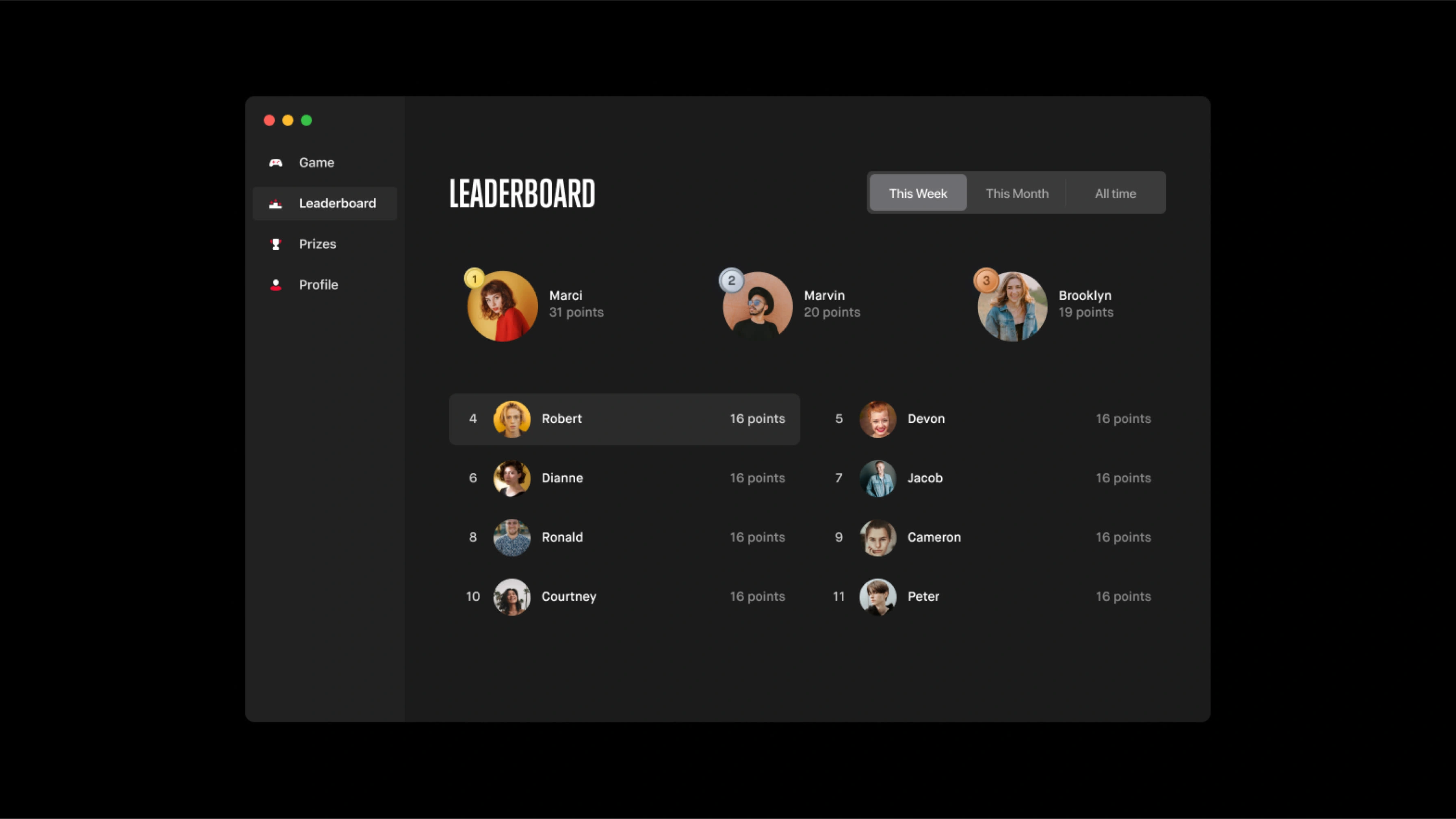 An app that helps new and long-time employees get to know each other and compete for real prizes. Create an app that focuses on people in the company and helps them get to know each other. Gamify the experience and make it special on every device.