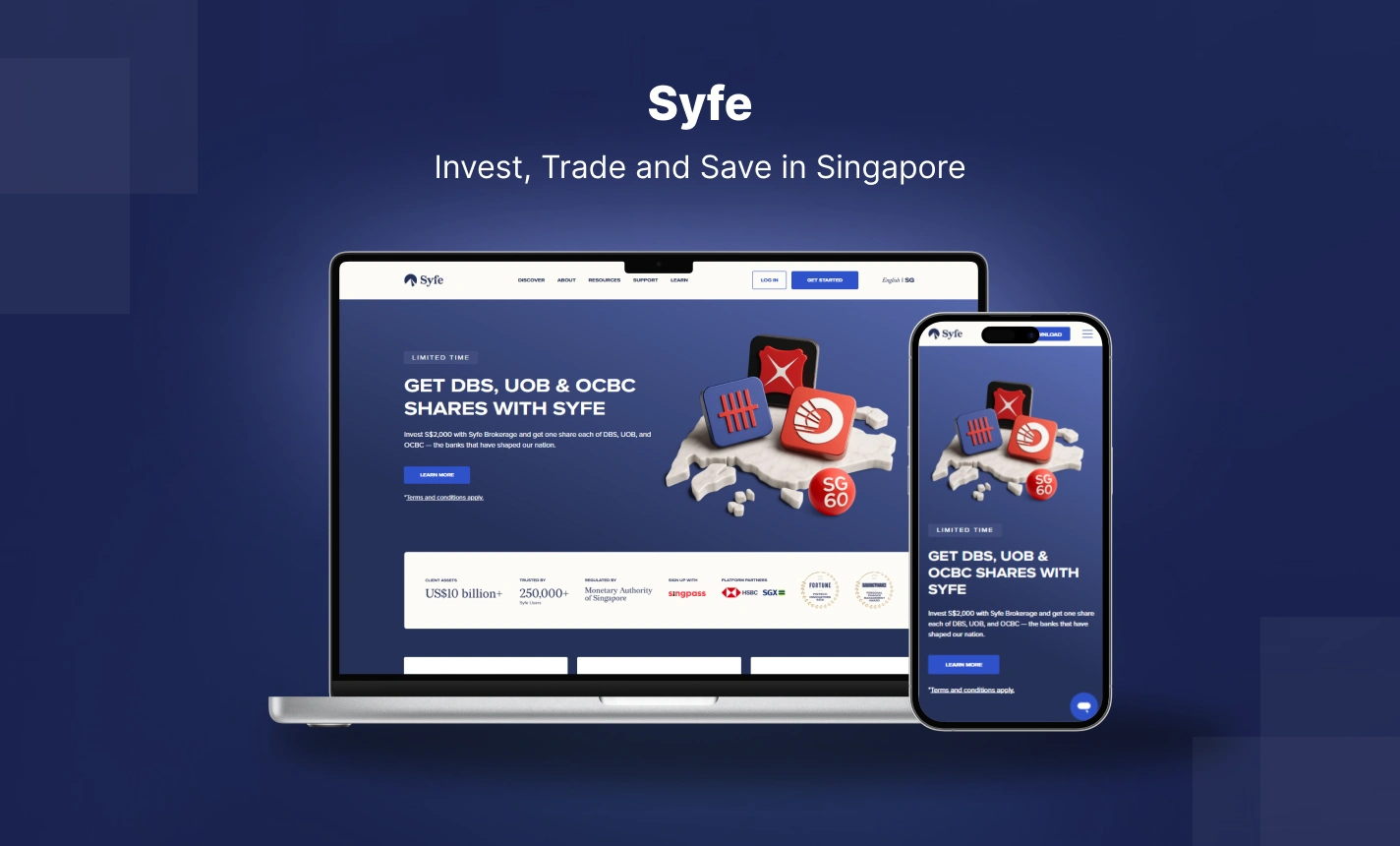 As the front-end and UX/UI development partner for Syfe, we delivered a refined, modular website that unifies the brand’s key offerings—Invest, Trade, and Save—into an elegant and intuitive user journey. Our responsive design showcases Syfe’s product suite (from Core Portfolios and Income+ to Cash+, SRS, and Private Wealth) with cohesive, brand-aligned visual components. To build confidence, we prominently featured MAS licensing, user metrics, key media endorsements, and client testimonials in visually engaging formats. The result: a high-performance, SEO-optimized fintech portal that strengthens brand trust and facilitates effortless investor onboarding.