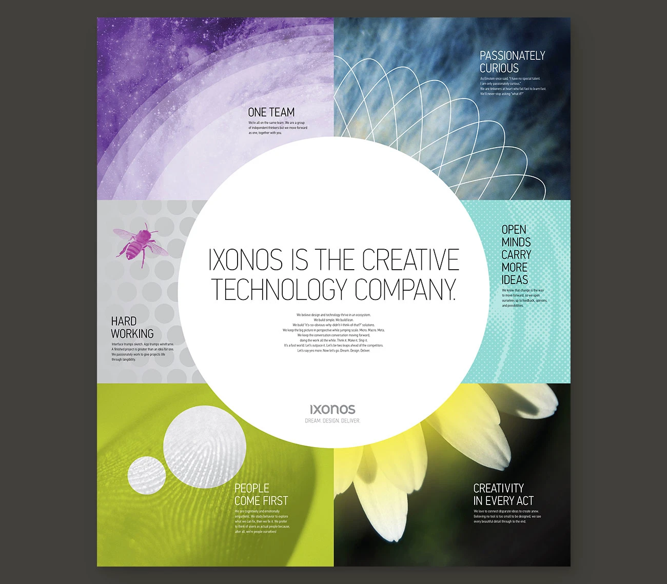 Ixonos is a Finnish technology and design firm employing a global community of designers, engineers, strategists, and innovators. To convey Ixonos’ core brand principles to its employees, True story designed a folded poster consisting of 6 sub-compositions that, when opened, combined into one single image.