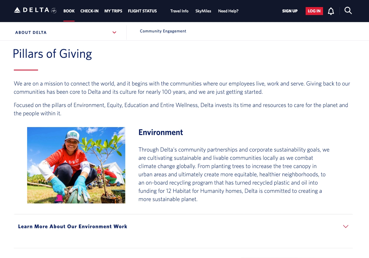 Refresh of Delta's corporate philanthropy page, aligning stakeholders, refining visuals and copy, and driving strategy within tight brand and tech constraints.