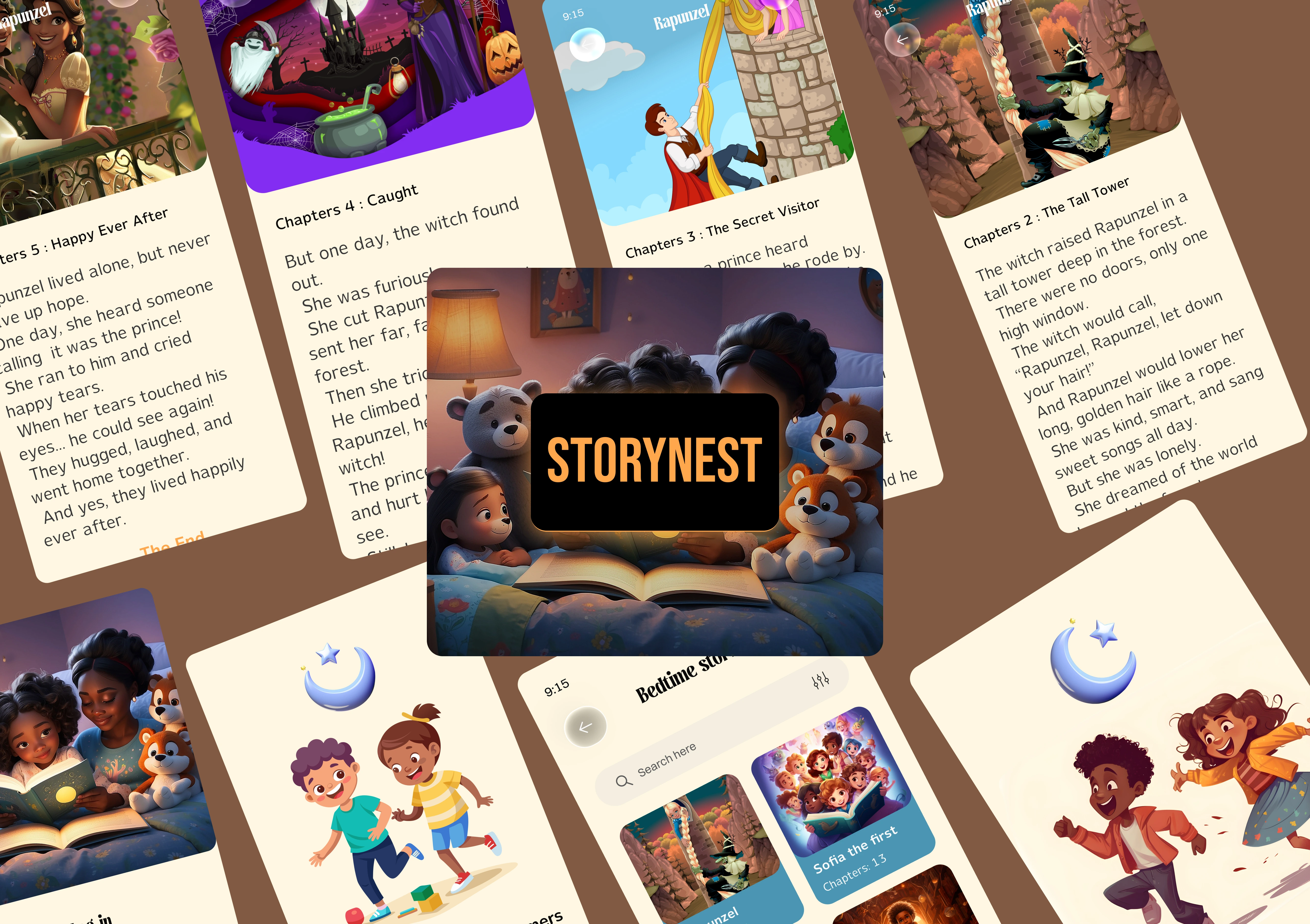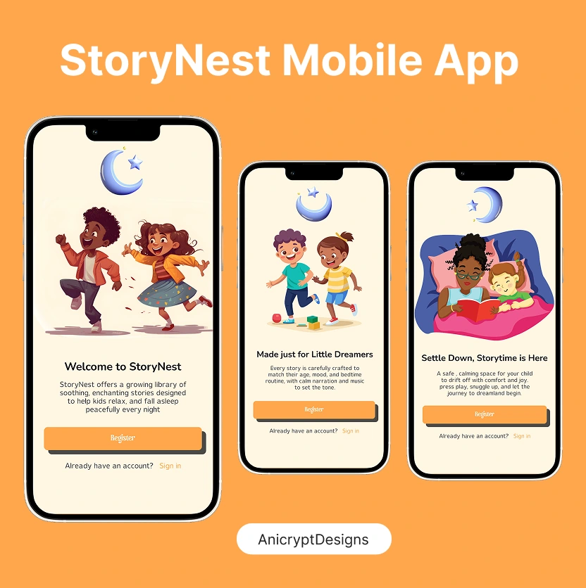 StoryNest features a carefully curated library of bedtime stories professionally narrated with calm, soothing voices that gradually slow in pace to encourage sleep. Stories are categorized by age group (3-5, 6-8, 9-11) and length (10, 15, 20, 30 minutes) to fit different bedtime needs. The app includes ambient background sounds (rain, ocean waves, forest sounds) that continue after the story ends with a gradual fade. Designed a dimming feature that automatically reduces screen brightness as the story progresses, minimizing sleep disruption. Created a "Wind Down" mode that suggests a series of calmer stories as bedtime approaches, preparing children for sleep. Added favorites and custom playlists so parents can queue multiple stories for children who need longer settling time. Included "Continue Tomorrow" bookmarking for longer stories that can span multiple nights, building anticipation.