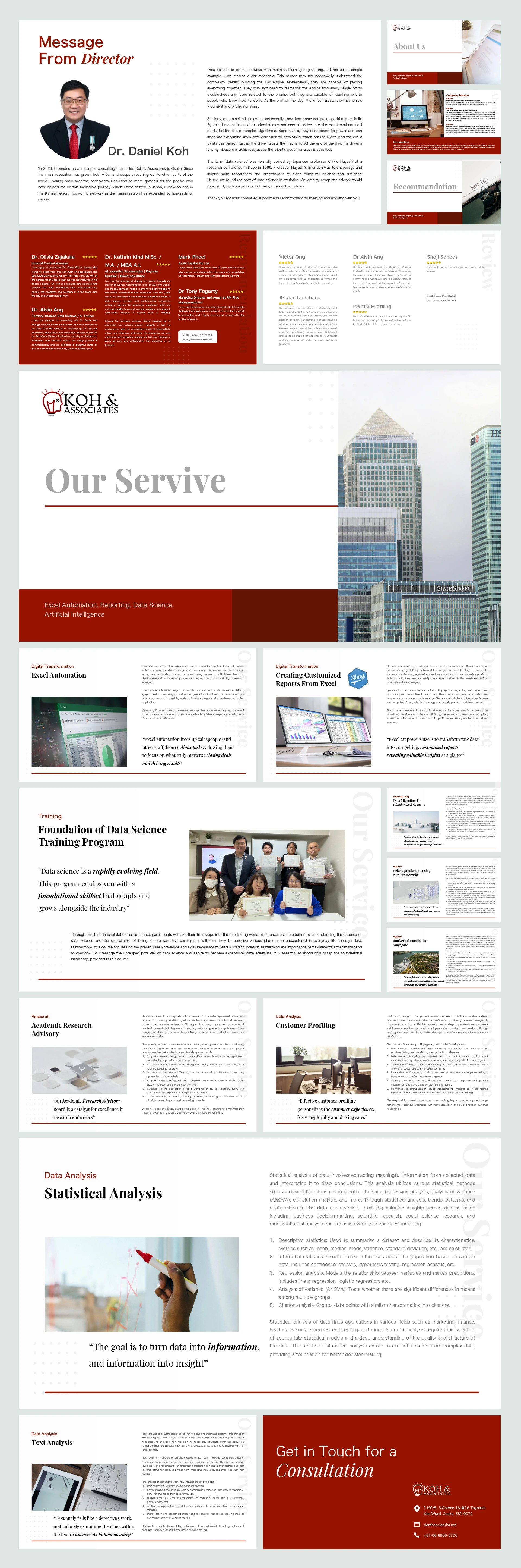 This presentation design was created for KOH & Associates, a data science consulting firm based in Osaka, to highlight their services, vision, and industry expertise. The project focused on crafting a visually engaging, professional deck that effectively communicates the company’s mission and value proposition to potential clients and partners.