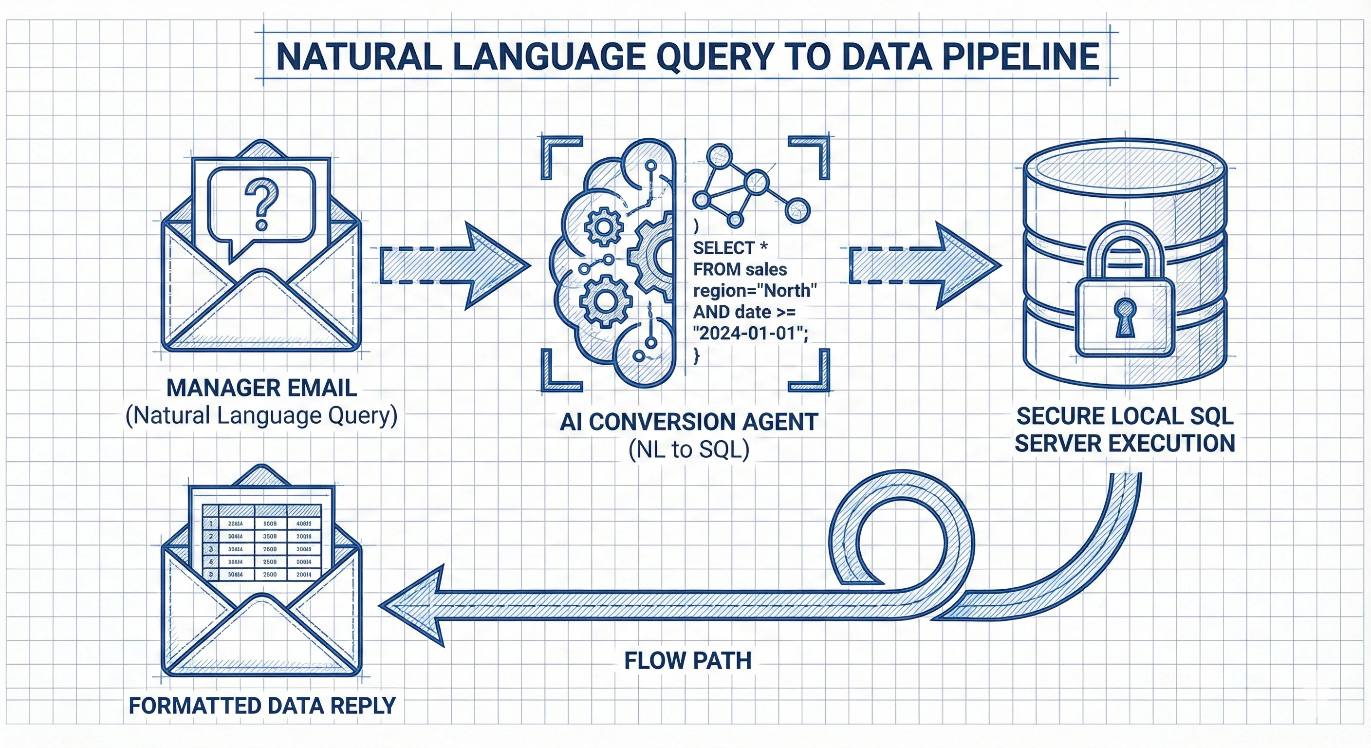 Workflow: A manager sends an email containing a spreadsheet of IDs and a question in plain English (e.g., "What was the total spend for these client IDs last month?"). The agent converts the natural language into complex SQL queries, securely executes them on the live server, and replies to the email with the exact data requested in an easy-to-read format.