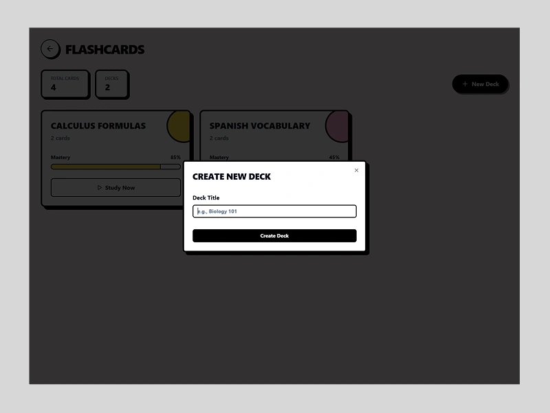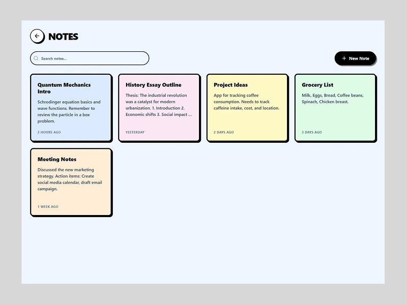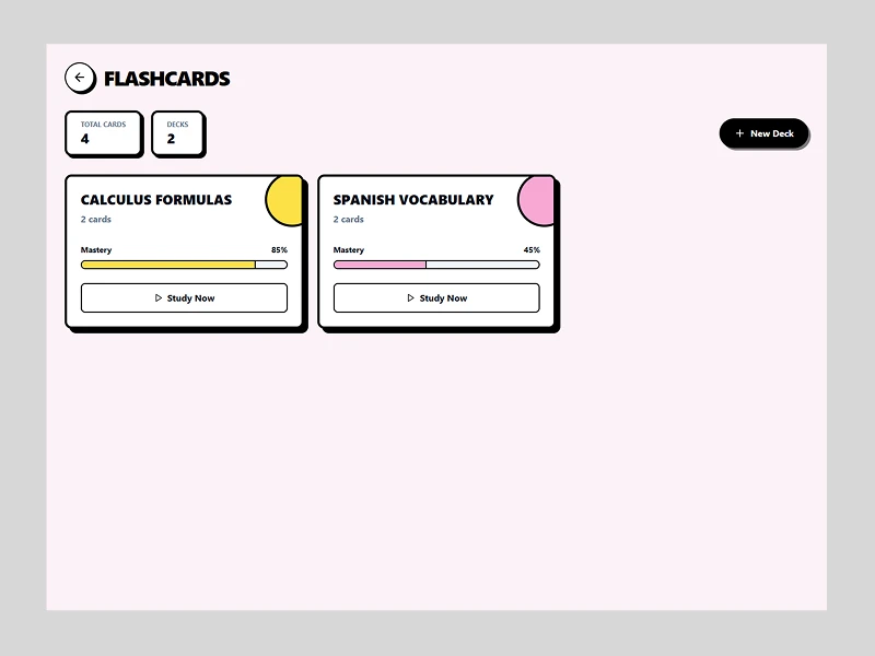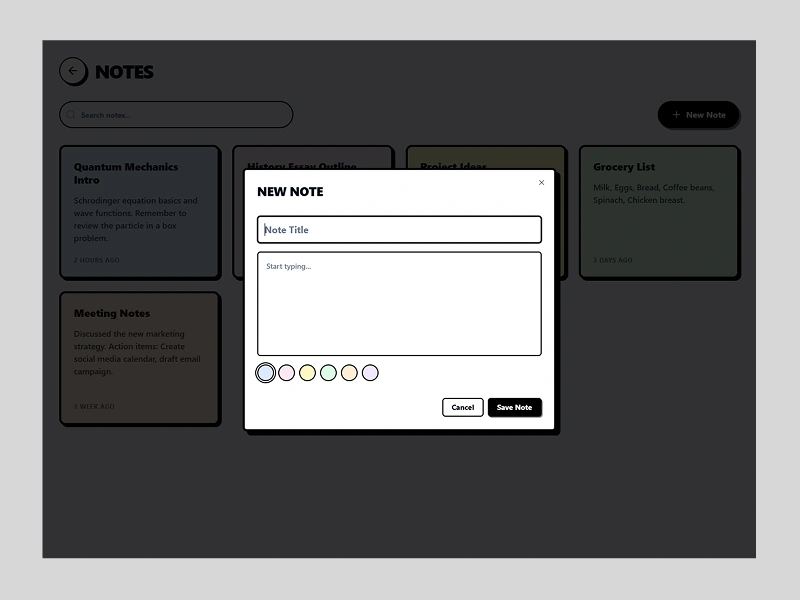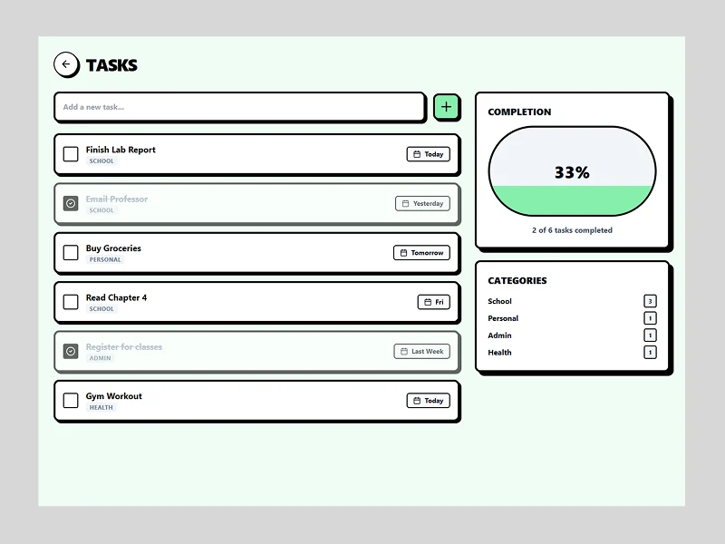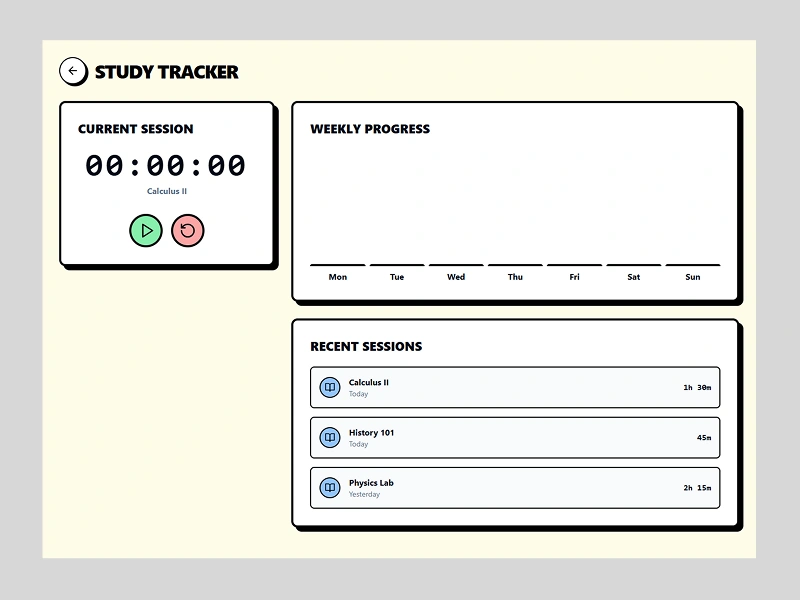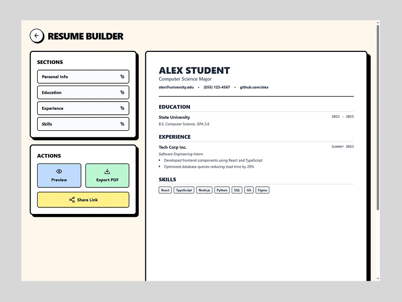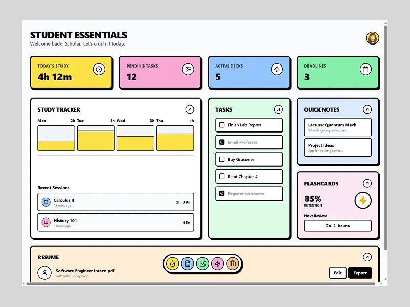 I used a neo-brutalist / bento-grid UI: bold outlines, soft color blocks, and high-readability cards. Each section is built to reduce friction—quick tasks, lightweight notes, simple study tracking, and a modal-based resume builder.