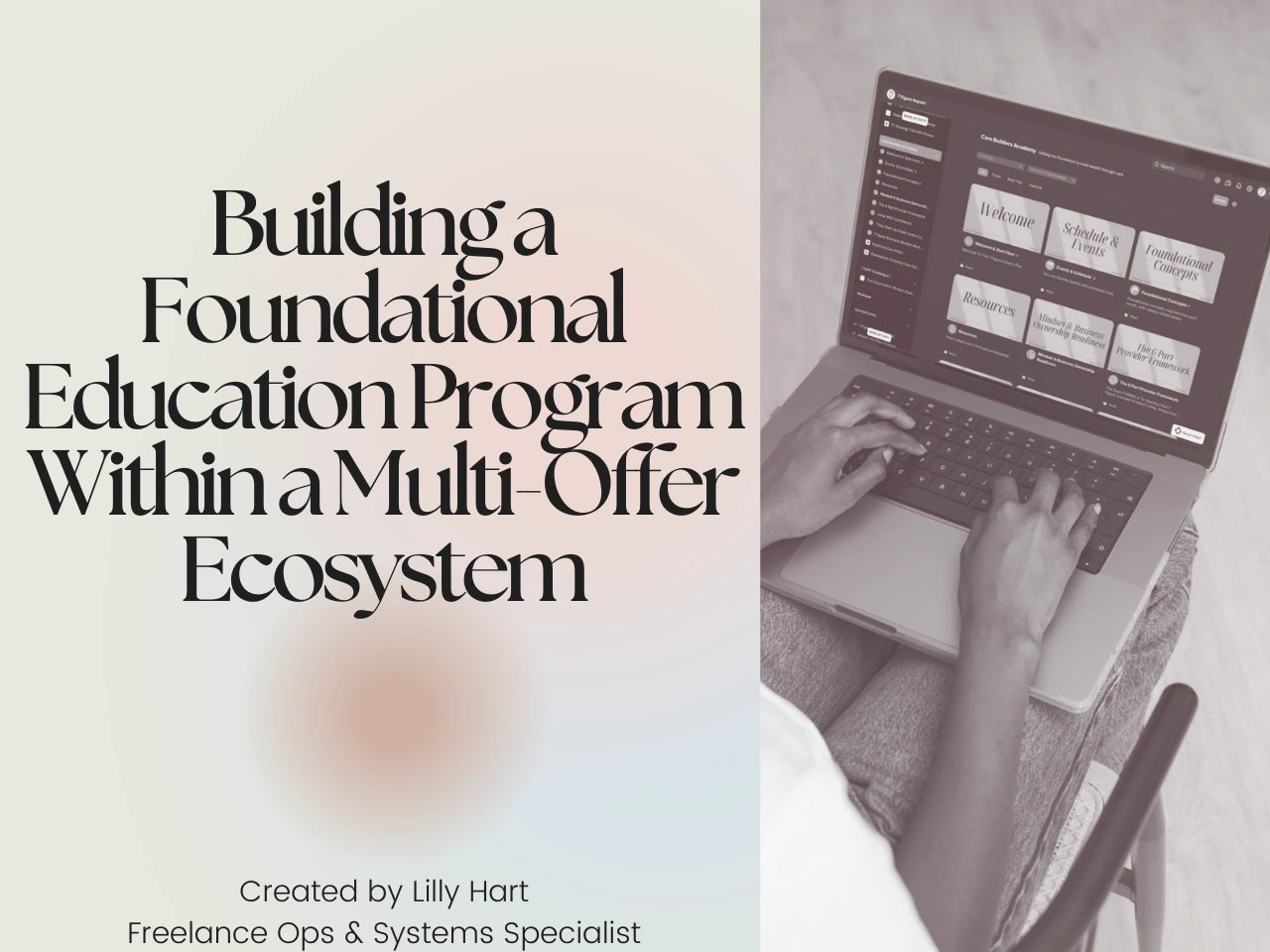 Scope included offer positioning, curriculum architecture, sales page copy, visual direction, live-event frameworks, onboarding flows, and backend automations. The program was designed to function as a standalone educational experience while also supporting sustainable growth across a broader portfolio of education products.