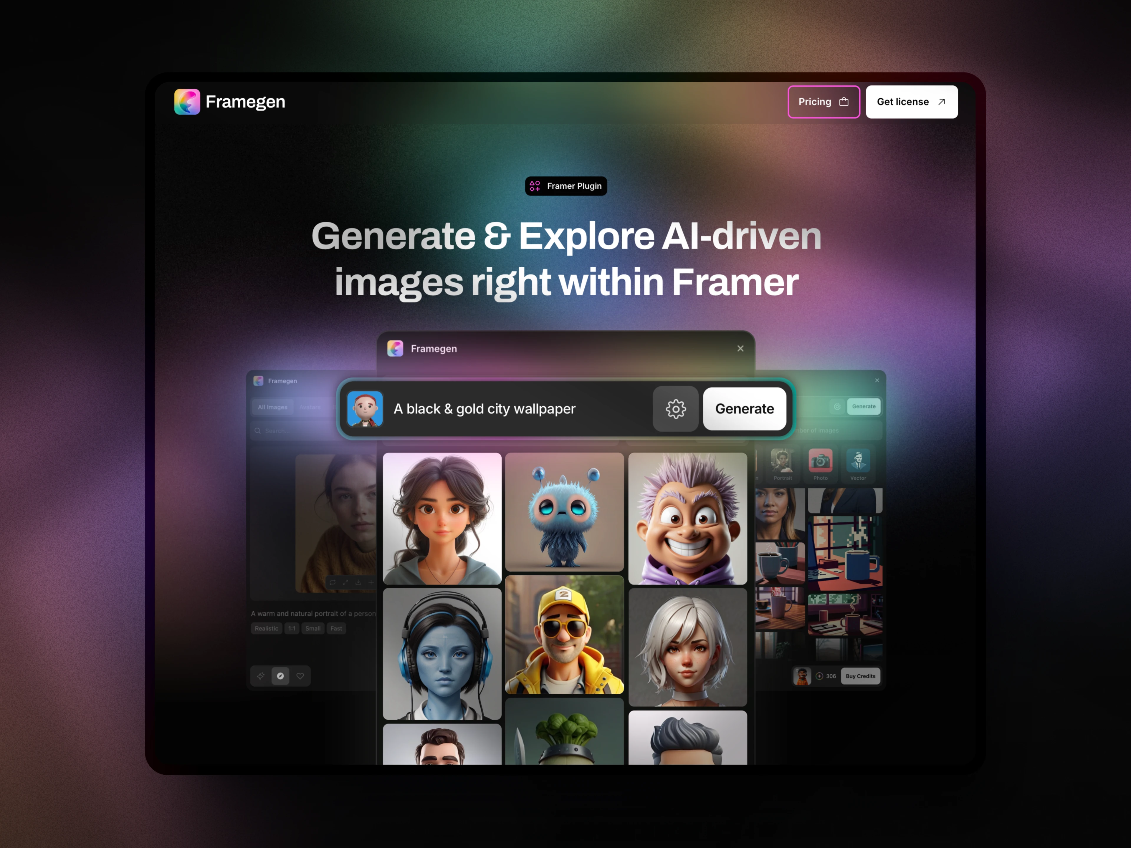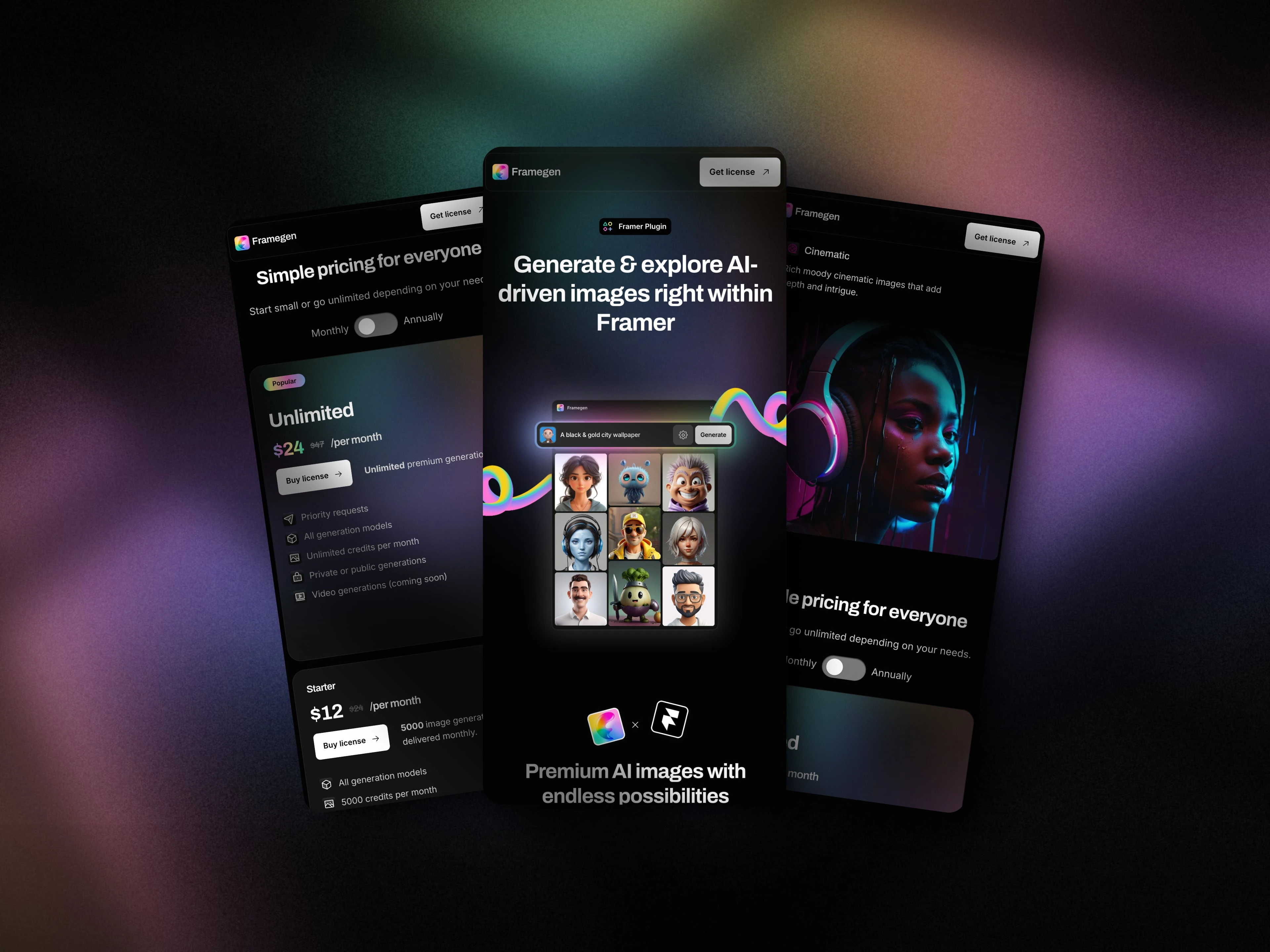 Framegen is a premium AI platform exclusively for Framer designers and builders who want to introduce AI workflows and images into their work. This comprehensive plugin offers a vast library of high-quality AI collections, prompts and the ability to generate tailored AI images to enhance your Framer projects.