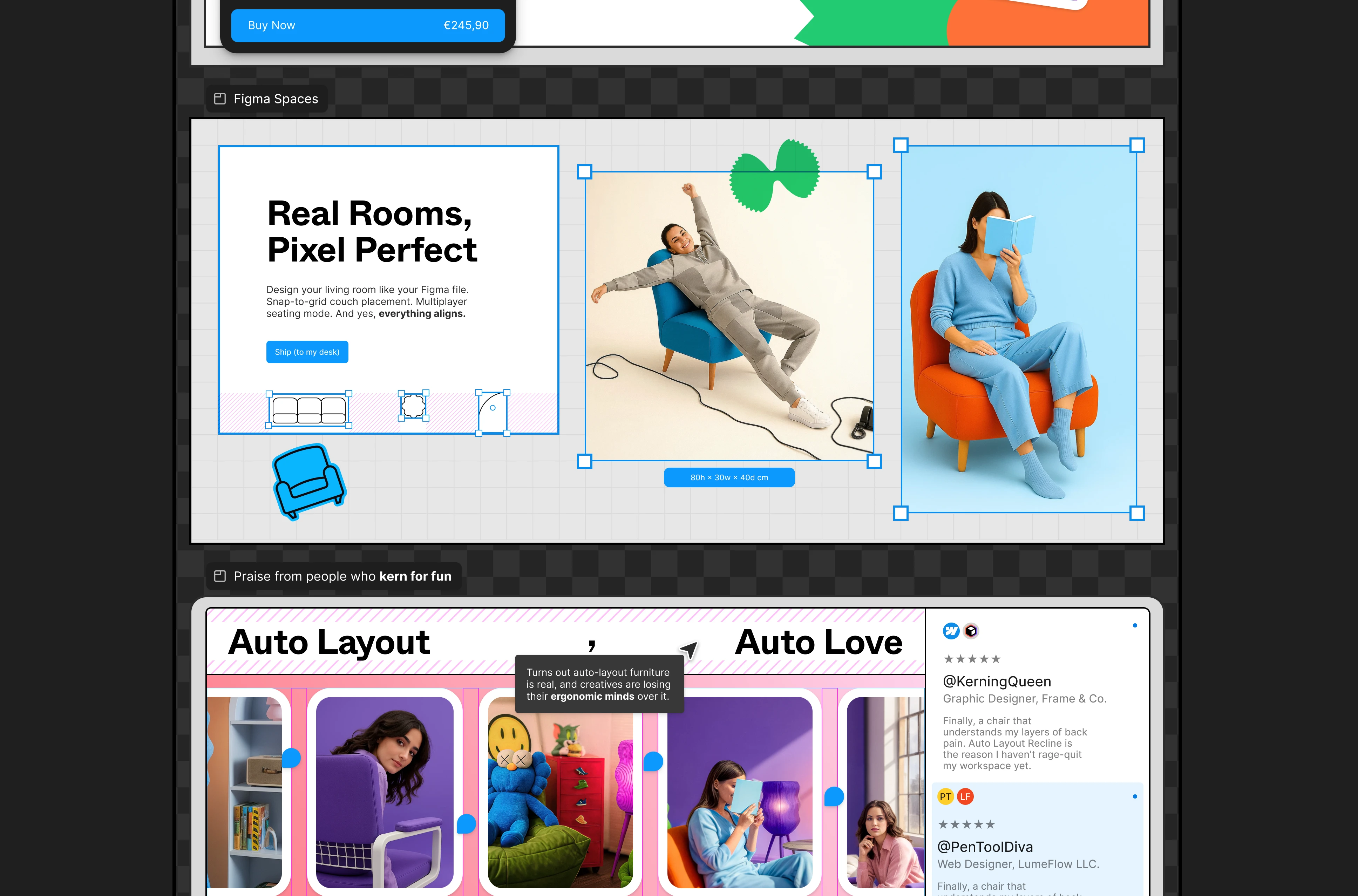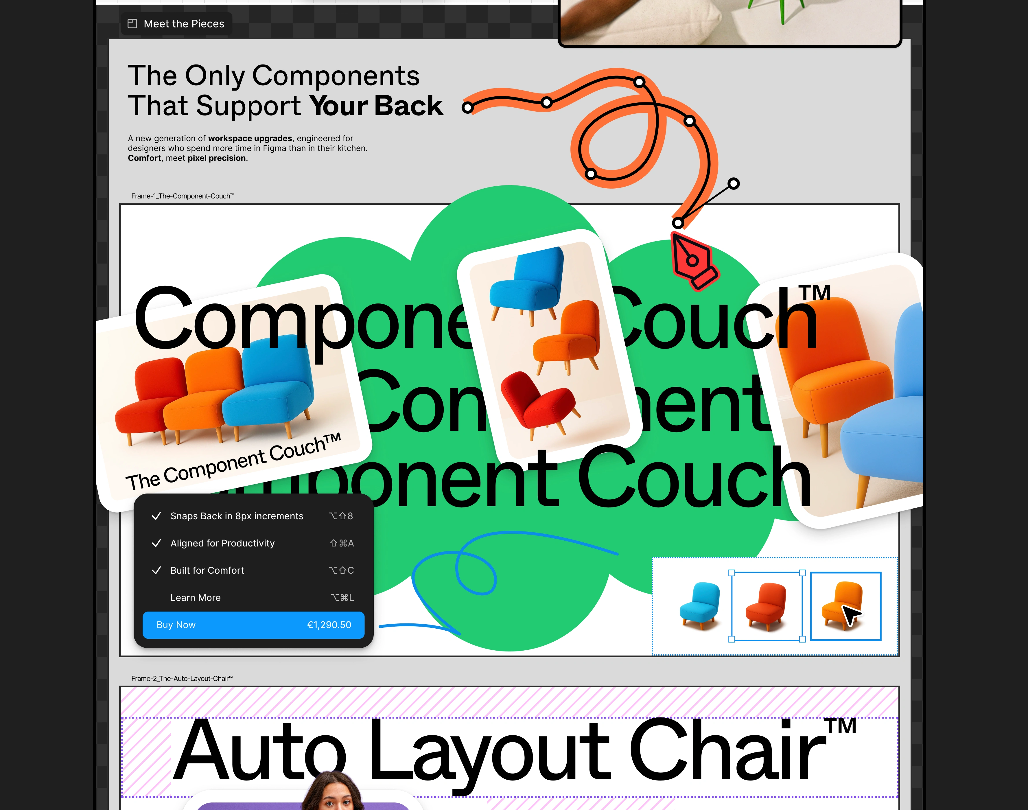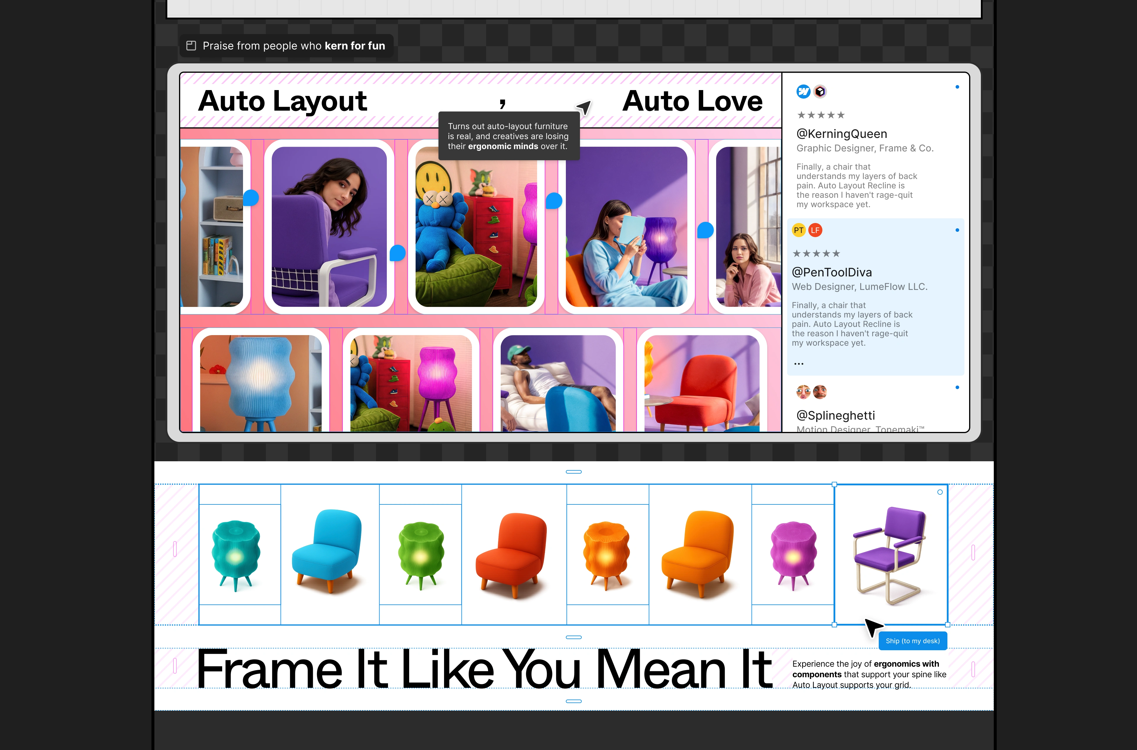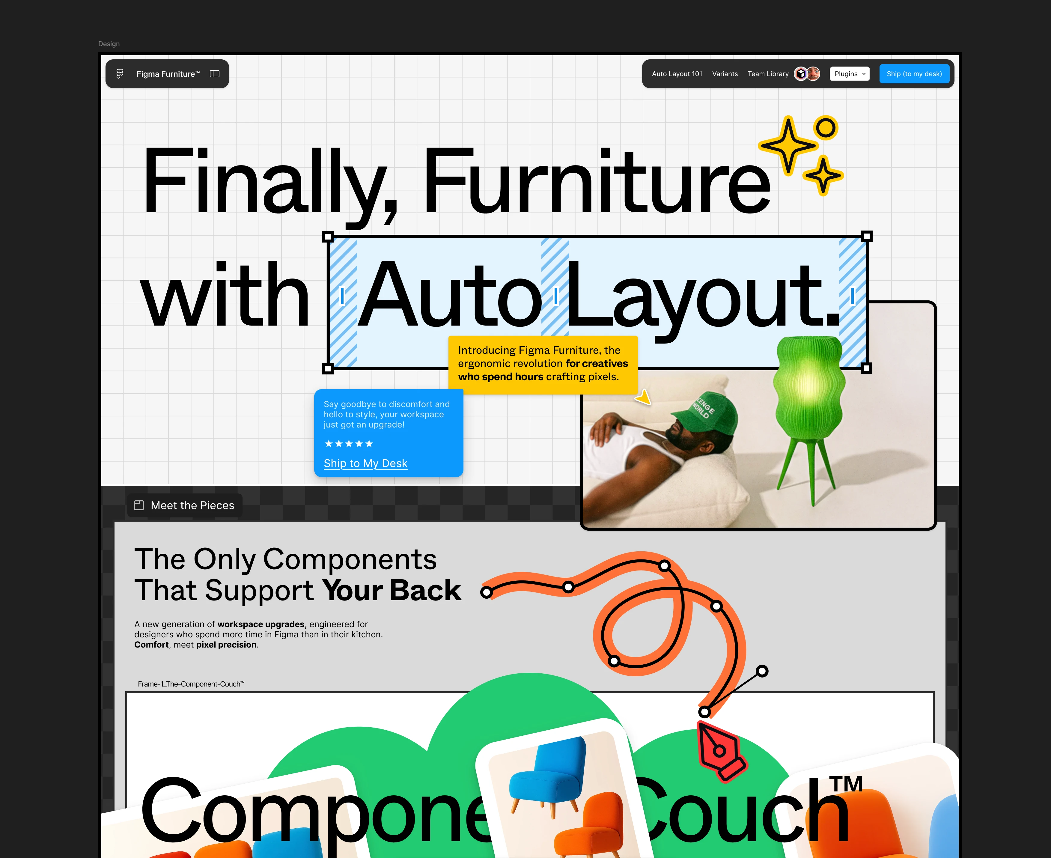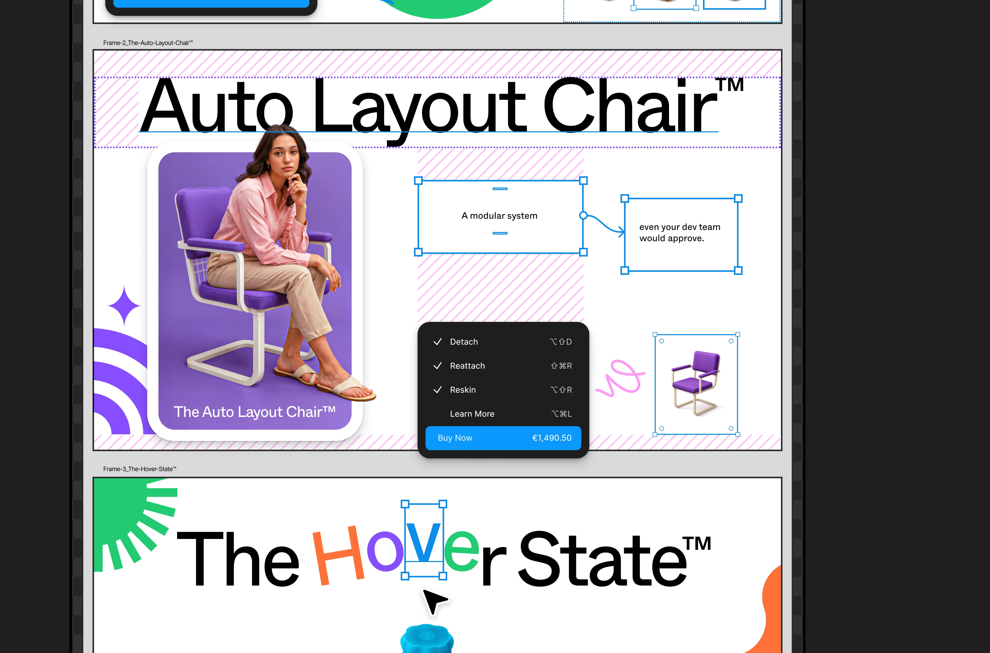 UI as Product: Designed furniture cards that look like Figma frames, complete with "Auto Layout" tooltips and "Detach Instance" warnings as playful product features.
