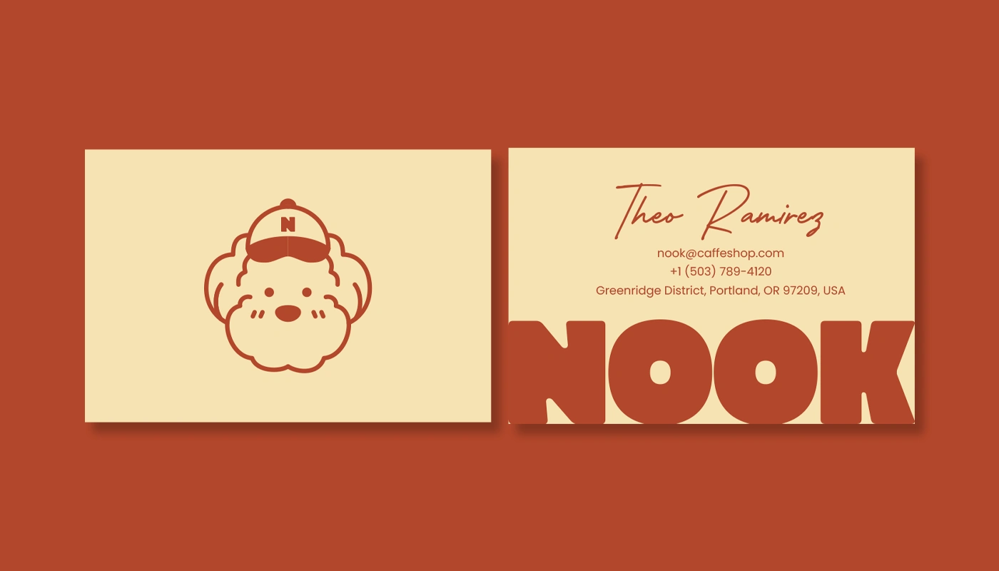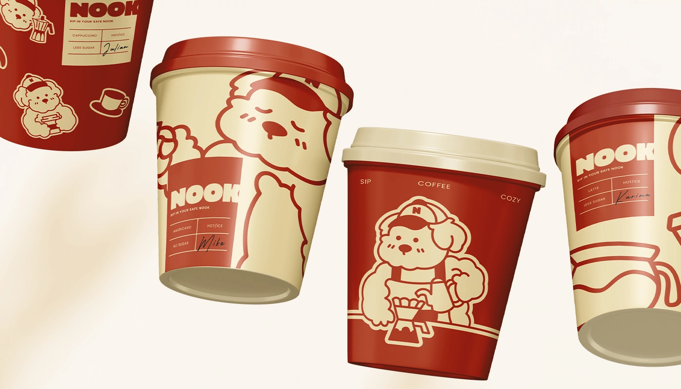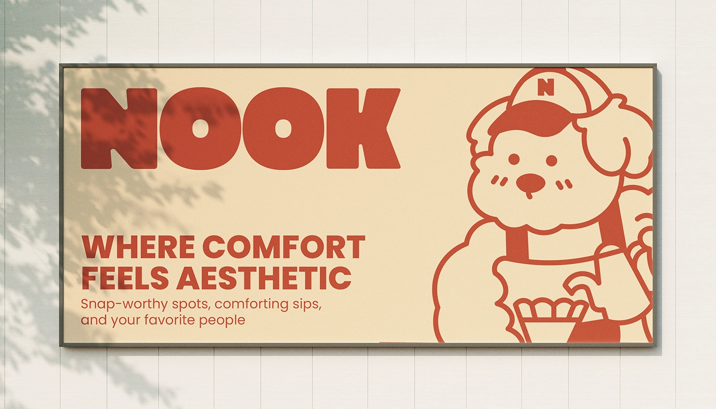Nook is a cozy coffee shop brand designed to bring warmth, charm, and a touch of playfulness into every cup. The brand centers around a lovable dog mascot