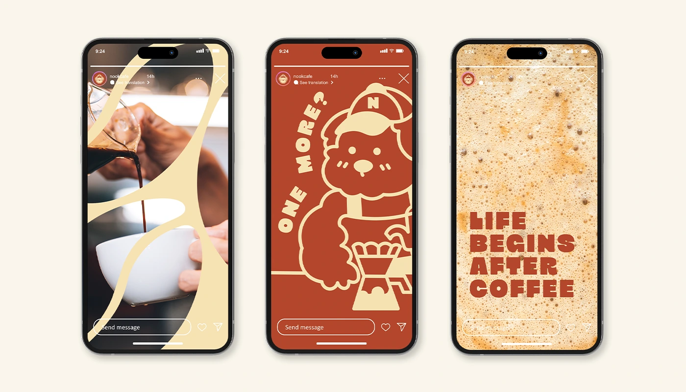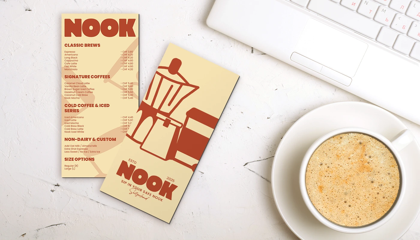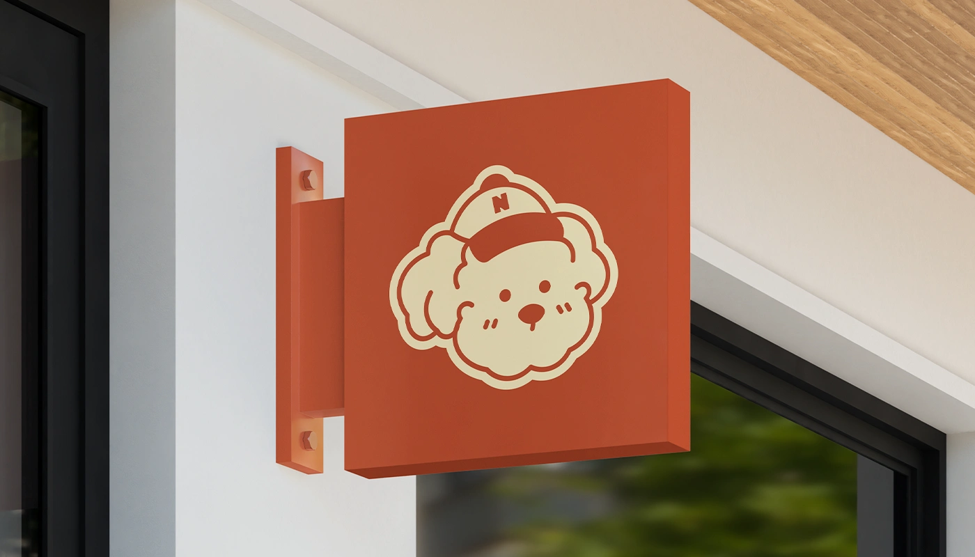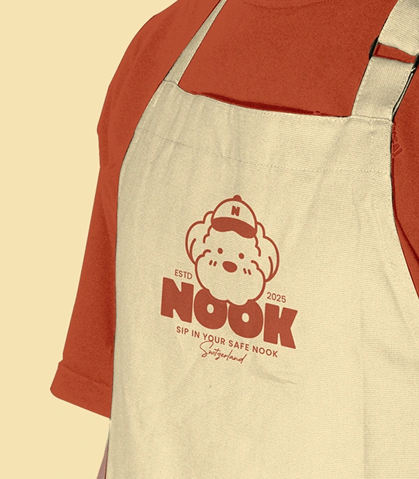 Nook is a cozy coffee shop brand designed to bring warmth, charm, and a touch of playfulness into every cup. The brand centers around a lovable dog mascot