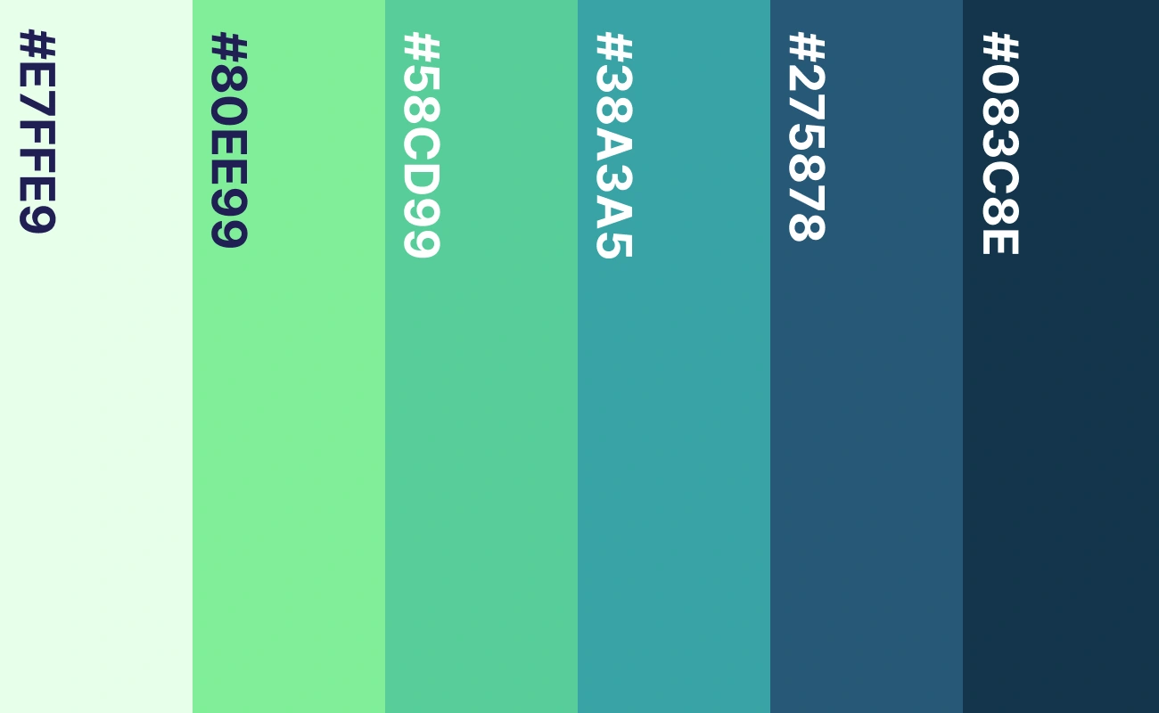 #E7FEE9 Fresh start (new member energy)#80EE99 Early engagement (first connections forming)#58CDC99 Active participation (regular interactions)#38A3A5 Meaningful bonds (relationships deepening)#27587B Trusted community (strong network built)#083C3E Deep impact (transformative mentorship)