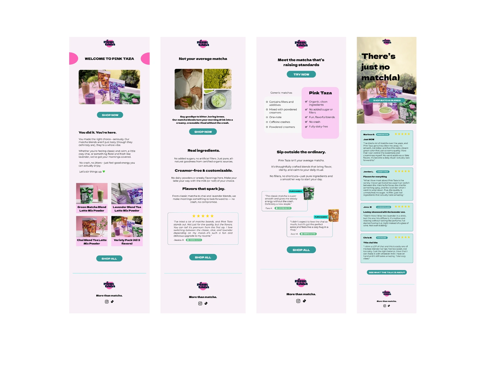 Created a full lifecycle flow for Pink Taza, focused on storytelling, education, and community vibes. Built out welcome, abandoned cart, and post-purchase emails to highlight benefits, rituals, and why their matcha’s worth sipping.