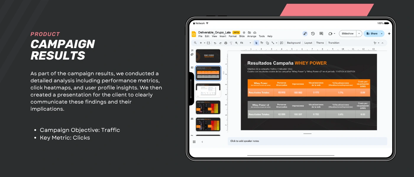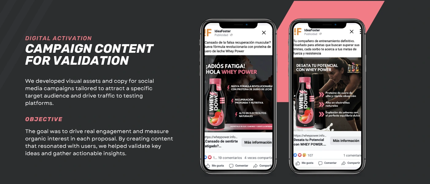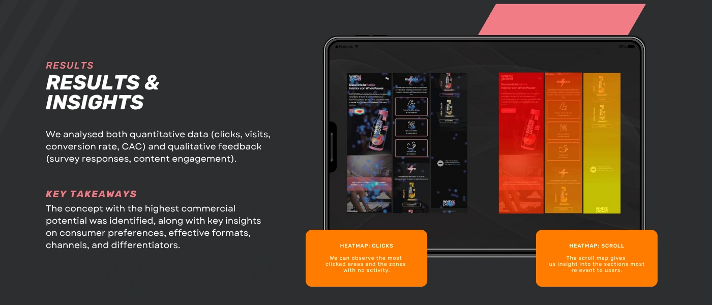 After analyzing interaction data, engagement metrics, scroll behavior, and user responses, the concept with the best performance was identified: a protein drink that stood out for its ingredient transparency, functional effectiveness, and authentic visual appeal.