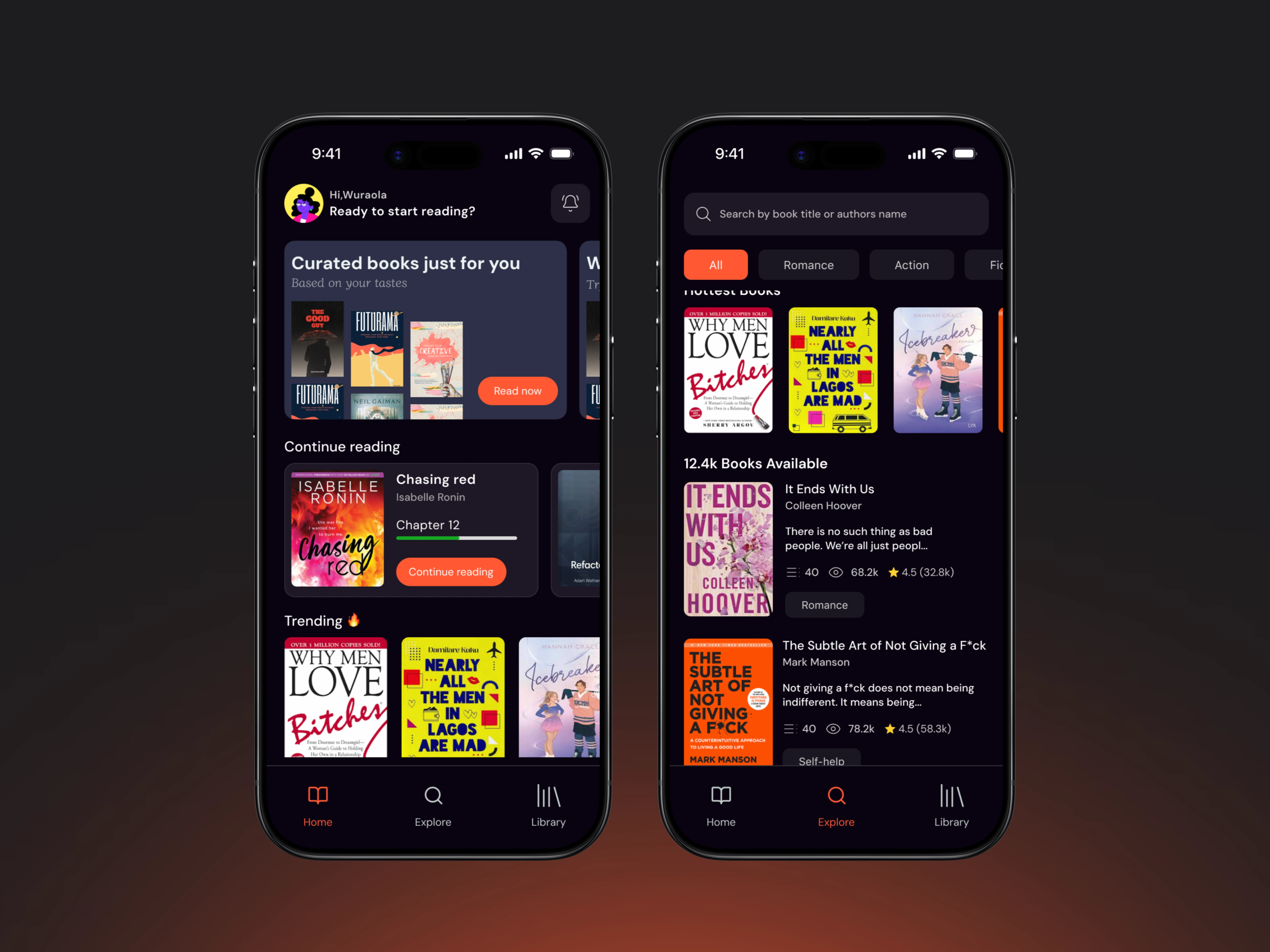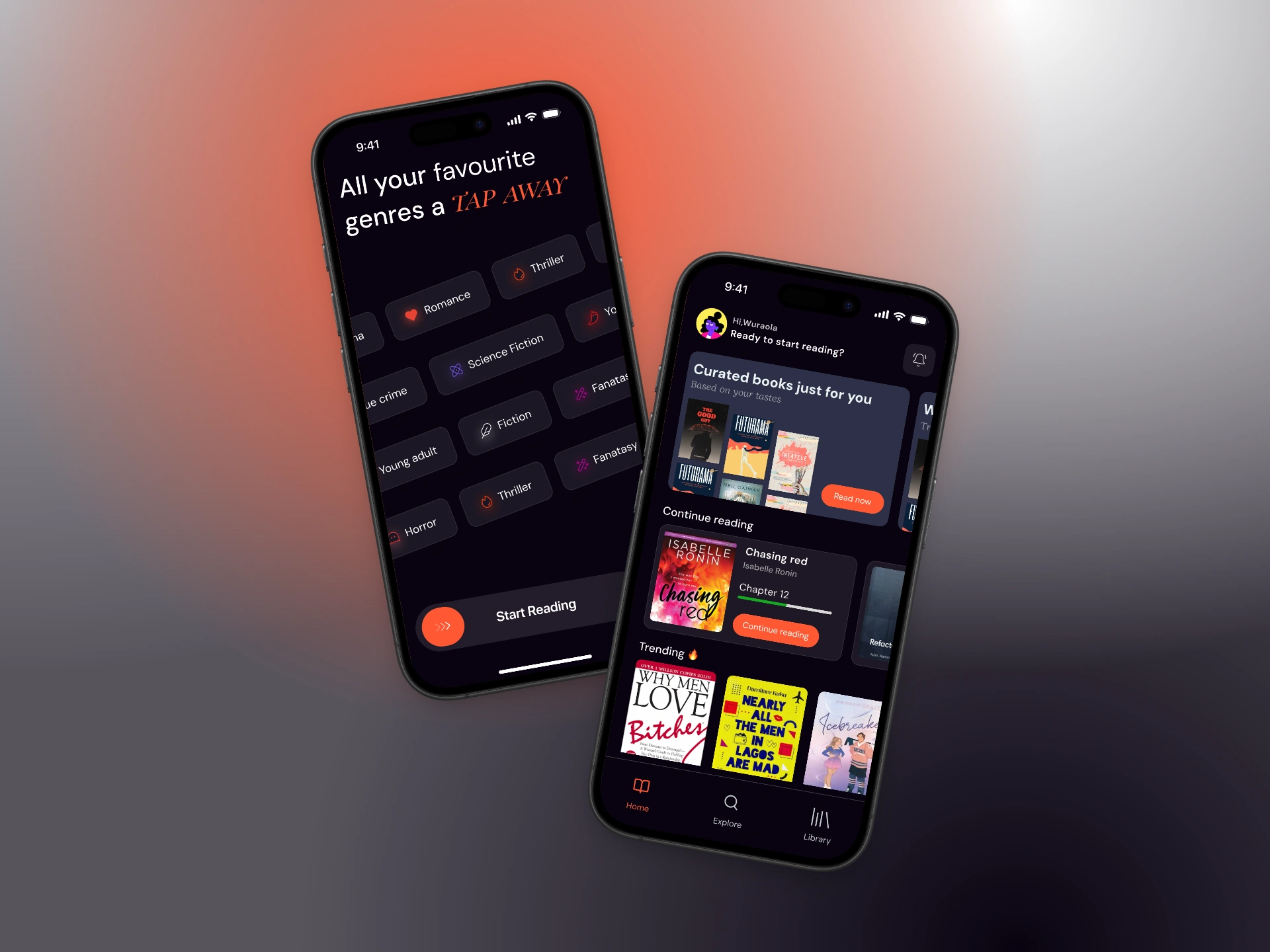 A self-initiated reading app concept focused on calm, genre-first discovery and immersive reading, designed without ads, or unnecessary distractions.