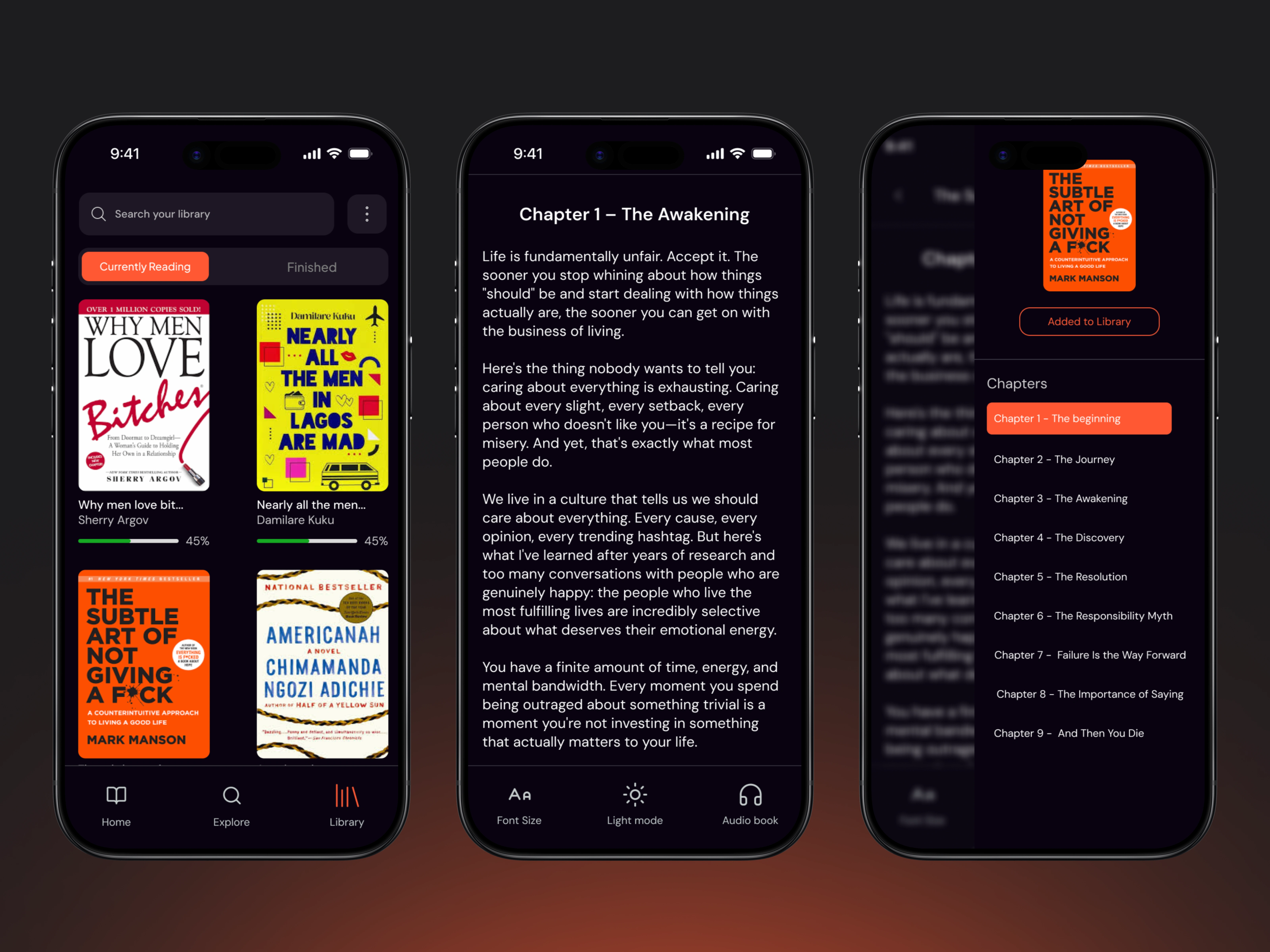 Instead of long synopses, preview snippets are used throughout the experience to help readers connect with a book’s writing style before committing to it. The reading interface is designed for comfort and immersion, with customizable font size, themes, bookmarks, and chapter navigation, while keeping distractions hidden.