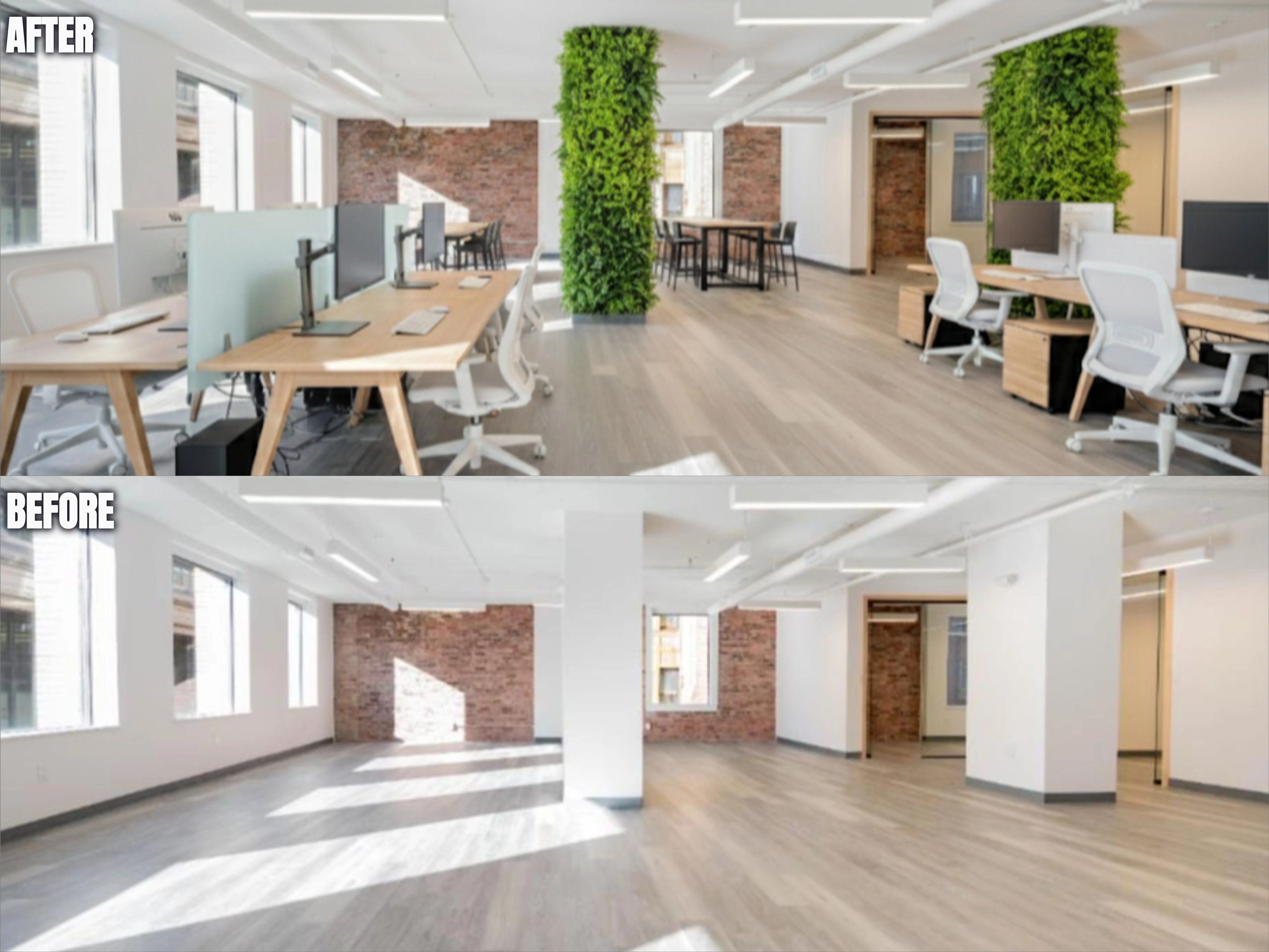 The Vision: This Commercial Virtual Staging project was designed to solve that exact problem. The vision was to create a vibrant, functional, and aspirational workplace that appeals to modern companies. We showcased an open-plan layout with ergonomic workstations, collaborative zones, and integrated biophilic design through prominent living walls to signal a commitment to employee wellness.