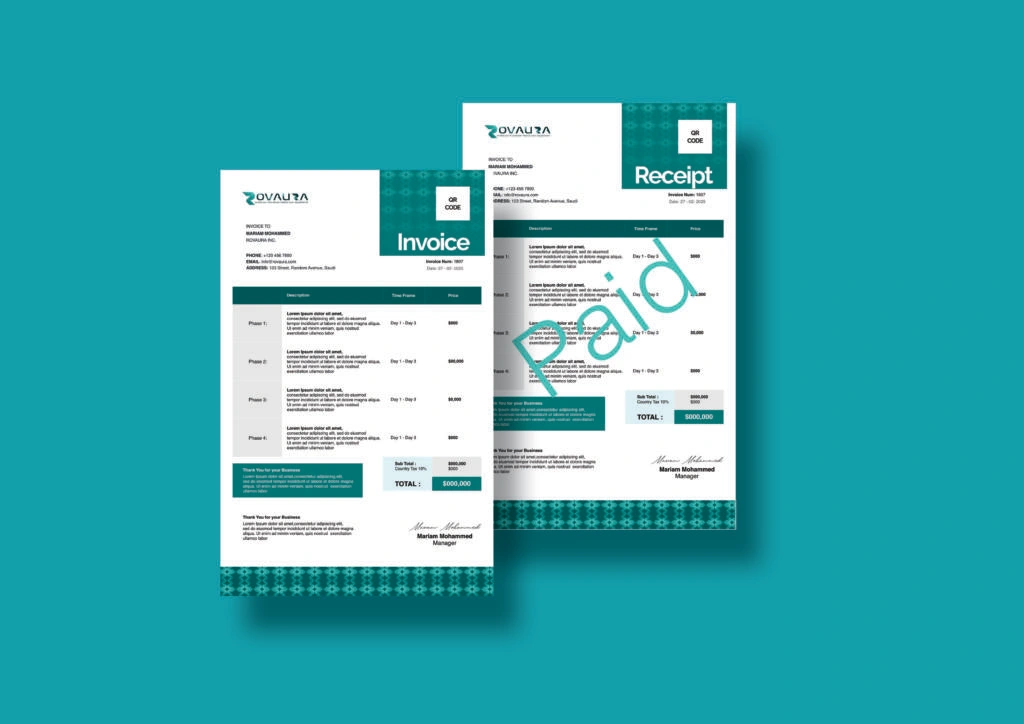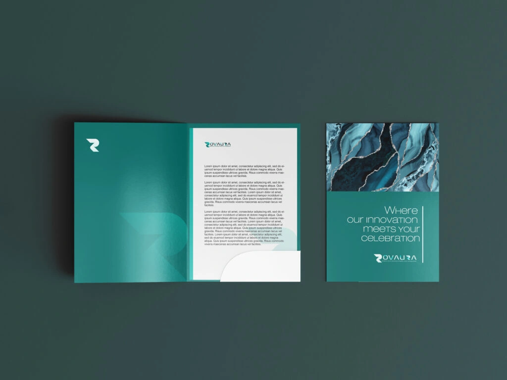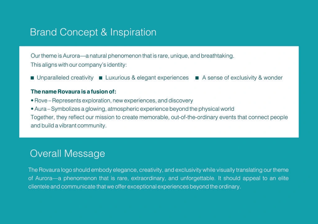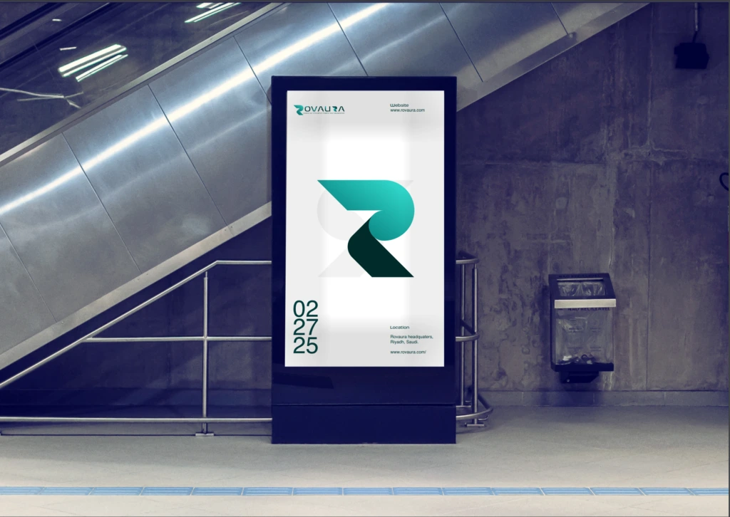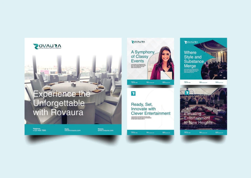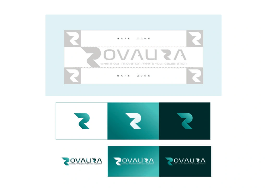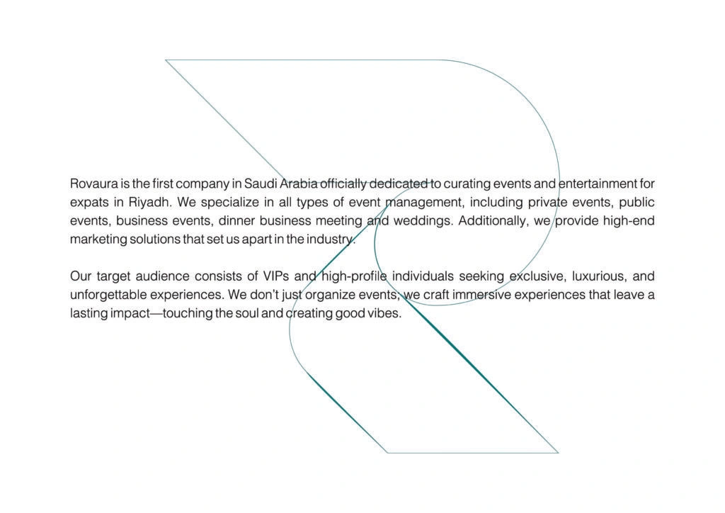 Visual identity design for Rovaura, Saudi Arabia's first event curation company for expats, featuring modern branding for events and entertainment.