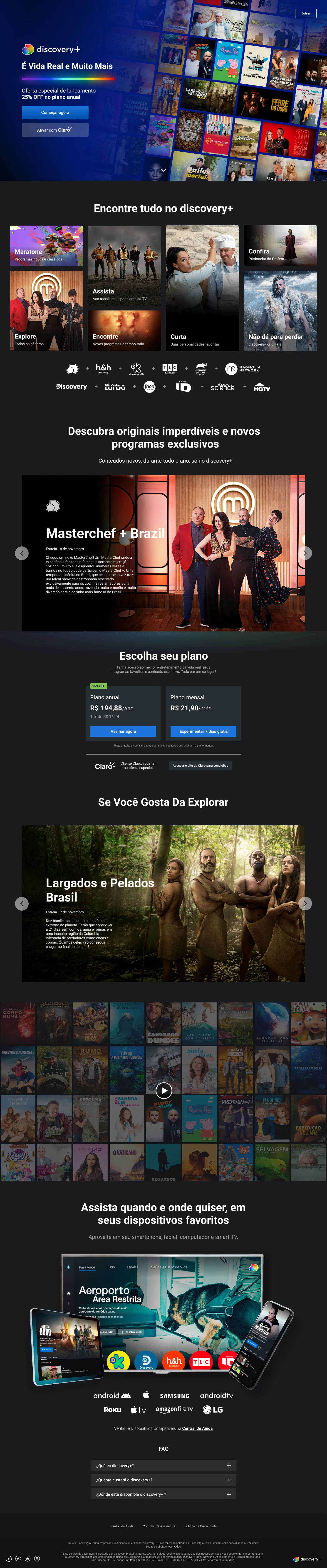 Landing Page for Discovery Plus Brasil. Streaming and Entertainment.