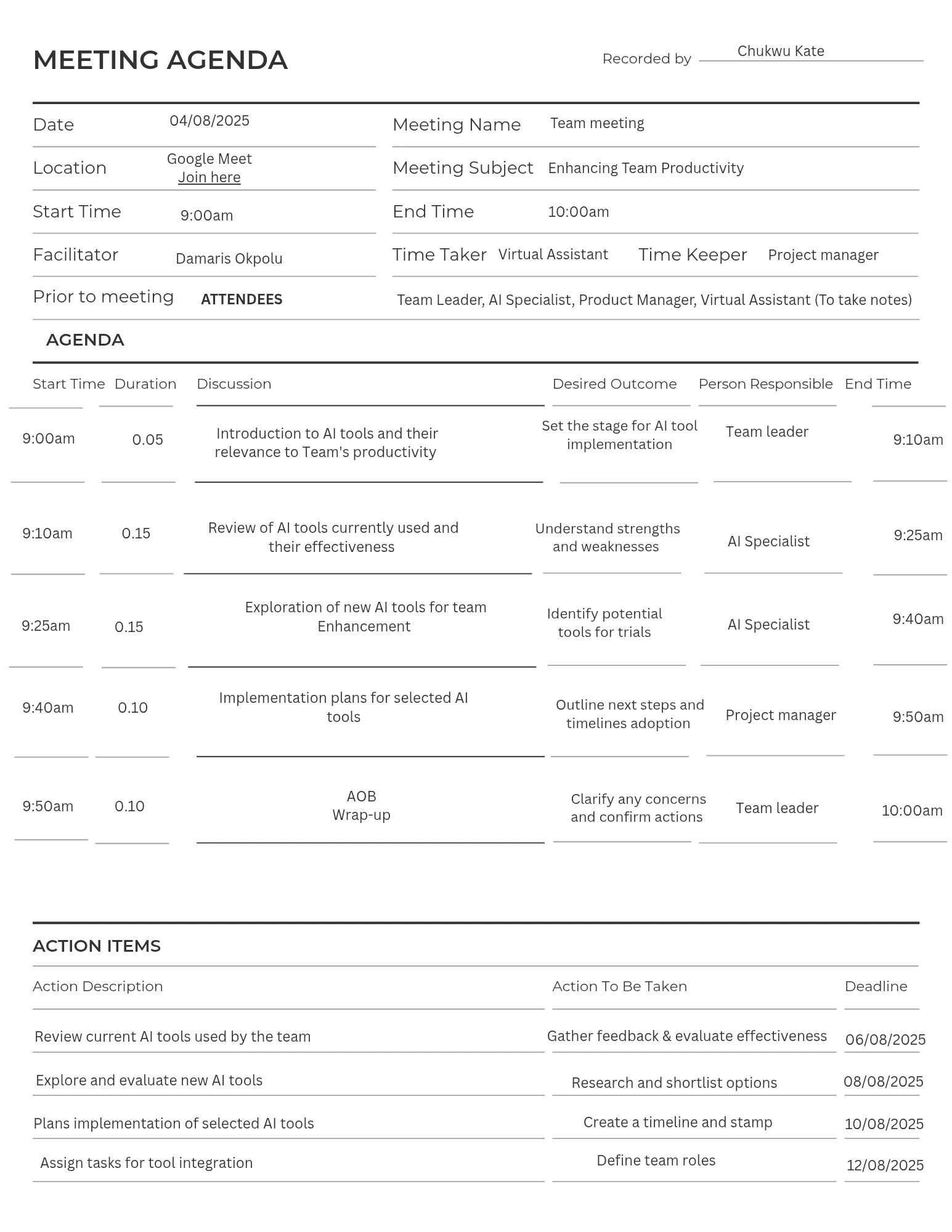 In this Meeting Agenda : Challenges were addressed, action items agreed and announcements were made. Improved alignment was achieved and problems were solved.