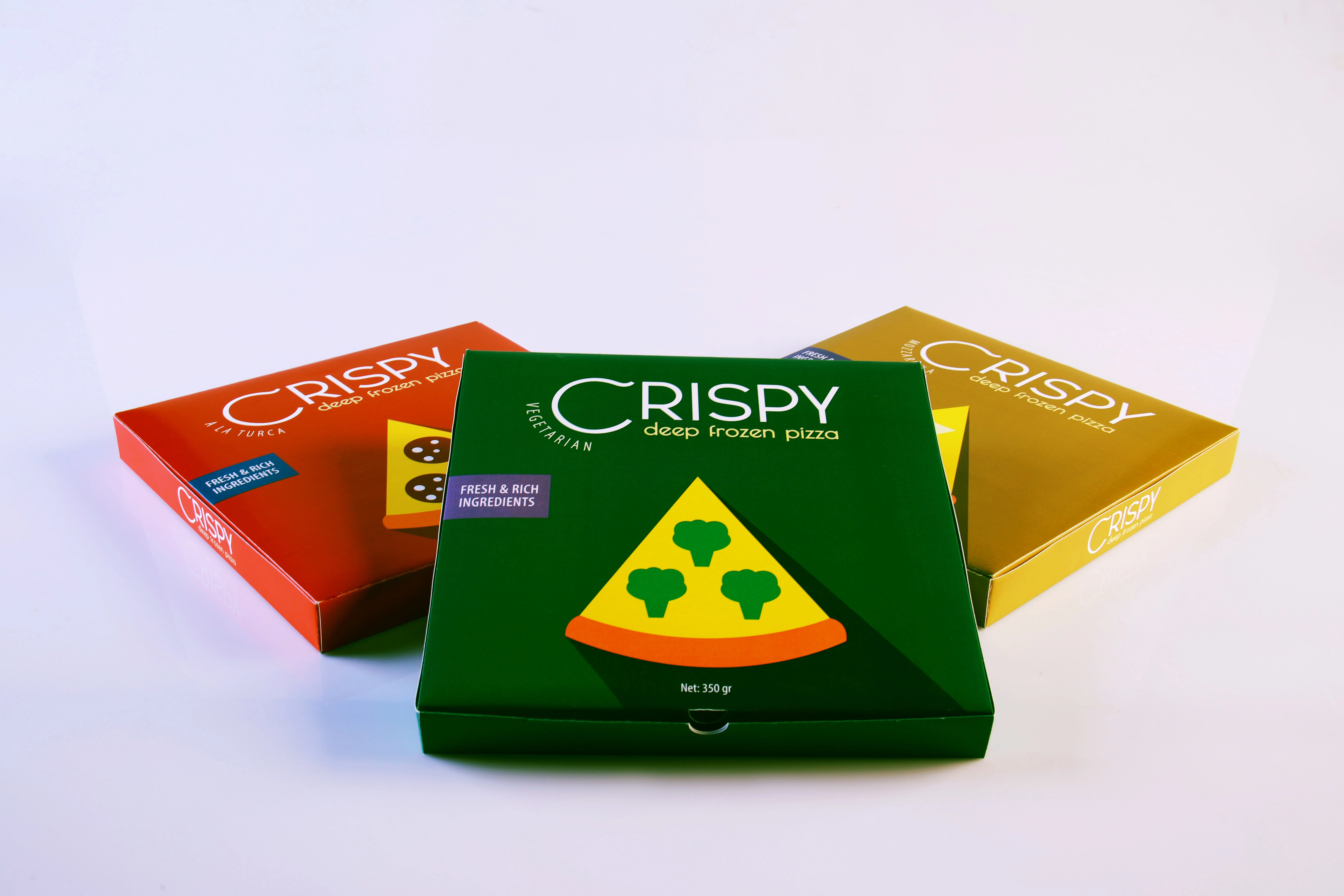 A set of pizza boxes and logo designed for Crispy. Each box was created for a different flavor — Vegetarian, Ala Turca, and Mozzarella — using clean visuals to enhance clarity, recognition, and brand consistency.