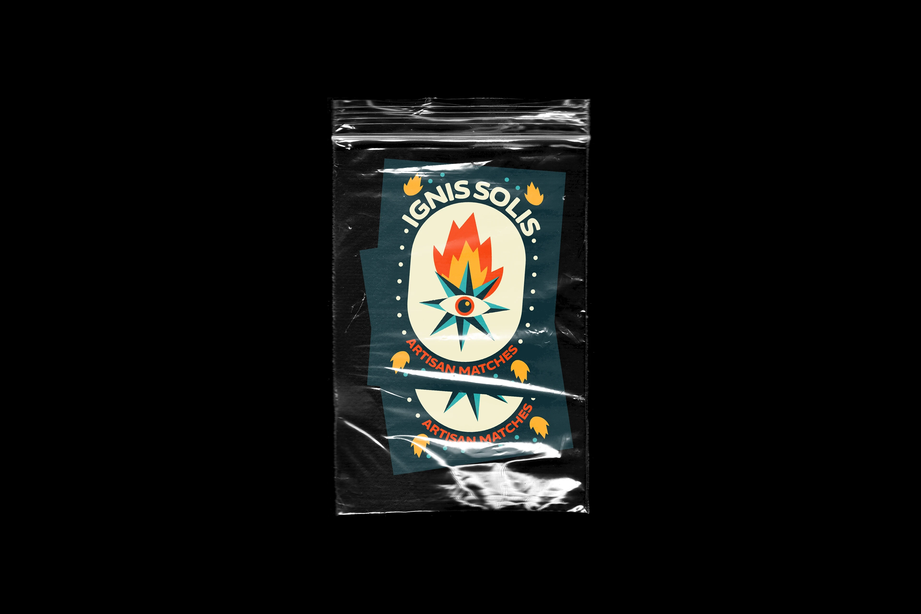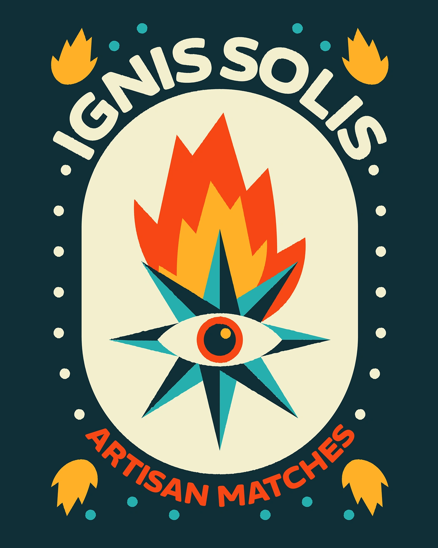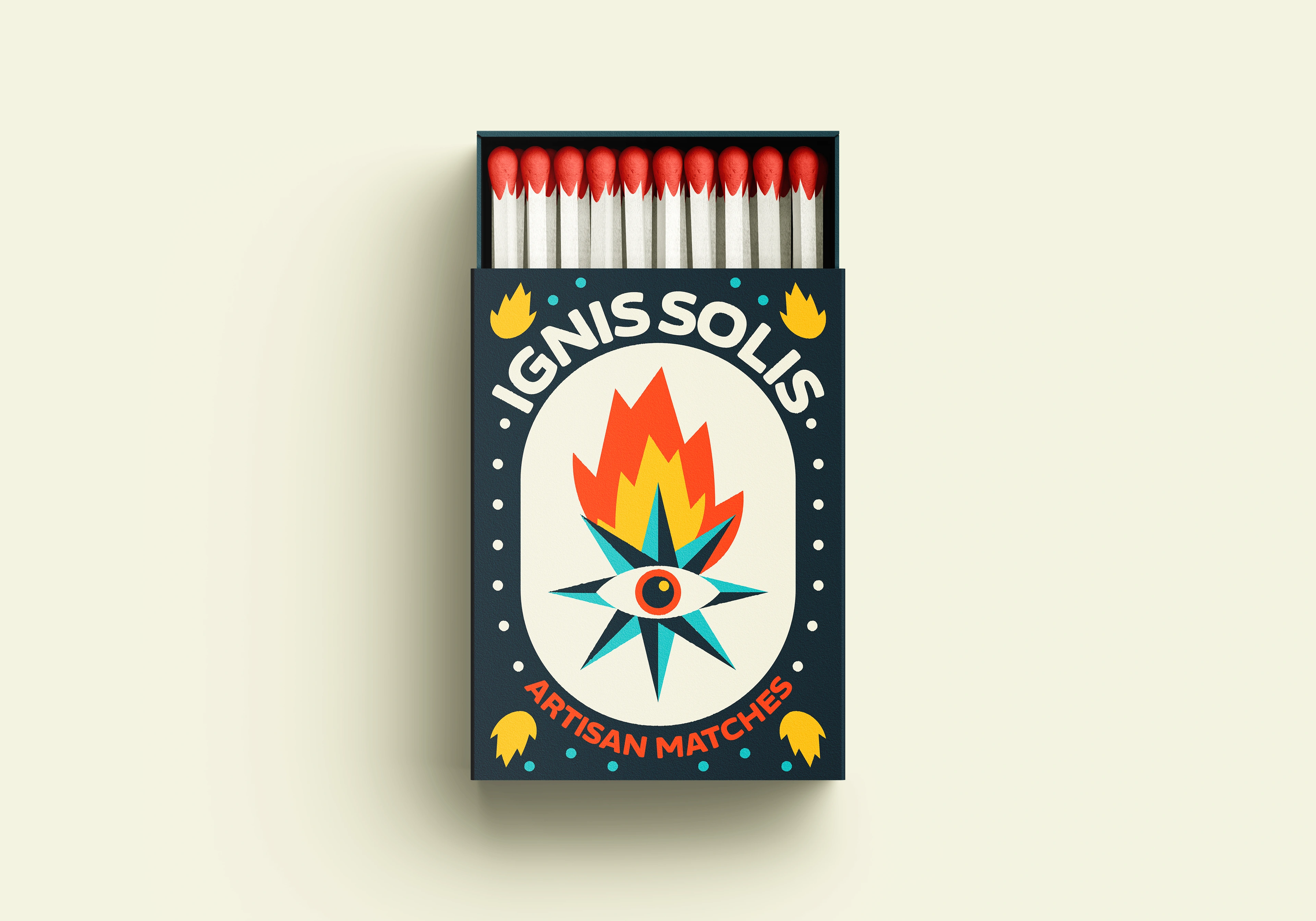 This packaging blends vintage, mystical aesthetics with a vibrant, modern color palette to elevate a common household item into a desirable artisan product. The deep navy background paired with striking red, orange, yellow, and turquoise makes the packaging highly shelf-appealing, while the stylized, curved typography maintains a handcrafted, premium feel.