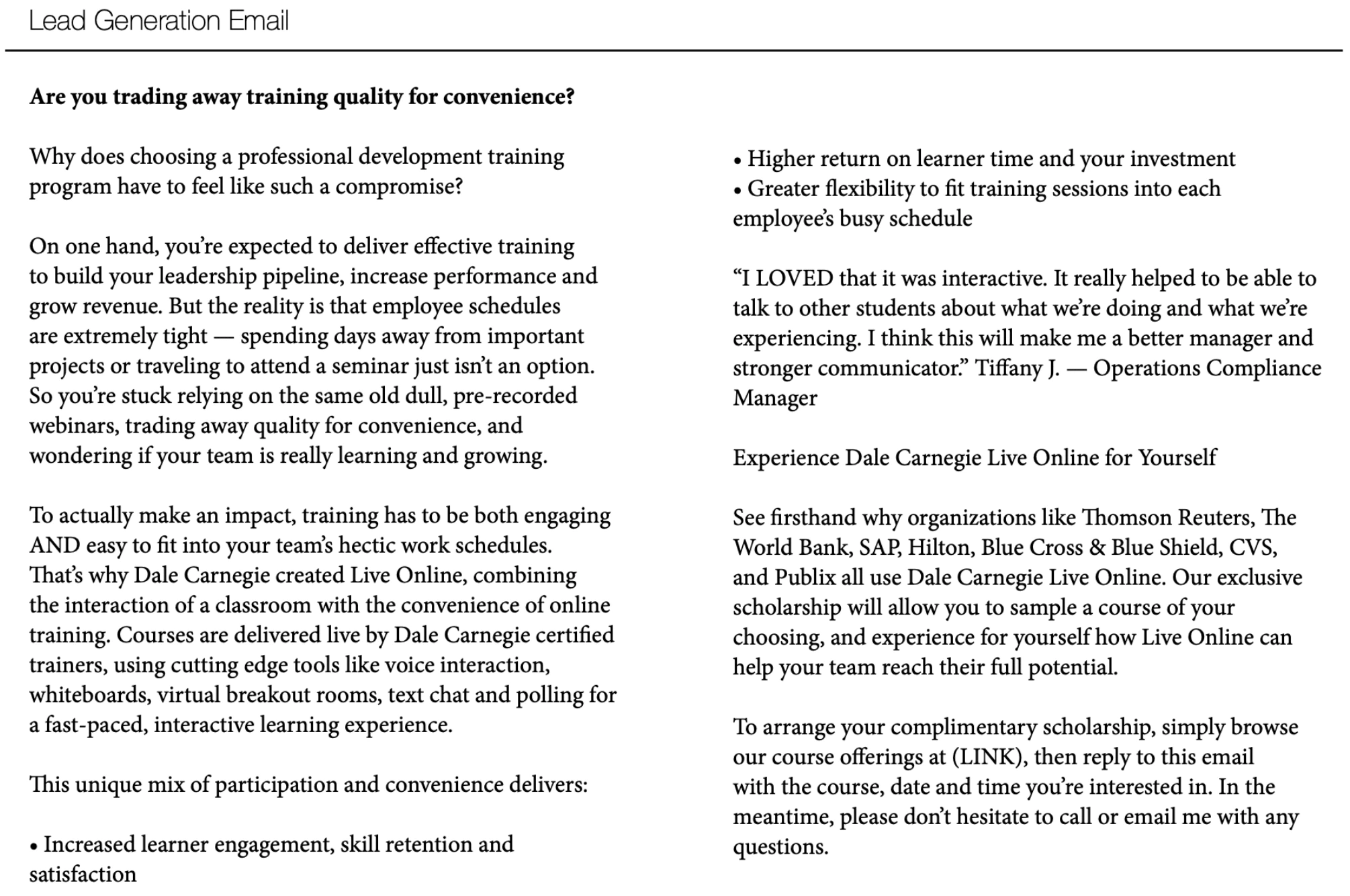 Email campaign for corporate training product.