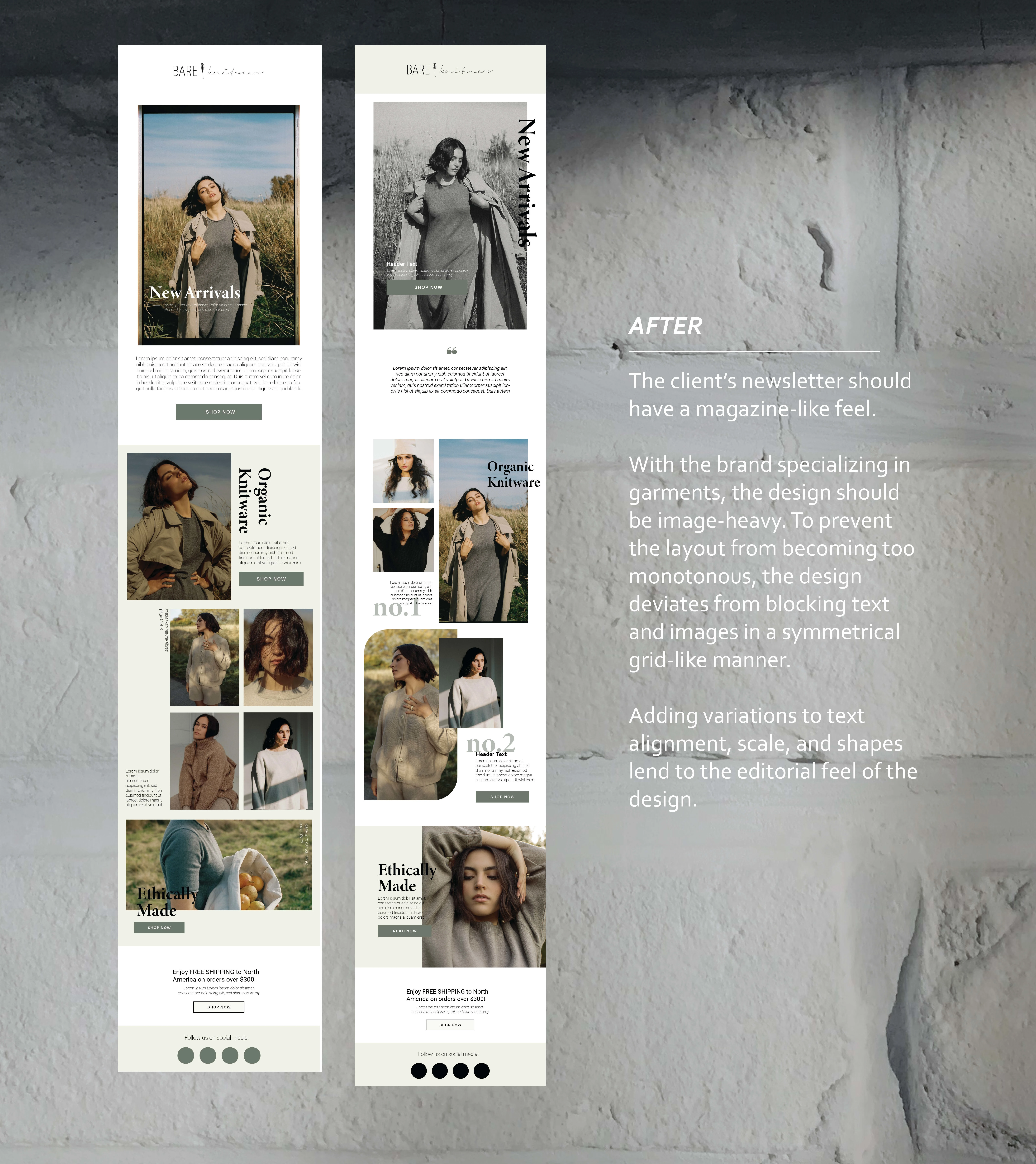 I was assigned to design two newsletter templates for Bare Knitwear. The goal was to create a visually appealing layout to help showcase their products. This project was created during my time working at Founded in Beauty.